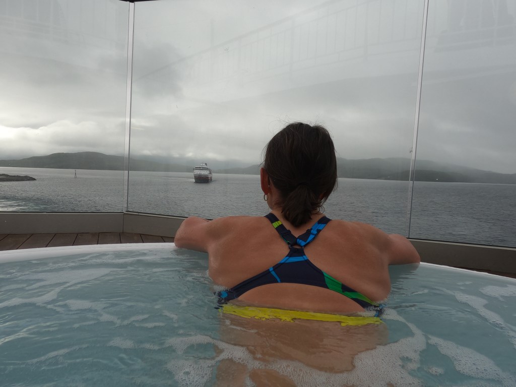 Heute haben wir mal das volle Programm ausprobiert. Morgens nach dem Frühstück in den Whirlpool auf Deck. Dann Sightseeing auf Deck und während des Stopps in Tromsø nachmittags auf Hiking-Tour auf den Aussichtsberg Fjellheisen. Alles aber ohne das schiffseigene „Expeditionsteam“. Und ohne horrende Zusatzkosten, wandern geht auch ohne Guide. So konnten wir den Blick nochmals genießen, wie auf unserer Lofotentour vor einigen Jahren.