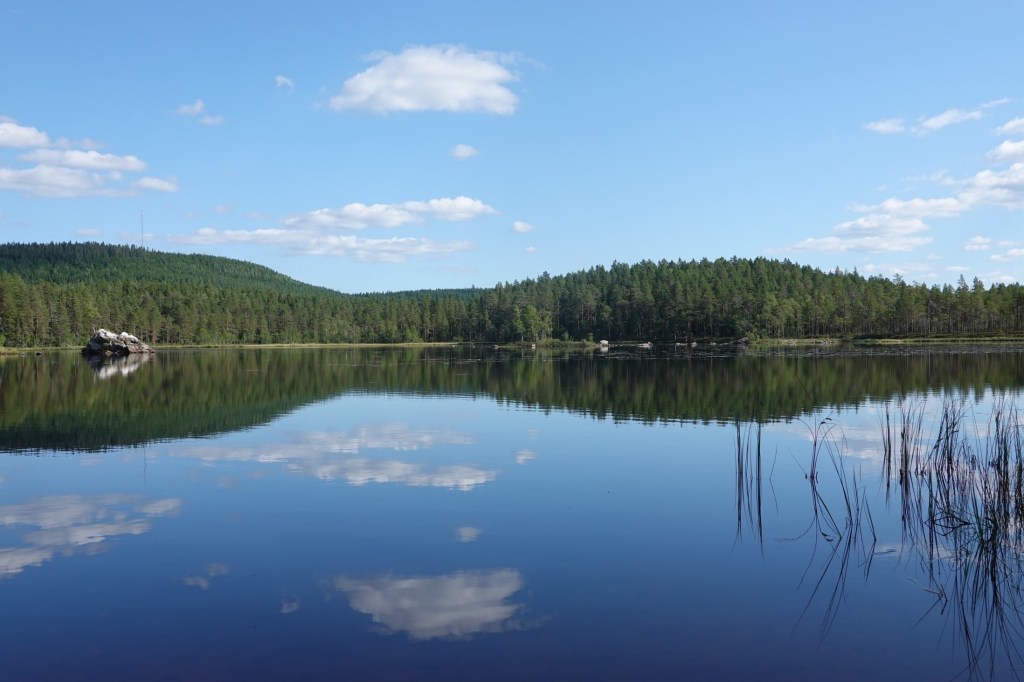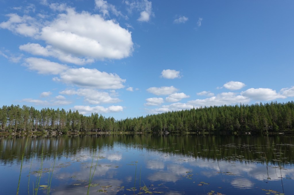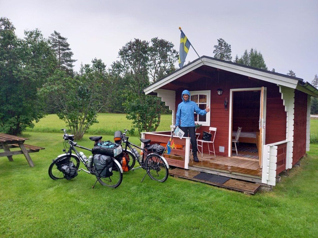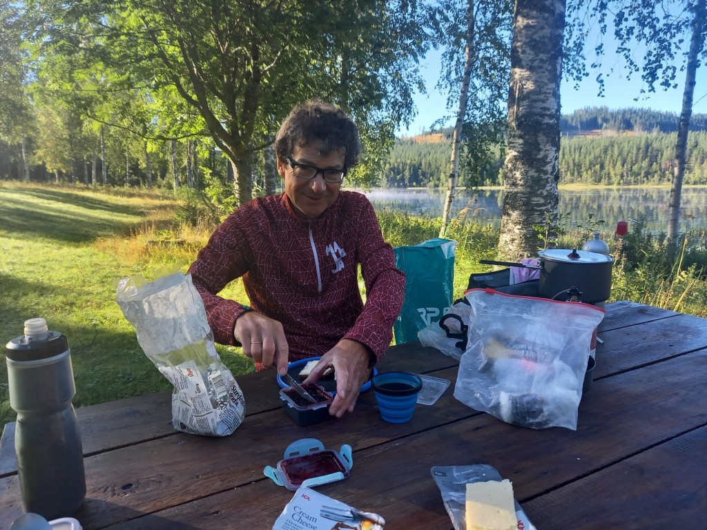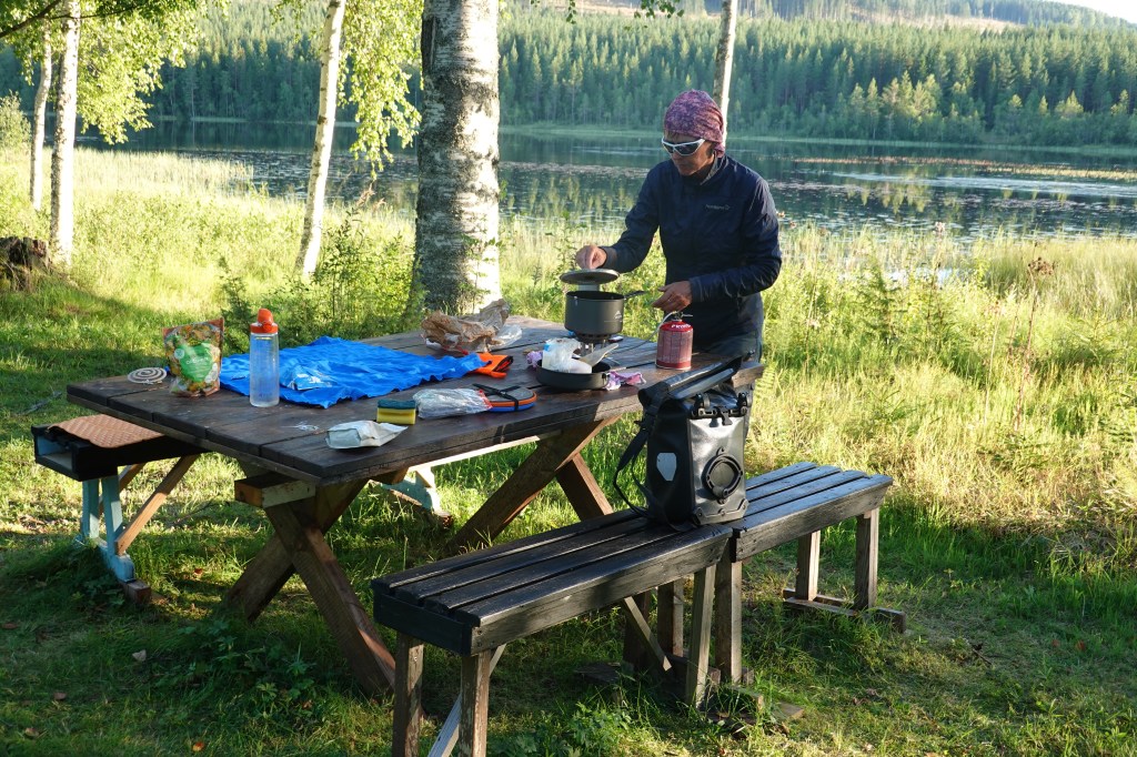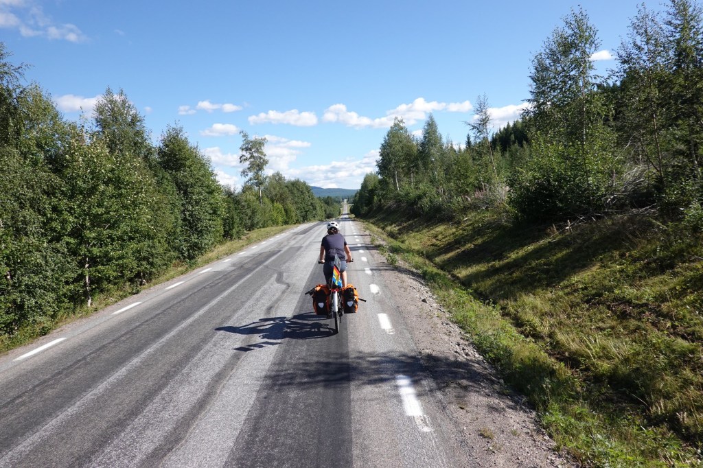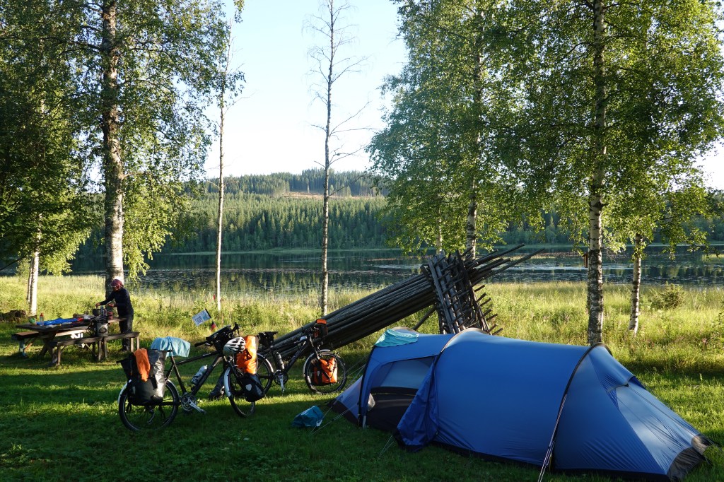 Wir fahren durch Niemandsland. Es gibt keine Ortschaften und auf auf einer Strecke von 100km keinen einzigen Supermarkt. Wir haben sicherheitshalber Notproviant eingekauft. Die Anstrengung wird belohnt. Die Landschaft ist traumhaft. Wir fahren eine Höhenstraße mit weiten Ausblicken über Berge, Moore und Seen. Ein Angler an einem Bergsee erzählt uns von Bären, die es hier in großer Zahl geben soll. Er überlegt, ob er es wagen soll, in dem Shelter am See zu übernachten. Einen Fisch hat er noch nicht gefangen, es gäbe nur einen und der wäre mitten im See. Ein lustiger Schwede. Wir kämpfen uns weiter die steilen Anstiege hoch. Im einzigen Ort auf der Strecke mit zehn Häusern bitten wir einen Anwohner, unsere Trinkflaschen aufzufüllen. Am benachbarten See finden wir einen Übernachtungsplatz. Morgen geht es weiter durchˋs Niemandsland.