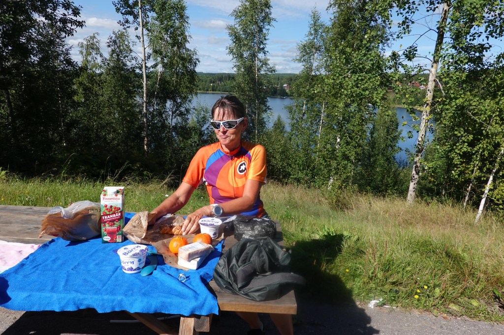 Nachdem wir in unserem Millionen-Sterne-Domizil nur ein mageres Notproviantfrühstück hatten, gibt es auf dem nächsten Berg ein zweites Beerenfrühstück. Also doch Sterne-Hotel: die Milchstraße am nächtlichen Himmel war so atemberaubend, wie wir sie nur im Hochgebirge oder in der Wüste gesehen haben und das Obstbuffet ist reichhaltig. Bis zum nächsten Supermarkt in ca. 30 km Entfernung schaffen wir so auch alle Anstiege, auch den bisher höchsten Punkt unserer Tour auf 400m. Das erscheint nicht sehr hoch, doch für schwedische Verhältnisse ist es das schon. Es gibt viele Snowscooter-Wege im Winter. Und Ausblicke über die bewaldeten Berge. Über eine Höhenstraße mit ungewohnt gutem Belag geht durch die unbewohnte Wildnis. Sie endet in Svärdsjö. Ab hier gibt es wieder Landwirtschaft und für uns, nach unserem Einkauf, die Möglichkeit eines dritten Frühstücks. Wir haben Hunger wie die Bären. So schaffen wir auch die 10 km Umweg zum heutigen Campingplatz in der Nähe von Borlänge. Der Platz liegt auf der falschen Flussseite.