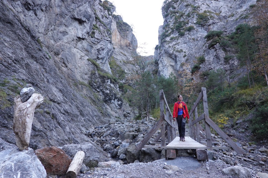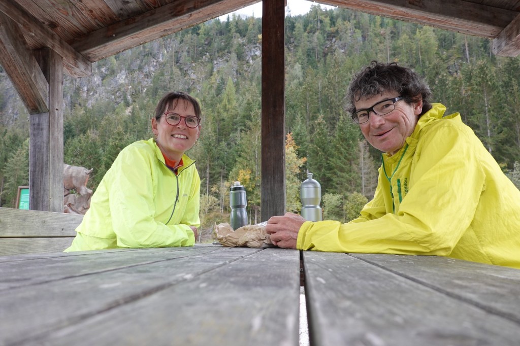 Die blaue Farbe des Flusses hat uns damals schon begeistert. Genauso der Radweg. Er verläuft entweder direkt am Fluss oder nutzt Seitenstraßen ohne Verkehr. Es gibt kaum große Steigungen, obwohl es immer bergauf geht und die Drau eine starke Strömung hat. Genussradeln pur. Und das Wetter passt auch. In Dellach deponieren wir schnell unser Gepäck im Landgasthof. Wir fahren noch mal ein paar Kilometer zurück, ketten die Räder im Wald an und schauen uns die steile Geislochklamm an, die in der letzten Eiszeit entstanden ist. Mittlerweile ist es auch eiskalt und wir fahren zurück.
