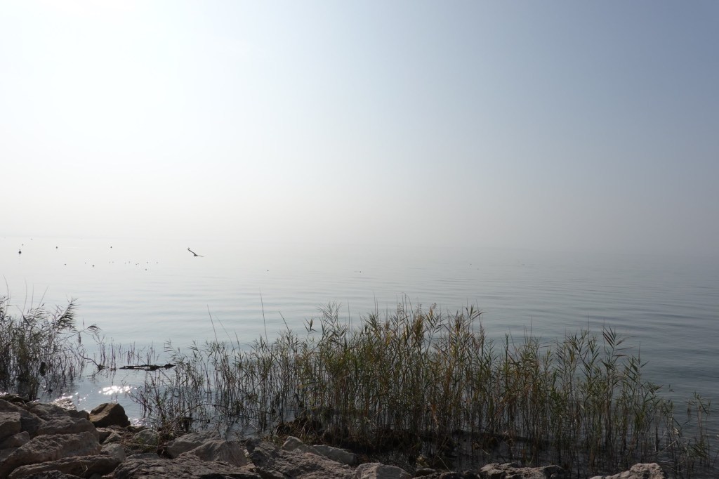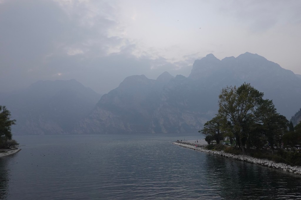 Wir freuen uns auf das Wiedersehen, haben wir doch extra ein paar Tage in den Dolomiten verbracht und warten auch hier noch einen Tag auf unsere Tochter. Nun können wir los. Es ist neblig. See und Berge sind nur schemenhaft zu erkennen. Es weht kein Wind , kein Blatt an den Bäumen bewegt sich. Die unzähligen Surfer, extra in einen der beständigsten Surfspots Europas angereist, sind enttäuscht. Unser altes Surfbrett, vor Jahren auch schon mal hier im Einsatz, hängt zuhause im Keller.
