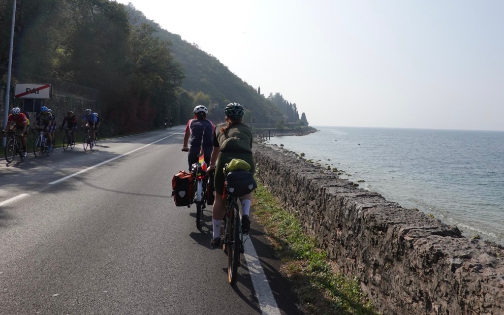 Ein halber Tag seit August ist für unser Wiedersehen etwas kurz. Deshalb will Sarah uns noch am Gardasee entlang bis in die Poebene begleiten. Von dort aus geht es für sie zurück nach Norden über einige Alpenpässe bis nach Freiburg. Und dann mit der Bahn nach Oldenburg. Das Wetter soll gut bleiben, so dass die Pässe noch geöffnet sind.