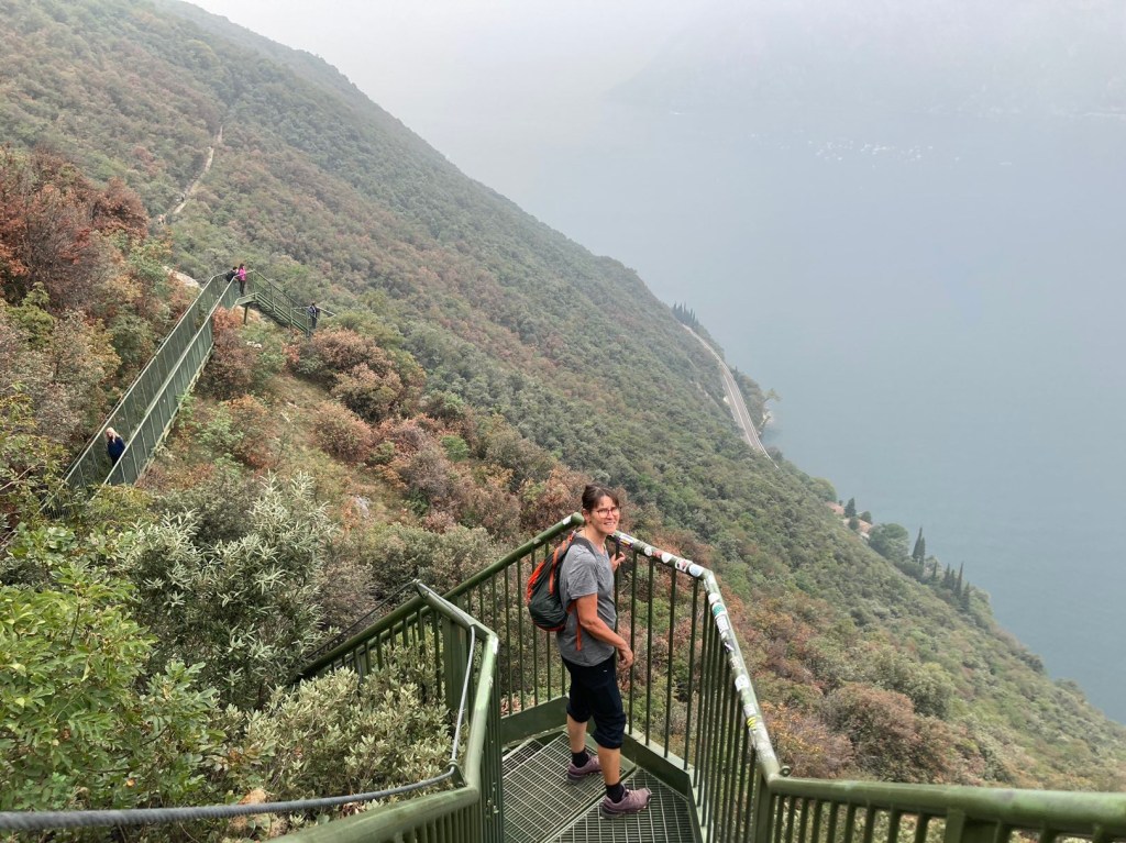 Wir wandern mal wieder. Der Panoramaweg mit seinen spektakulären Stahltreppen lässt das Panorama im Nebel nur erahnen. Trotzdem ist er stark frequentiert. Für den Rückweg wählen wir einen anderen Weg. Ein schmaler Pfad führt uns hinauf am Monte Baldo Massiv. Irgendwann geht es Richtung Torbole bergab. Ein steiler Trail mit losem Gestein. Dauernd rutschen wir aus. Es ist anstrengender abzusteigen als hoch zu gehen. Wir kommen heil in Torbole an. Die letzten Höhenmeter führen über eine Treppe in Goethes Olivenhein. Manchen Mountainbikern kann es nicht steil genug sein. Sie rasen als Gruppe ohne Rücksicht auf Fußgänger die lange steile Treppe hinab. Dabei bietet der Gardasee doch so viele Downhill- Strecken. Wir belohnen uns mit einem ersten Gelato in Italien. Nur noch einmal schlafen bis Sarah kommt.