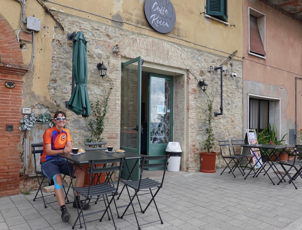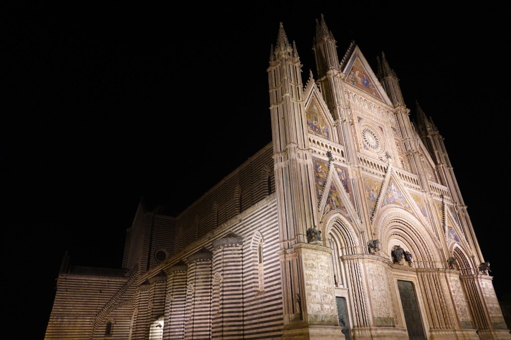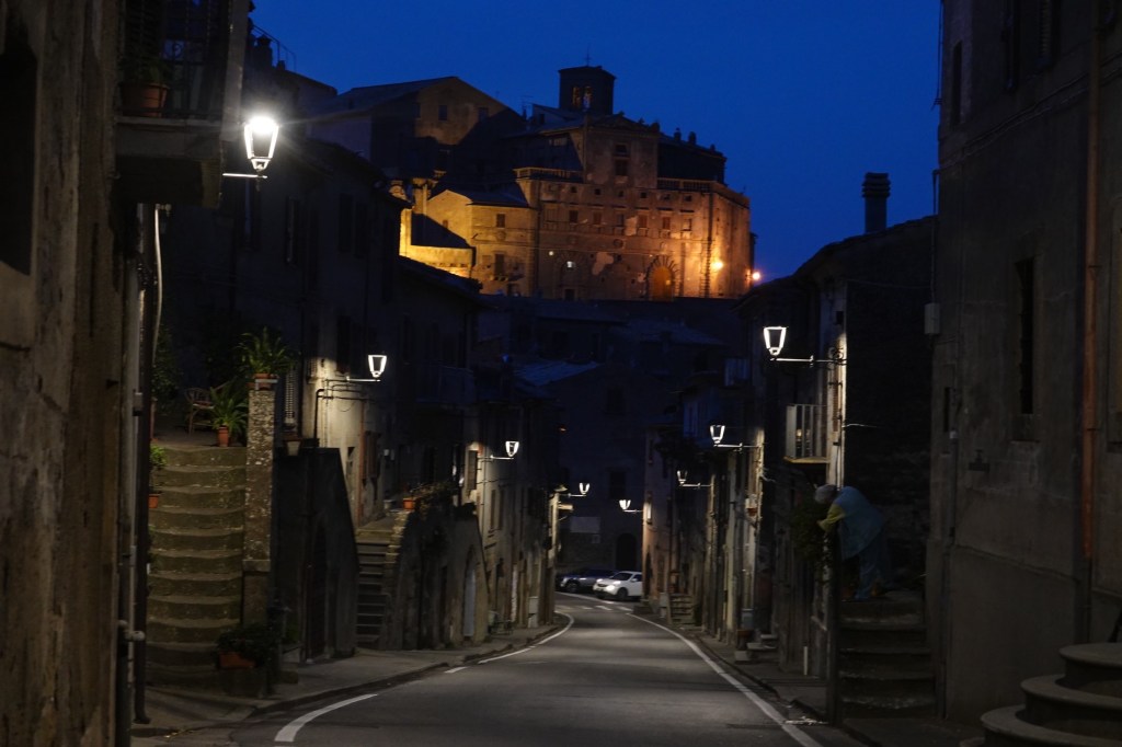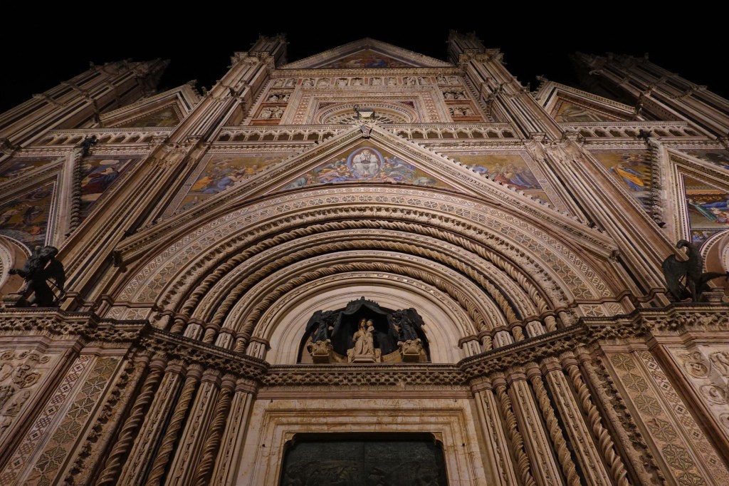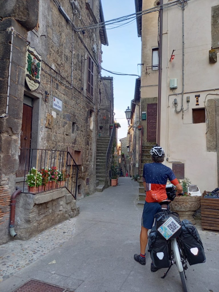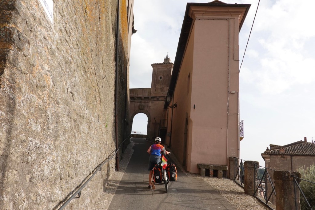 Der Anstieg zu einem Pass bringt Abwechslung. Weniger Verkehr, dafür steil. Wir sind wieder motiviert. Und genießen die Aussicht. In einem Ort auf dem Berg stärken wir uns mit Cappuccino und Gebäck. Und dann kommt doch noch das Highlight des Tages. Nach dem Pass auf 574 m Höhe fahren wir auf einer Panoramastraße bergab. Wir sind begeistert. Es gibt sie, die schönen Straßen in Richtung Rom. Doch zu früh gefreut. Unser Tagesziel Orvieto ist eine historische Stadt auf einem hohen Felsen. Wie kommen wir da rauf? Für Fußgänger gibt es eine Zahnradbahn. Wir nehmen die Zufahrtsstraße, die steil um den gesamten Berg nach oben führt. Die letzten 500m müssen wir über Kopfsteinpflaster in kleinen Gassen schieben. Es ist so steil, dass Sabine mit ihren Radschuhen immer wieder ausrutscht. Unser Apartment mitten im Zentrum entschädigt für das Schwitzen am Berg. Wir besuchen den Dom von Orvieto bei Nacht. Angestrahlt hebt er sich mit seinen grau weißen Steinen in seiner ganzen Schönheit vor dem schwarzen Nachthimmel ab. Ob das Rom noch toppen kann?