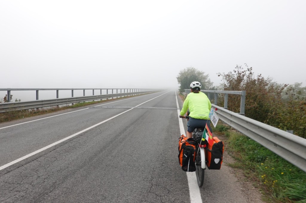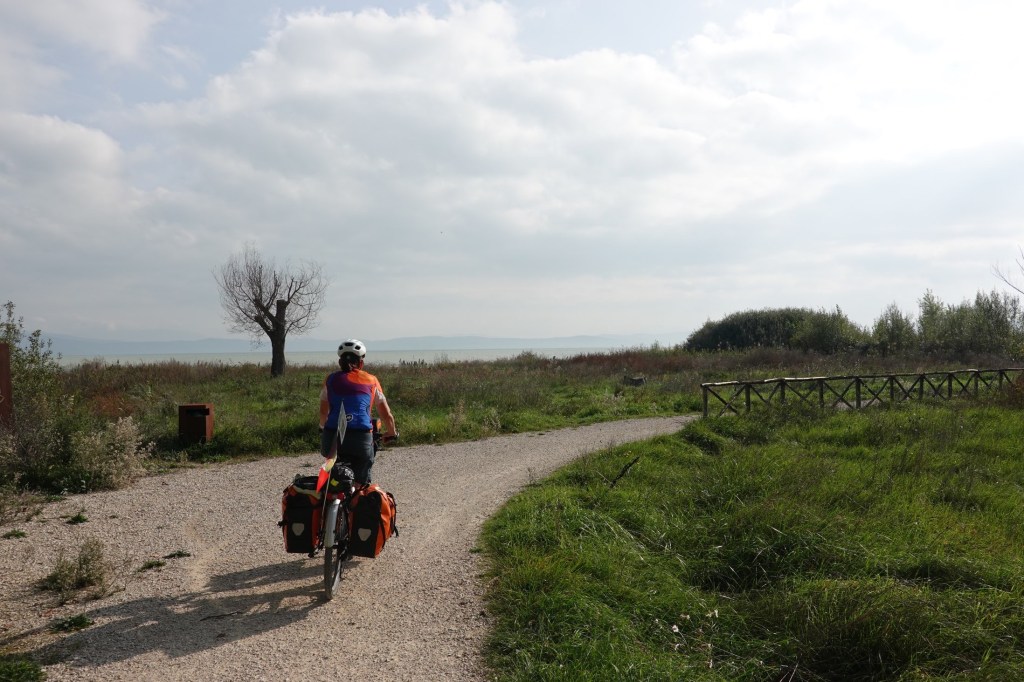Unser Frühstück fällt heute sehr dürftig aus. Gestern war Sonntag. Wir konnten nicht einkaufen. Zwei trockene Brote haben wir uns aufgehoben und für jeden gibt es noch drei Kekse. Der Radweg am Lago Trasimeno ist gut befahrbar. Es geht meist durch Schilf immer am Ufer entlang. Dann müssen wir auf die Hauptstraße. Wo geht es hier bitte nach Rom? Carabinieri weisen uns auf den Radweg auf der anderen Straßenseite hin. Doch es gab keine Auffahrmöglichkeit. Und nun ist er mit einer Leitplanke getrennt von der Straße. Irgendwann können wir rüber fahren, dann ist das asphaltierte Stück auch schon zu Ende. Nach einem Kilometer fühlen wir uns dann etwas veräppelt. Der Radweg hört einfach auf. Die Brücke, die über einen Fluss führen sollte, liegt unfertig auf dem Feld. Sie ist noch nicht montiert. Und dafür haben die Carabinieri uns auf diesen Weg genötigt?