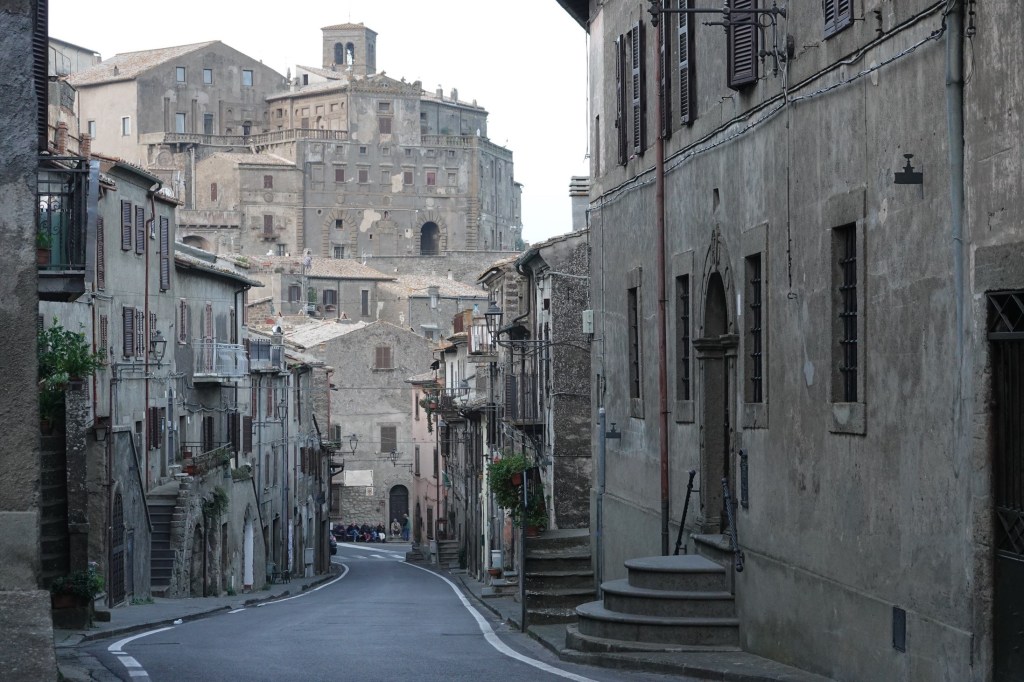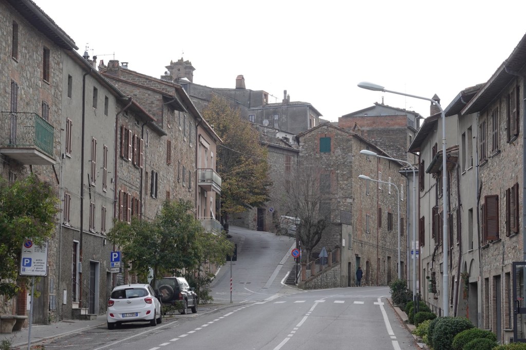 Die Abfahrt ins Tal geht schnell, dann folgt ein unschöner Abschnitt mit viel Verkehr. Wir kommen zum Tiber und zweigen auf eine ruhigere Straße ab. Dafür ist sie die wahrscheinlich die kaputteste Straße von ganz Italien. Schilder weisen extra darauf hin. Man kann eben nicht alles haben. Bomarzo sehen wir schon aus der Ferne. Es liegt ganz oben. Warum wurden nur alle Orte hier auf den Berg gebaut? Und warum haben wir uns wieder ein Ziel ganz oben ausgesucht? Na denn.