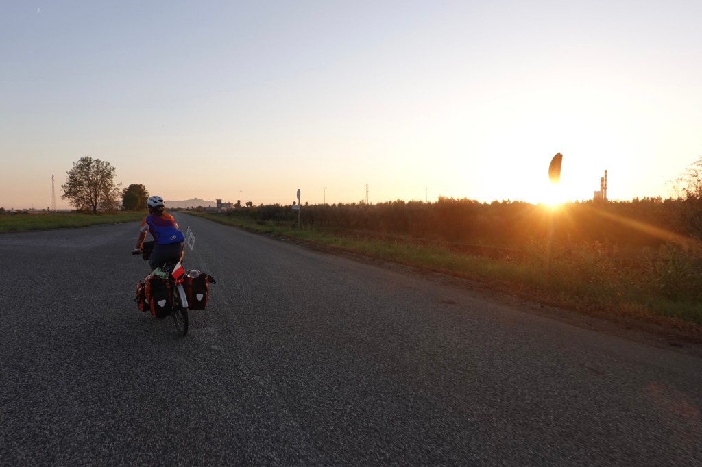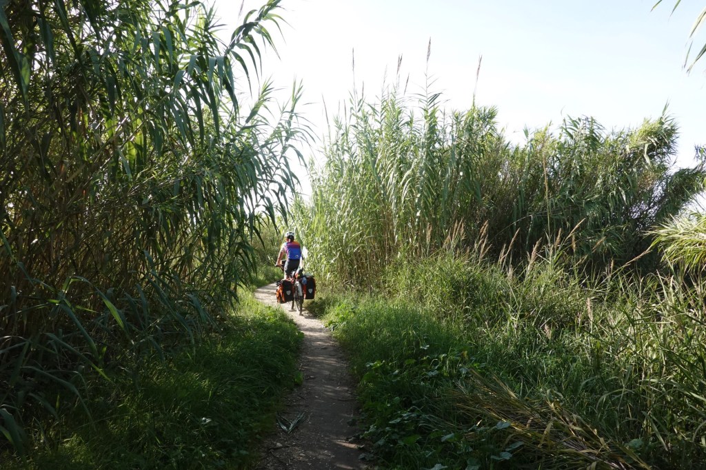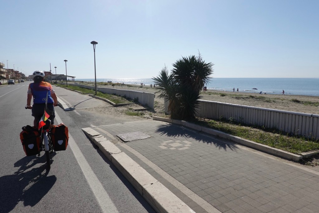 Auf der anderen Seite führt der Radweg in Richtung Mare. Doch es ist nur noch ein holpriger Singletrail über Dämme und durch Schilf. Bis nach Fiumicino auf der für uns falschen Tiberseite. Über 20 km Geholper, aber ohne Autoverkehr und Abgase. Aber auch 20km Umweg. Für die Ausgrabungen in Ostia ist es zu spät. Wir kommen endlich zum Meer. An der Promenade werden wir von älteren Männern angesprochen, die uns zu unserer Reise gratulieren und von ihren Radabenteuern berichten. Auf dem Campingplatz essen wir an der einzigen großen Sitzgelegenheit zusammen mit einer französischen Familie zu Abend. David und Nathalie sind zusammen mit ihren kleinen Kindern ein Jahr mit dem Wohnwagen in Europa unterwegs. Wir kramen unser Französisch hervor und verbringen einen sehr netten Abend.