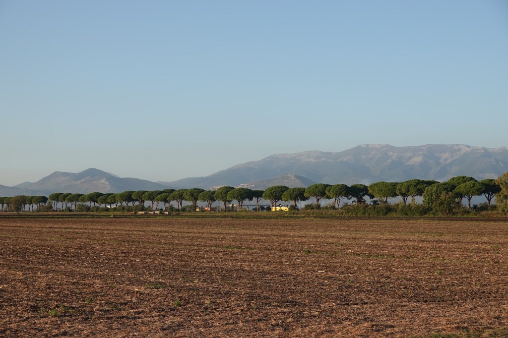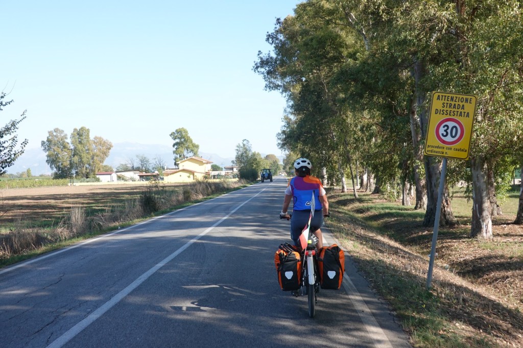 Endlich fahren wir weg vom Meer. Vor Tagen hatten wir eine Straße schon als kaputteste Straße Italiens bezeichnet. Hier sind alle Straßen so. Sabine ruft alle paar Sekunden Klaus, der hinter ihr fährt, (auf saarländisch) zu: Pass uff e Loch. Mit Handzeichen ist das nicht mehr zu machen. Sie hätte keine Hand mehr am Lenker. Die Landschaft und die Orte werden schöner, je weiter wir weg vom Meer fahren. Wir fahren an Kiwiplantagen, Blumenkohlfeldern, Eukalyptusbäumen und riesigen Kiefern vorbei. Die Häuser sind gepflegt und es gibt weniger Müll am Straßenrand. In Pontinia kaufen wir uns Pasticcini, um auch aus der Ferne Sarahs Geburtstag mit Kuchen zu feiern. Den Cappuccino dazu gibt es in der benachbarten Bar. Zwei nette Damen befragen uns auf Französisch zu unserer Tour. Am Rand zu den angrenzenden Apenninen haben wir ein B&B gebucht. Nach 100 holprigen Kilometern bei 30 Grad genießen wir die Dusche.