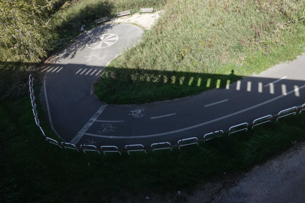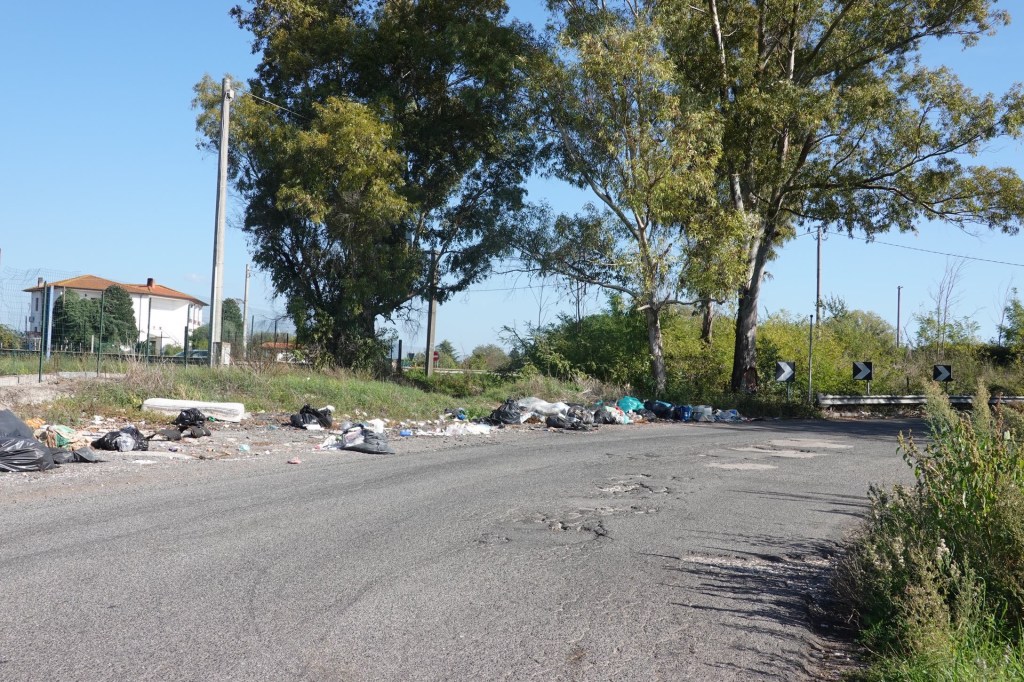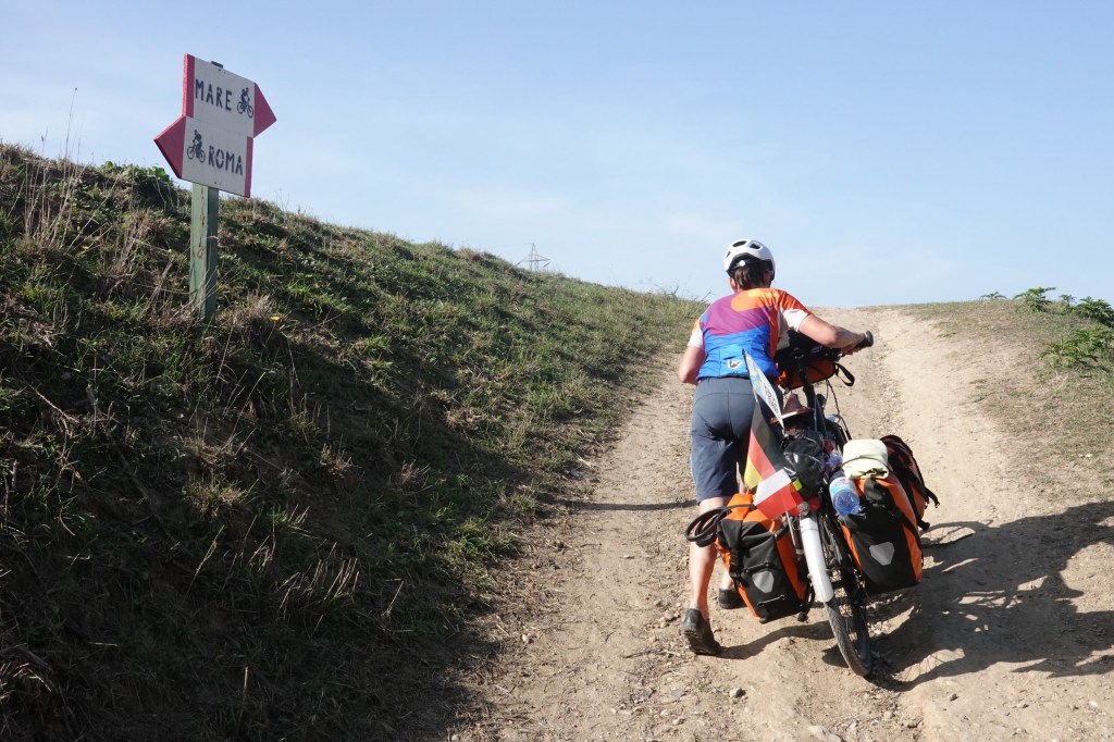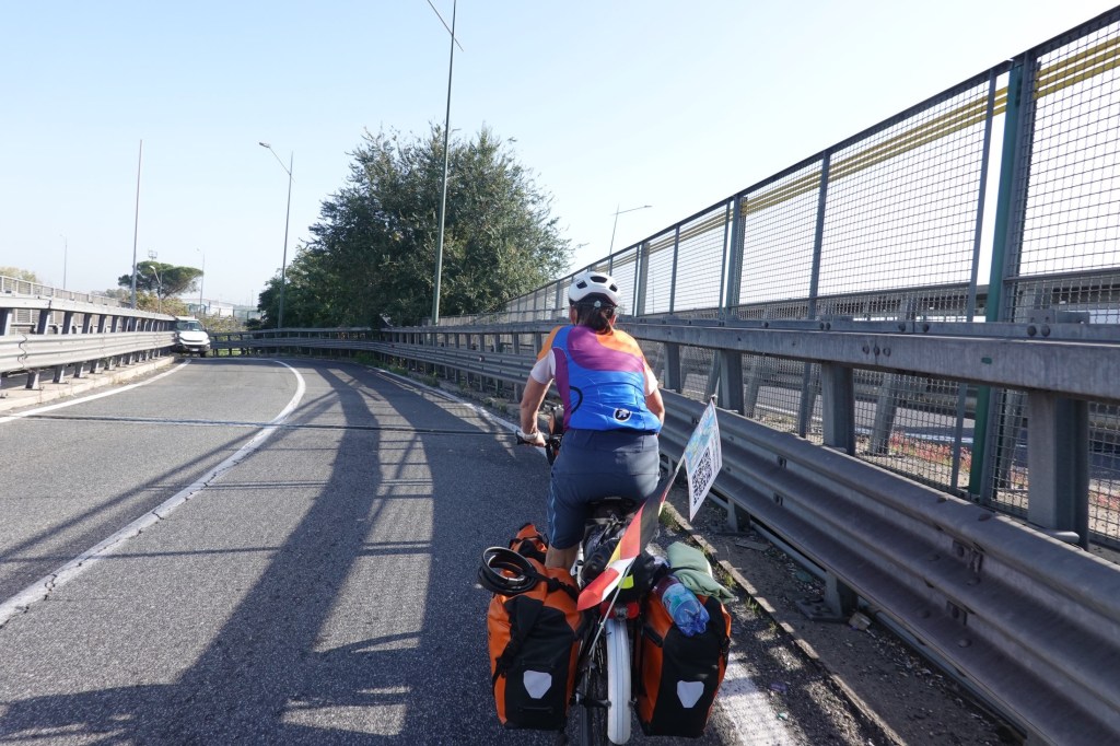Es geht erst unterhalb von riesigen Mauern immer am Tiber entlang, dann über Dämme an Feldern vorbei. Am Autobahnring ist dann Schluss. Konsequenter römischer Radwegebau. Was soll das? Der Radweg hat einen Kreisel als Wendepunkt. Weiter geht’s nicht. Die Rennradler drehen um und fahren zurück in Richtung Rom. Und wir? Wir wollen ans Meer. Es gibt einen schmalen Pfad auf eine Brücke über den Tiber. Eigentlich wollen wir gar nicht ans andere Ufer. Zwischen Autobahnen und Bahnlinien gibt es nur diese Option.