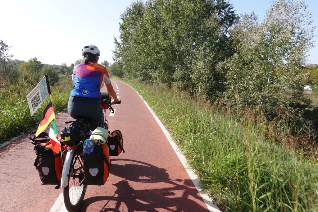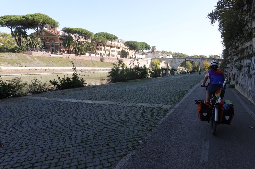 Wie kommen wir vom Campingplatz durch Rom bis zum Meer? Unsere Bologna-Erfahrung mit der Durchquerung einer italienischen Großstadt hat uns gereicht. Auch Rom ist keine Fahrradstadt. Doch hier gibt es den Tiberradweg vom Norden in Richtung Meer. Unterhalb des Campingplatzes ist ein Feldweg, der uns dem Radweg näher bringt. Leider eine Privatstraße mit einem automatischen Tor verriegelt. Klaus läutet an einem Wohnhaus und gestikuliert der Dame, dass sie uns bitte das Tor öffnen soll. Sie drückt auf den Knopf und ruft uns hinter ihren geschlossenen Jalousien noch ein Buon Viaggio hinterher. Am anderen Wegende öffnet uns ein Fahrer eines Lieferwagens das Tor. Glück gehabt. Es gibt sonst nur den Weg über die Autobahn. Nun noch über ein paar steile Hügel in einem Wohngebiet und wir kommen zum einzigen Radweg Roms. Ein netter Autofahrer hält an und erklärt uns, wie wir ihn finden. Unzählige Rennradfahrer sind unterwegs.
