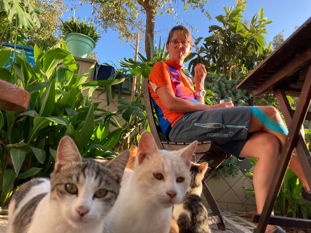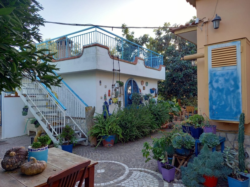 Nur unser Tagesziel in Cuma versöhnt uns wieder etwas mit Süditalien. Es gibt sie doch noch: die kleinen Paradiese. Unser Gastgeber Piero heißt uns sehr herzlich willkommen, ist begeistert von unserer Tour und zeigt uns stolz sein Anwesen. Es ist eine grüne Oase mit Mandarinen- und Avocadobäumen, Palmen, üppigen Topfpflanzen, Meerblick und zutraulichen Katzen. Liebevoll gestaltet mit selbstgemalten Kunstwerken, die etwas an Frieda Kahlo erinnern. Wir dürfen im Garten sitzen, die Küche benutzen und so viele Mandarinen essen wie wir wollen. Wir atmen durch und fühlen uns wohl. Es ist schön nach der anstrengenden Fahrt hier gelandet zu sein.