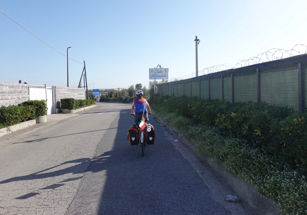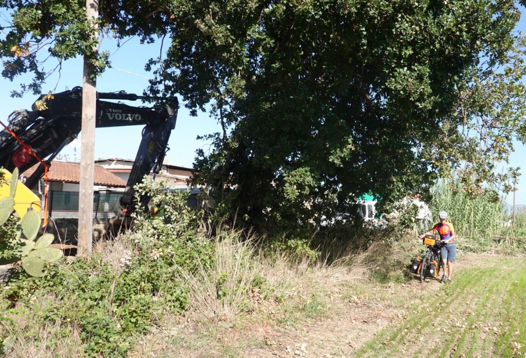 So haben wir uns Süditalien nicht vorgestellt. Zuerst geht es heute noch ganz gut. Wir haben ruhige Seitenstraßen gefunden und können die Hauptstraße umfahren. Klaus ist ganz begeistert: endlich eine Straße ganz für uns alleine. Zu früh gefreut. Zwei Hunde liegen auf der Straße und als wir vorbei fahren stürzt eine ganze Meute von 6 bis 7 Hunden bellend und knurrend aus dem Gebüsch und rennt uns nach. Sabine: gib Gas! Wir sprinten so gut es mit den schweren Rädern geht. Die Hunde geben auf. Glück gehabt. Eine weitere Straße haben wir auch ganz für uns alleine. Sie ist wegen einer Baustelle gesperrt. Wir hoffen, dass wir durchfahren können. In Schweden hat man uns immer durchgewinkt. Nicht so die Italiener. Nein geht nicht. Wir sollen zurück. Mehrere Kilometer Umweg nur wegen einer 50 m langen Baustelle. Klaus erkundet einen Weg über ein Feld. Dann schieben wir eben über den Acker. Sabine holt sich wohl am scharfen Schilfgras ein blutiges Knie, aber halb so wild. Hauptsache vorbei.