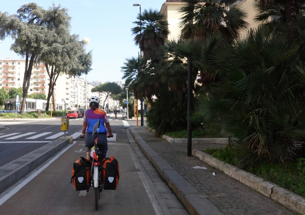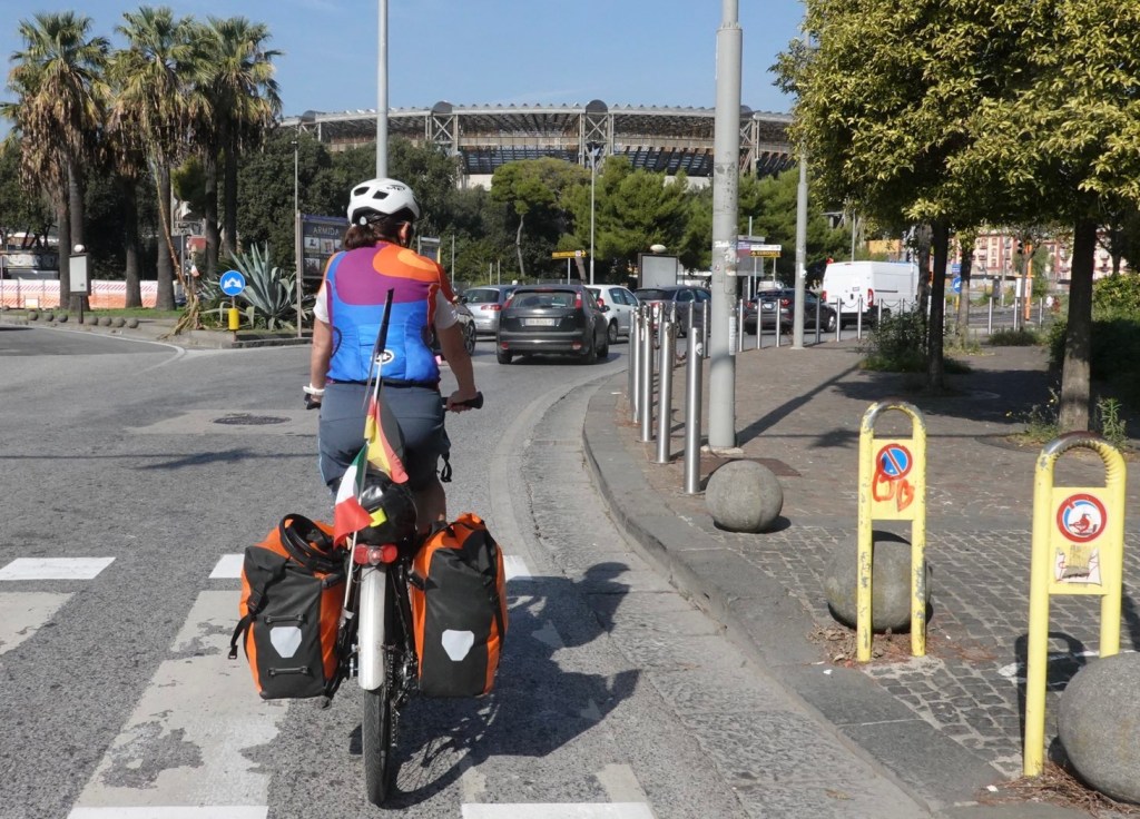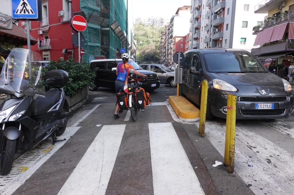 In Pozzuoli besichtigen wir eine Markthalle aus römischer Zeit, ein Marcellum. Es gibt eine erstaunliche Geschichte um dieses Gebäude. Es wurde von einem Vulkan zerstört und versank im Meer. Schließlich taucht es wieder auf und seine Säulen sind voller Muscheln. Dieses Phänomen wird verursacht durch die Aktivität des Supervulkans unter der Stadt. Auch in letzter Zeit hob sich das Gelände, z.B. von 1984 bis 1986 um 1,8 m(!!). Vielleicht sollten wir hier schneller durchfahren. Doch das geht nicht. Es ist Allerheiligen und alle wollen an die Promenade am Meer. Natürlich mit dem Auto. Und alle suchen einen Parkplatz. Doch es gibt keinen mehr. Dafür Staus, Gehupe, Drängeln, nochmal Hupen… das volle Programm des italienischen Straßenchaos. Und wir mittendrin. Im Schneckentempo über holpriges Pflaster versuchen wir in dem Verkehr mitzurollen. Es sind heute nur 22 km , doch wir brauchen dafür 3 ½ Stunden. Unfassbar. Das letzte Stück, das entlang der schönsten Straße Neapels am Meer führt, ist sogar ein Radweg. Nur heute nicht befahrbar. Hier herrscht Volksfestbetrieb. Tausende sind unterwegs. Es gibt Karussells und Kinderbelustigung. Auf unser Klingeln reagiert keiner. Ach hätten wir doch auch so eine Mopedhupe. Da springen immer alle zur Seite.
