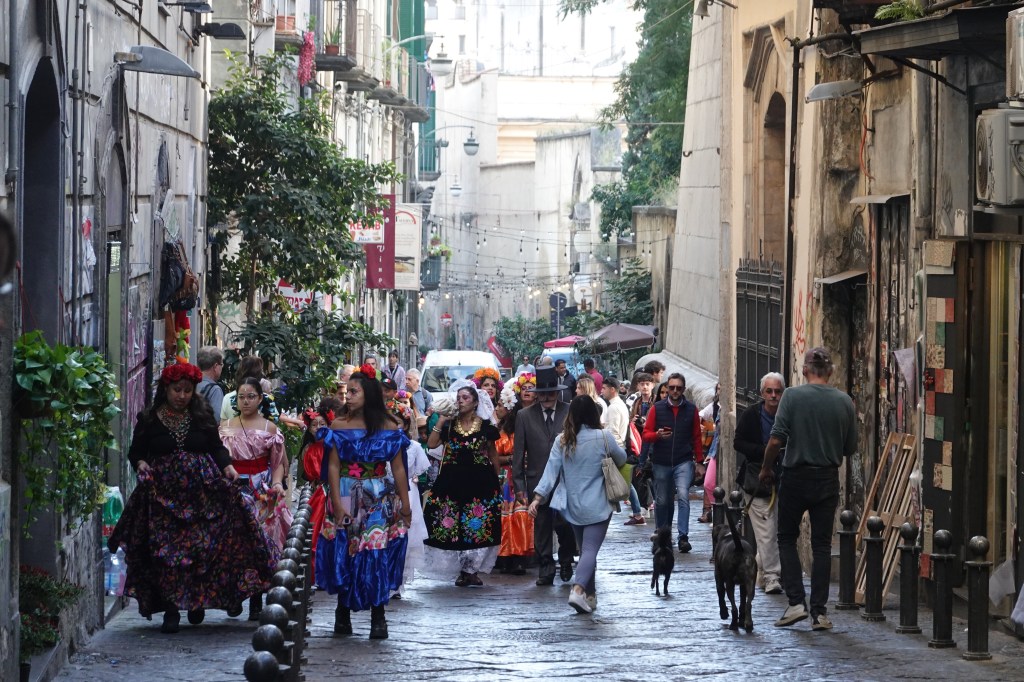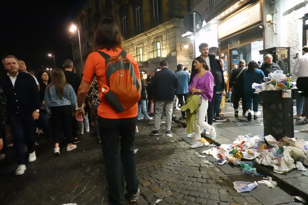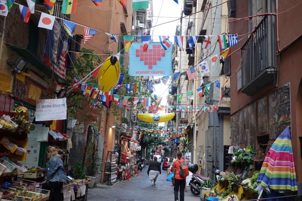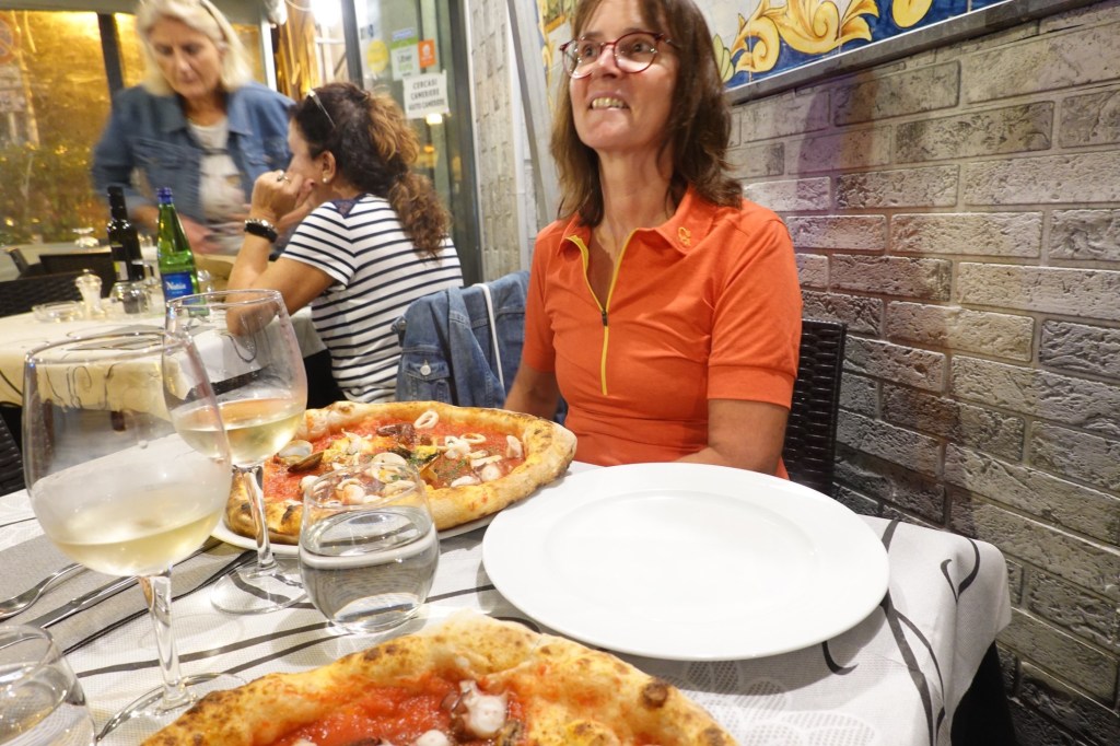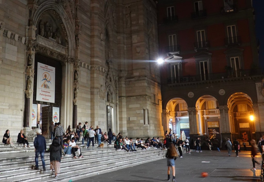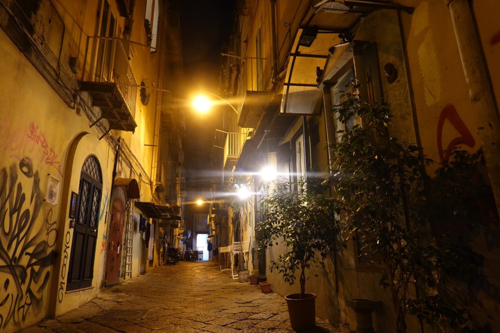 Entspannt können wir noch zu einem Stadtbummel in das Centro Storico. Das historische Zentrum gehört zum UNESCO- Weltkulturerbe. Es gibt finstere enge Gassen, Gassen mit Streetfood und Kitsch, Gassen mit vielen Touristen, Gassen mit Restaurants und Cafés, viele Kirchen, ein Dom und Palazzi. Geplant haben wir unseren Rundgang nicht. Wir lassen uns treiben. Doch ein Ziel haben wir: eine Pizza in Neapel, der Wiege der Pizza. Und zwar der Margherita, mit pomodoro, mozzarella e basilco. Benannt nach einer italienischen Königin im 19. Jahrhundert. Wir bestellen noch frutti di mare mit drauf. Und sind froh, ohne von einem der Tausenden Roller und Mopeds, die durch die Gassen rasen, überfahren worden zu sein. Neapel sehen und sterben? Lieber nicht.