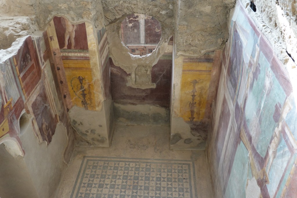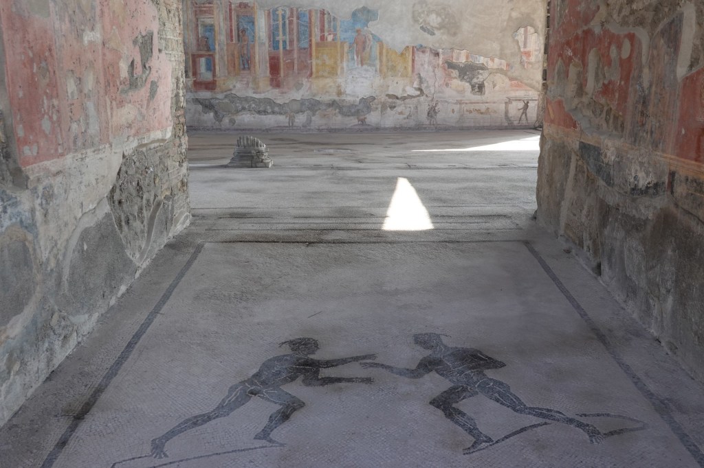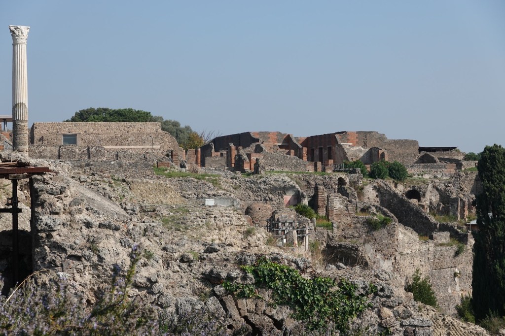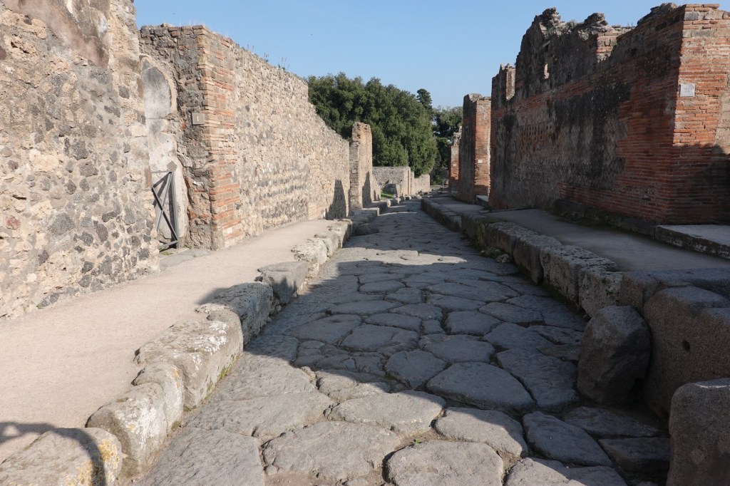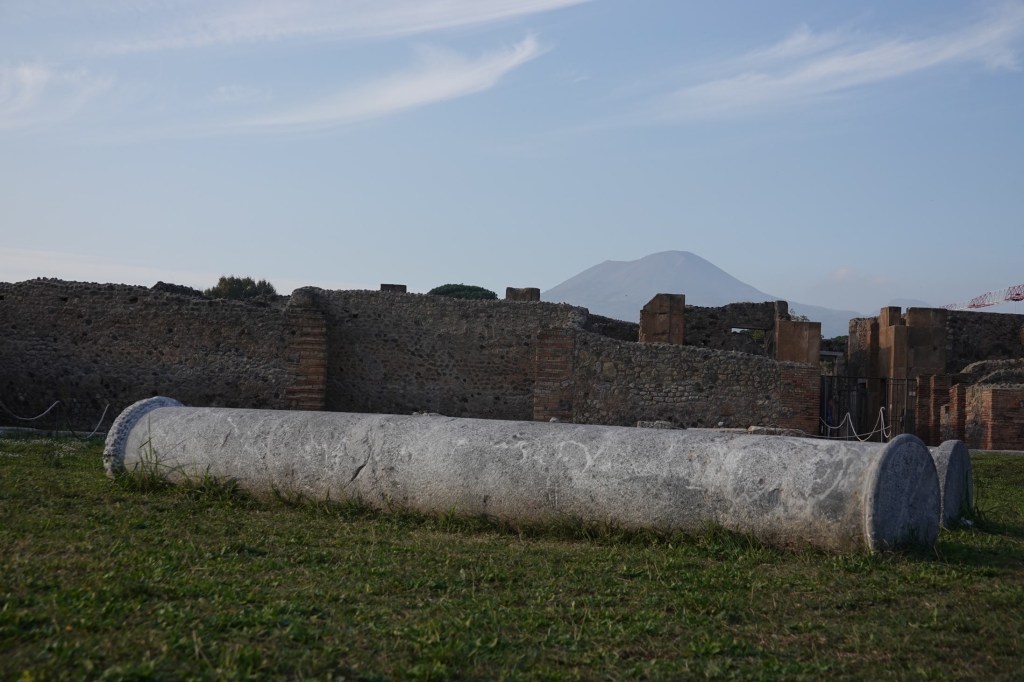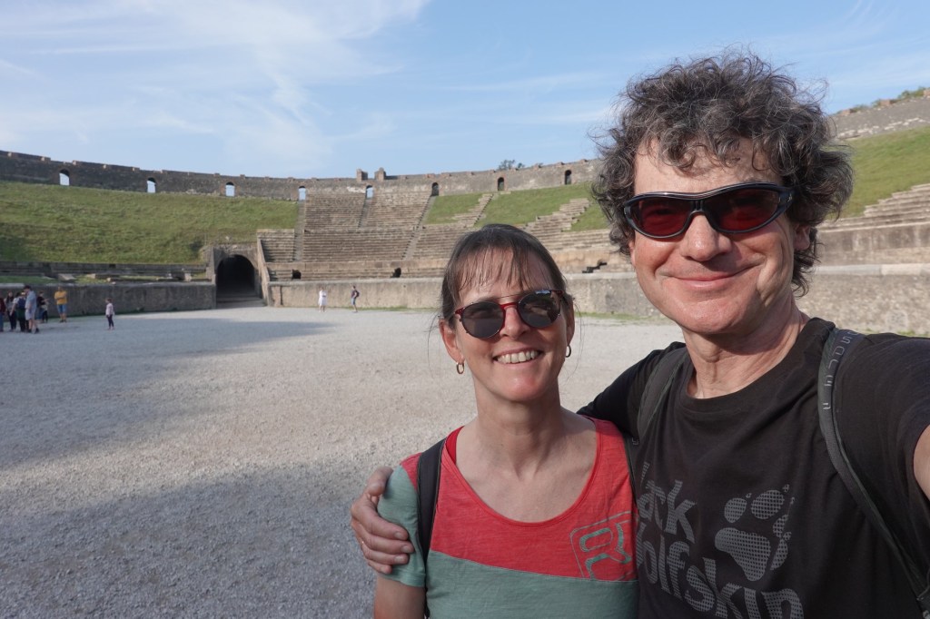 Mit Metro und Zug fahren wir nach Pompei. Die antike Stadt in Kampanien am Golf von Neapel wurde im Jahr 79 n. Chr. vom Vulkan Vesuvio vollkommen verschüttet und unter der Vulkanasche konserviert. Im 18. Jahrhundert wurde die Stadt wiederentdeckt und nach und nach ausgegraben. Die Ausgrabungen sind bis heute nicht abgeschlossen. Pompei ist eine der am besten erhaltenen Ruinen-Städte der Antike und bedeutend zur Erforschung des antiken Lebens. Die Stadt ist riesig, 98 ha haben wir gelesen. Stundenlang laufen wir durch die gepflasterten Straßen. Wir besichtigen Palazzi, Märkte, Tempel, Thermen, Theater, Amphitheater, Foren, Wirtshäuser, Handwerkerläden… alles, was zu einer antiken Stadt gehört. Mit Putz und Stuck verziert, mit Marmor bekleidet, mit Fresken und Gemälden. Berühmt sind die Menschen, die in ihrem Todeskampf verschüttet und als Hohlkörper in der Asche konserviert wurden.