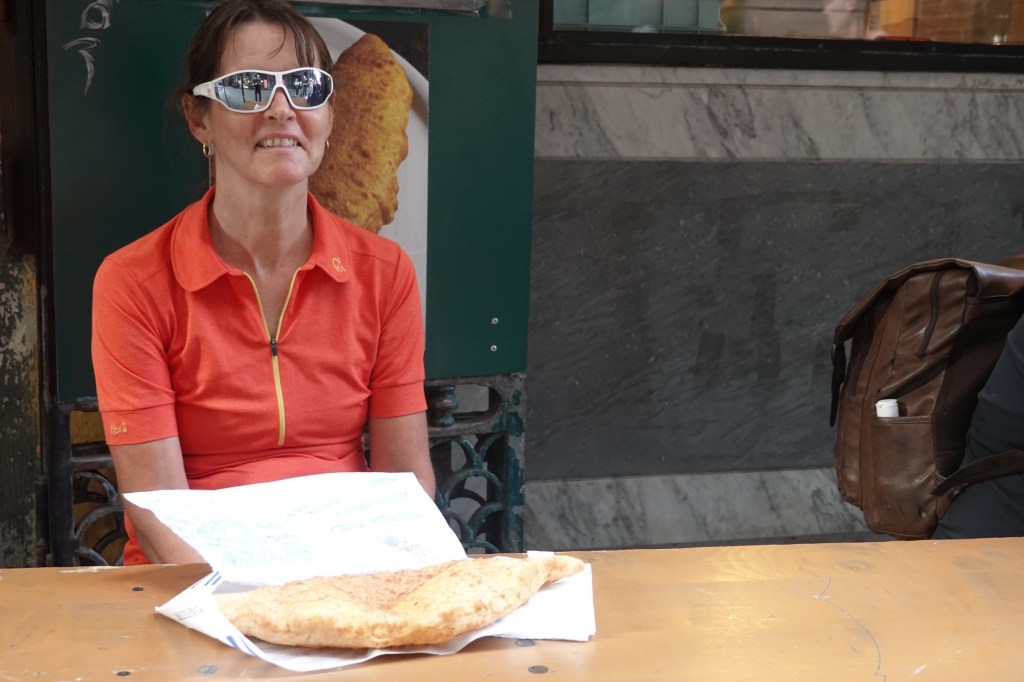 Bevor wir unsere Räder abholen, geht es wieder hinab ins historische Neapel. Zwei Spezialitäten wollen wir noch probieren: Sfogliatelli, Blätterteighörnchen mit Ricotta gefüllt, und frittierte Pizza, eine napoletanische Besonderheit. Am Hafen sind wir eine Stunde zu früh. Wir schlagen die Zeit an der Hafenbar tot. Der Besitzer eines sizilianischen Dolci-Ladens , verschönert seine Fassade gerade mit bunten Sizilienfotos. Sie sind interessant und verlockend und so fällt es uns leicht, Ciao Napoli zu sagen.