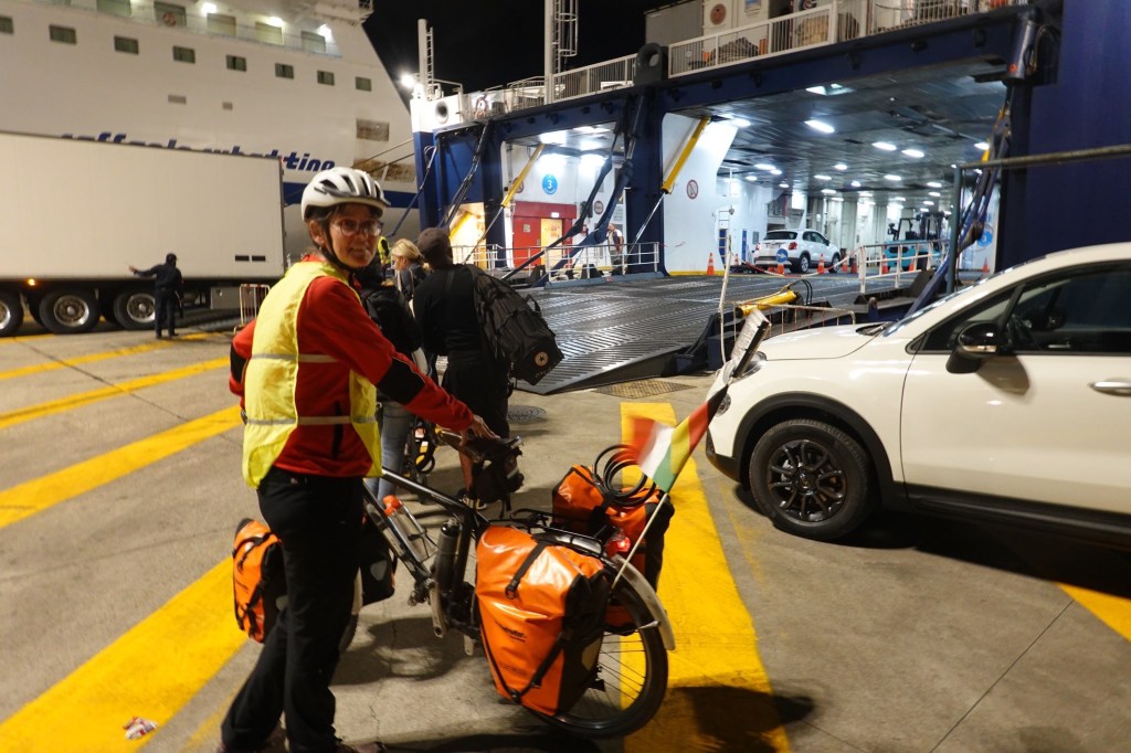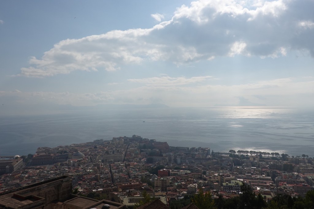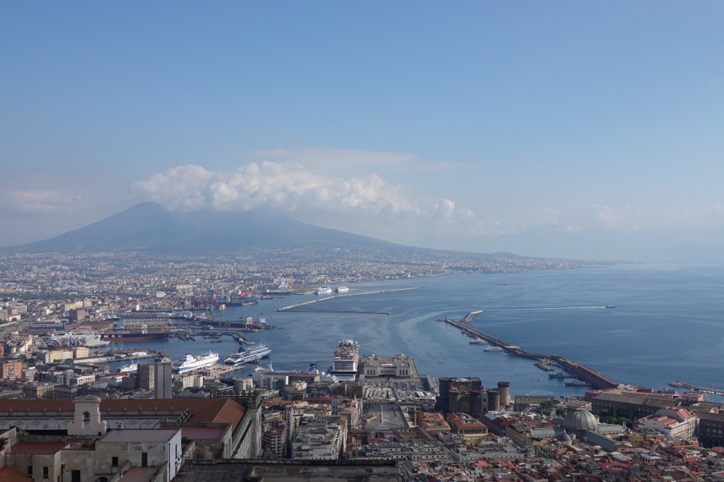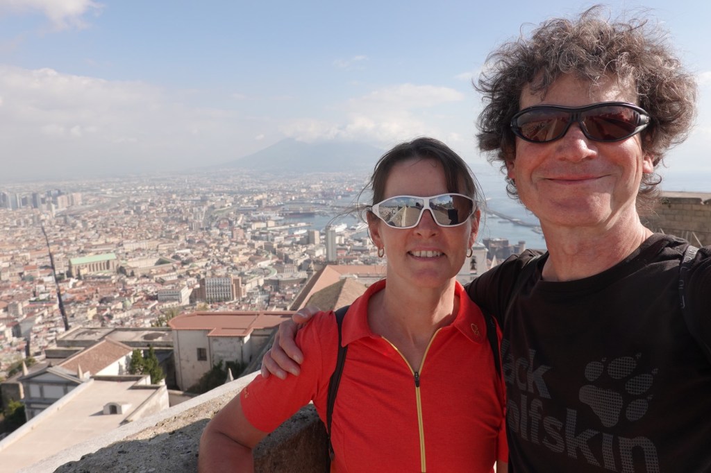 Wir schieben unsere Räder in die Lobby. Die Taschen nehmen ganz schön viel Platz ein. Grazie: Wir bedanken uns nochmal dafür. Wir haben noch Zeit. Unsere Fähre nach Sizilien macht erst um 20.30 Uhr die Leinen los. Gerne hätten wir noch die Oper und die Unterwelt besichtigt, doch dafür gibt es nur feste Termine mit Guide. Mit dem Funicolari, dem Schrägaufzug fahren wir auf den Vomero Hügel zum Castel san Elmo. Die Aussicht auf Neapel, die Bucht, den Vesuv und die Inseln ist eine Wucht. Wie lange wir hier oben nur schauen, wissen wir nicht. Aber es hat sich gelohnt. Unser Schiff liegt schon im Hafen.