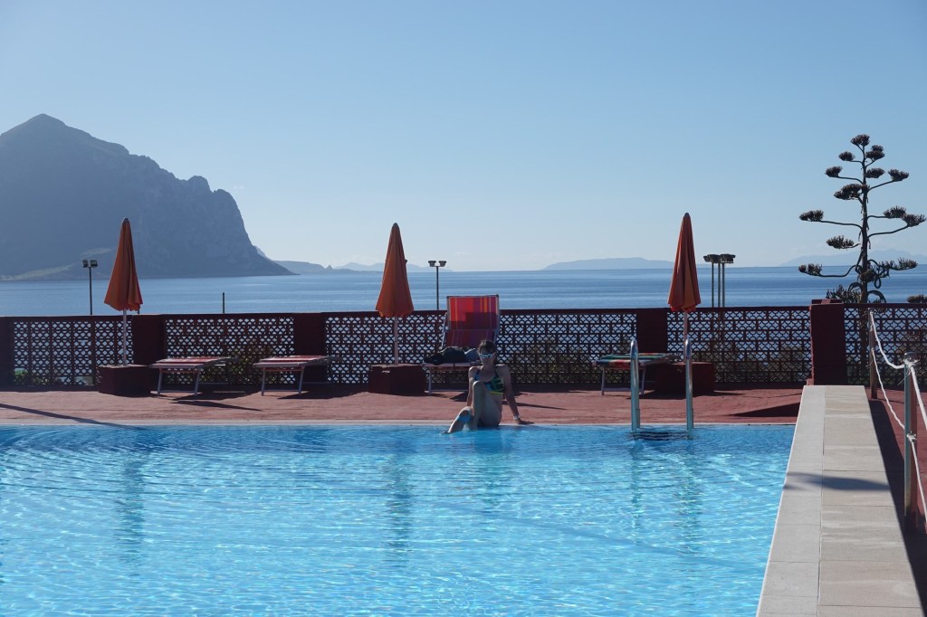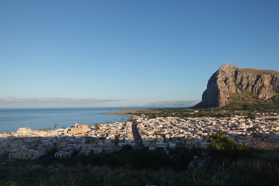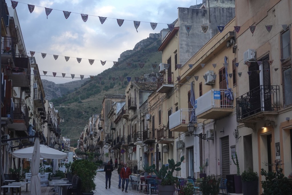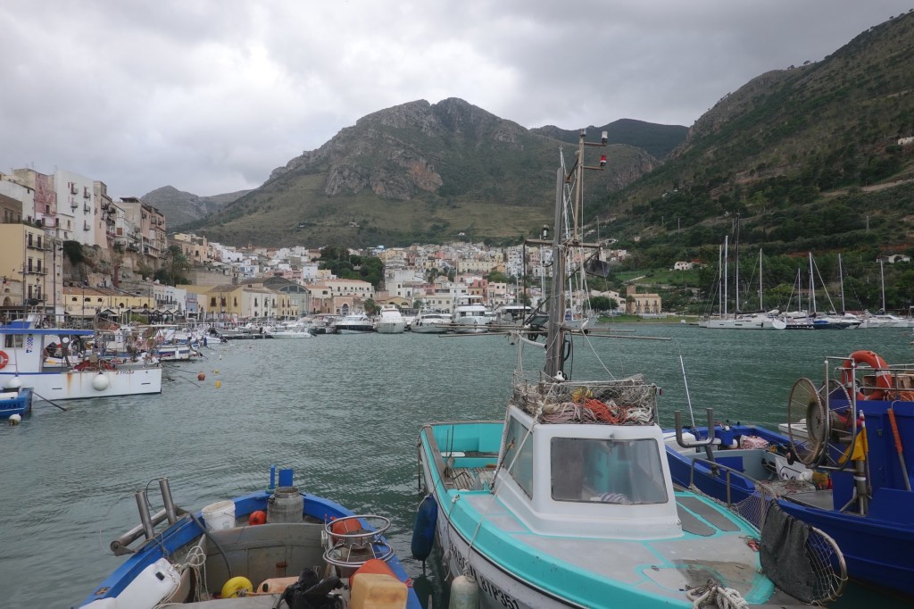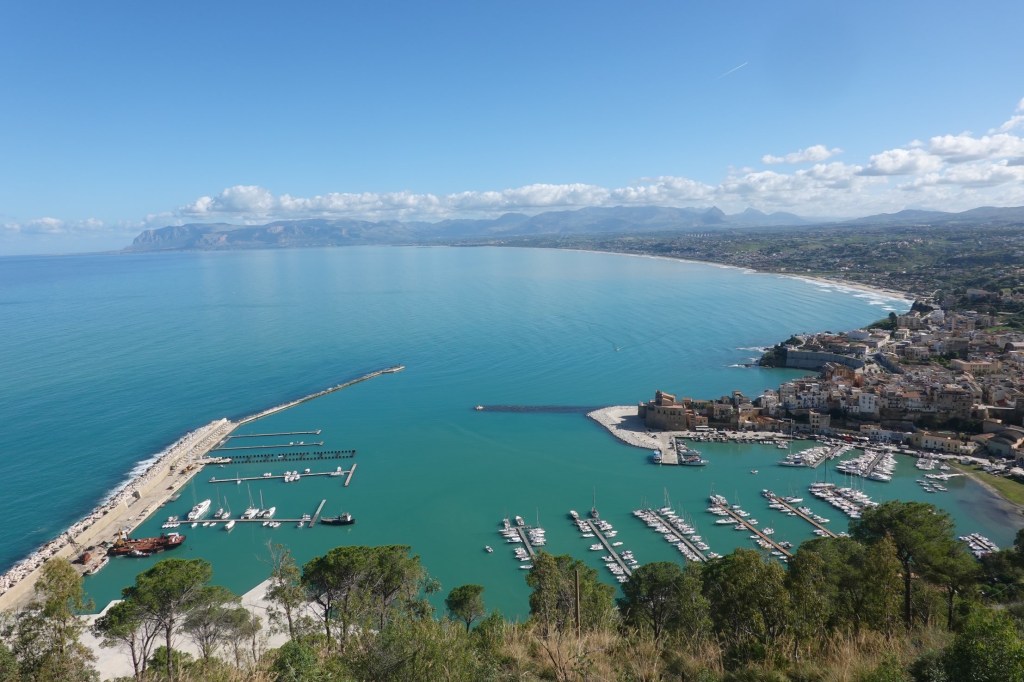 In einer riesigen Bucht mit endlos langem Sandstrand müssen wir dann doch noch gegen den Wind kämpfen. Die Wellen sind so hoch, dass die Gischt unsere Brillen fast undurchsichtig macht. Eigentlich wollten wir eine lange Strecke fahren und auf den letzten 40 km noch über 1000 hm über einen Pass an die Nordwestküste. Aber wegen des Sturms planen wir schon morgens um und buchen ein Hotel in Castellammare del Golfo. Mit Meerblick und auf einer 30 m hohen Mauer über dem Hafen gelegen. Ein sehr interessanter Ort am Beginn eines Nationalparks. Wir freuen uns über unseren fast normalen Radfahrtag und haben noch Zeit für eine Besichtigung des Fischerortes.