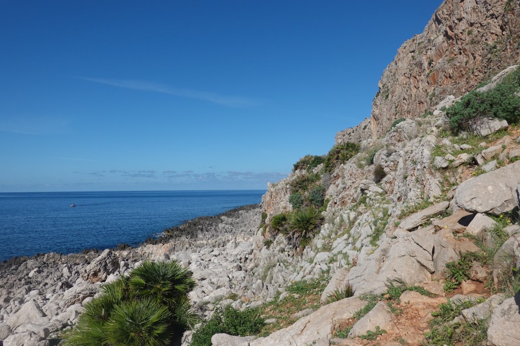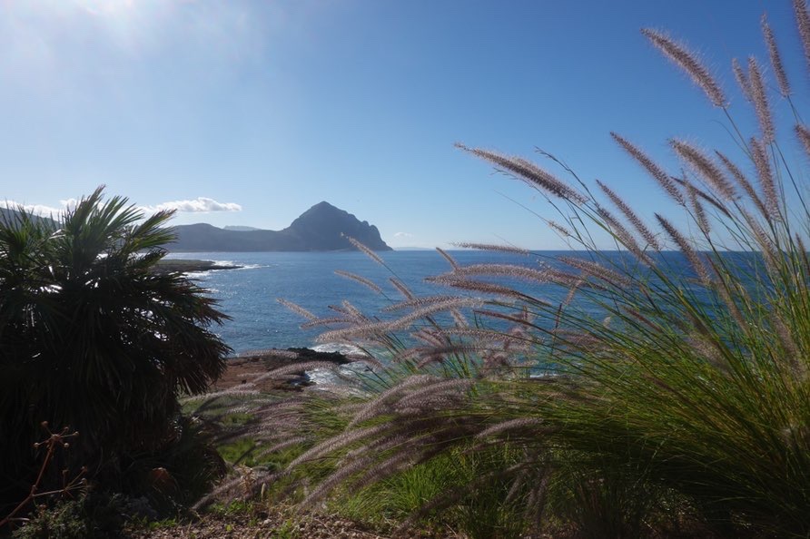 Dann geht es über den dritten Pass des Tages. Die Abfahrt ist atemberaubend. Steile Berge links und rechts und vor uns das tiefblaue Meer. Richtung San Vito Lo Capo wird es immer schöner. Wir biegen auf eine kleine Seitenstraße in Richtung Campingplatz ab. Eine solch schöne Landschaft haben wir auf unserer Tour schon ewig nicht mehr gesehen. Links neben uns das blaue Meer mit einem Ufer aus bizarren Felsen aus Vulkangestein und in der Ferne einige Inseln. Rechts neben uns eine mehrere Kilometer lange ockerfarbene Felswand. Und dazwischen eine üppig grüne Vegetation aus blühenden Oleandersträuchern, immergrünen Mittelmeerpflanzen, Palmen und riesigen Gräsern. Es duftet und blüht hier auch im November.