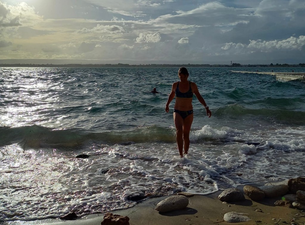 Jedenfalls ist für uns eher Sommer. Die weihnachtliche Dekoration und Beleuchtung ist hier für uns komisch anzusehen. Wir wollen heute noch im Meer baden. Rings um die Insel Ortigia gibt es einige Badestellen. Wir umrunden die Insel an der steilen Küste entlang. Es kommt starker Wind auf und wir geben unsere Idee schon auf. Doch dann kommen wir doch noch an einen kleinen Stadtstrand. Einige Tourist*innen sind im Wasser. Na denn, rein in die Wellen. Das Wasser ist noch relativ warm. Und die Sonne auch. Alle Badenden haben ihren Spaß. Auch die vielen Sizilianer*innen, die kopfschüttelnd und amüsiert in ihren Daunenjacken am Samstag vorbeiflanieren. Das sind die Deutschen, versteht Sabine eine Passantin. Aber: Was gibt es schöneres als Mitte November im Meer zu baden?