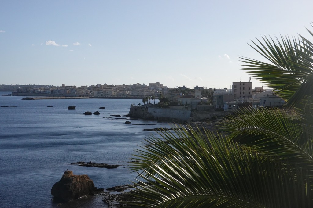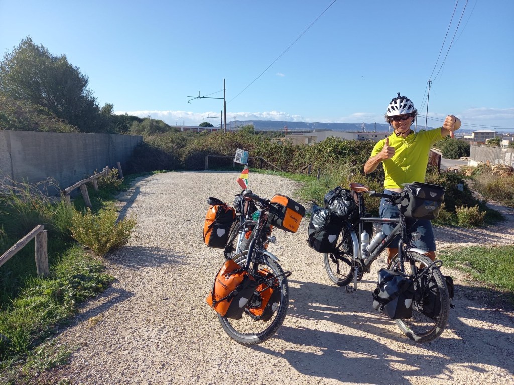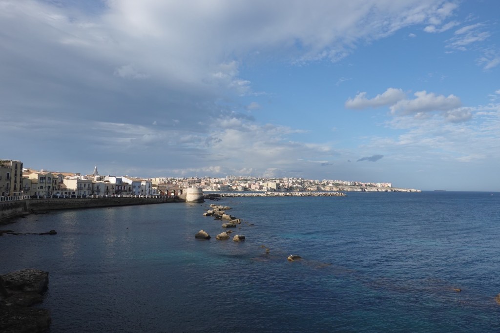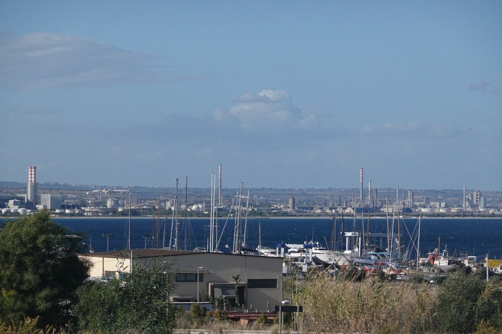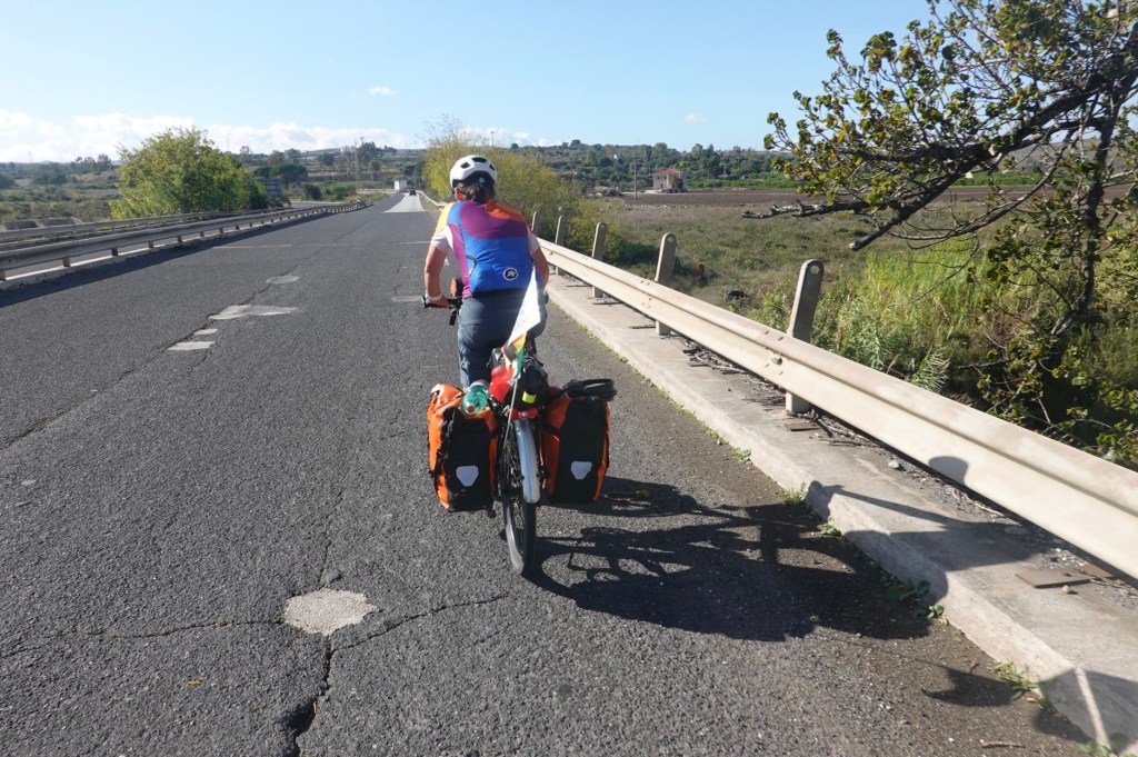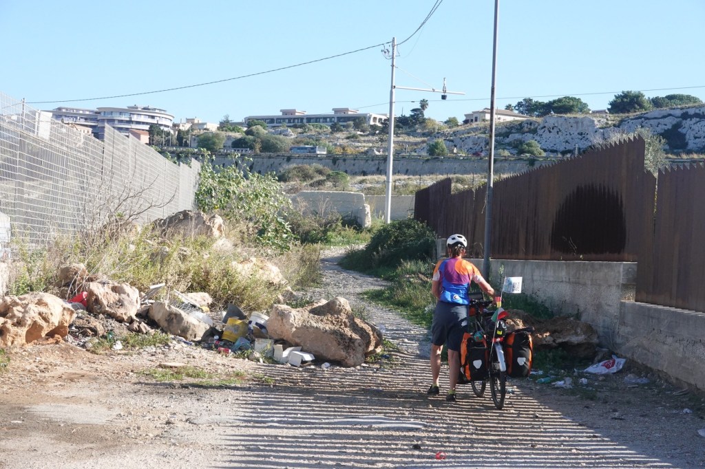 Endlich dürfen wir auf eine Nebenstraße abbiegen. Natur, wenig Verkehr, so könnte es bis Syrakus weiter gehen. Denkste. Auf unserer tollen Sizilienkarte sind die kommenden Straßen weiß oder gelb eingezeichnet. In Wirklichkeit sind sie vierspurig. Wir fahren über 20 km an Erdölraffinerien am Meer vorbei. Das ist so spannend als würde man in Deutschland über eine Autobahn durch Industriegebiete fahren. Vor Syrakus gibt es tatsächlich einen Radweg. Er führt über eine alte Bahntrasse immer am Meer entlang. Wohl etwas holprig, aber schön. Das erste Mal in Sizilien fahren wir direkt am Meer. In Siracusa gibt es dann noch eine Überraschung. Wir können durch die Stadt bis zur historischen Insel Ortigia über Radwege fahren. Das hatten wir seit Südtirol nicht mehr.