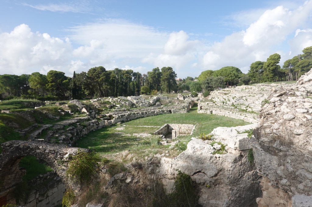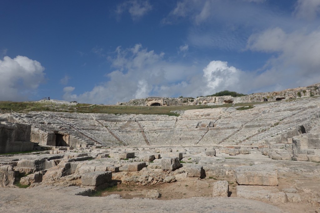 Wir bleiben noch einen Tag in Syrakus. Am Montag fährt unsere Fähre ab Pozzallo nach Malta. Wir informieren uns über die wichtigsten Sehenswürdigkeiten in dem UNESCO-Welterbe. Das wievielte ist das eigentlich auf unserer Tour? Wir haben nicht mitgezählt. Zuerst besichtigen wir das griechische Theater und das römische Amphitheater. In der Antike war Syrakus eine mächtige Stadt. Die Tempel hatten wir gestern schon gesehen. Es ist heiß. Mindestens 25 Grad in der Sonne. Für uns. Die Sizilianer*innen tragen bei den Temperaturen dicke Steppjacken und Schals. Und auf dem Rennrad Beinlinge, Langarmshirts und Handschuhe. Schwitzen die denn nicht? Aber es ist ja schließlich Mitte November. Irgendwann muss man die Wintersachen ja anziehen.