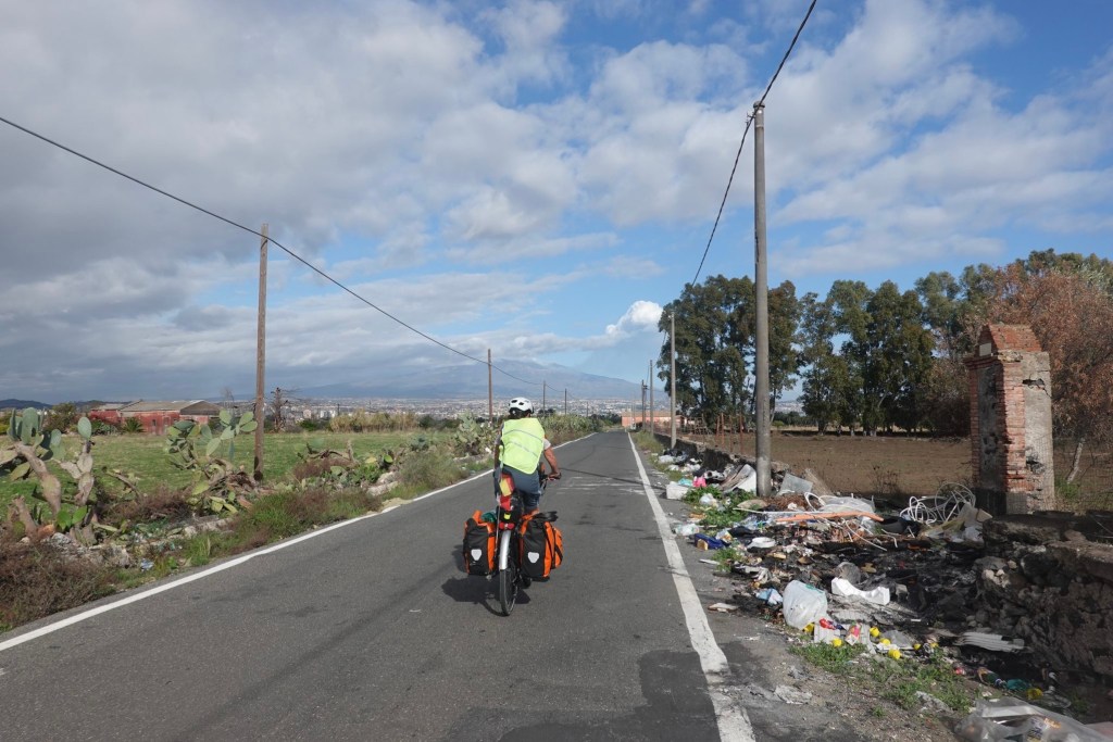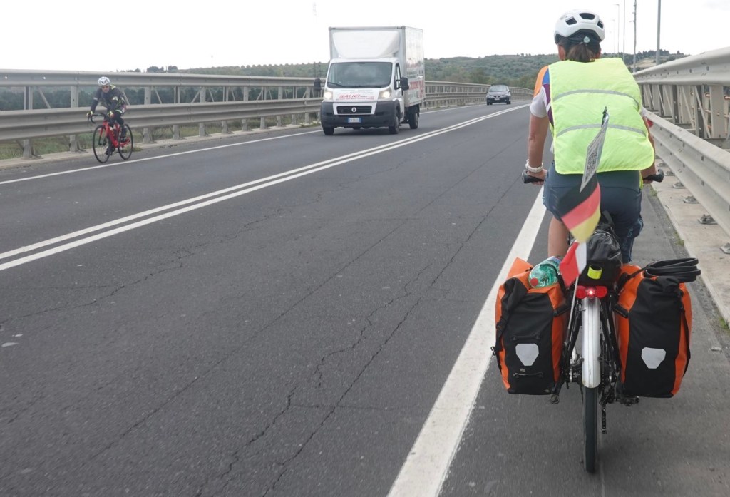 Unser Navi führt uns über kleine Straßen mit riesigem Natursteinpflaster aus Catania heraus. Wir holpern über hunderte tiefe Löchern bis zu einem Doppelkreisel. Jetzt wird es ernst. Links einordnen? Bei vier Spuren und noch Mopeds dazwischen? Augen zu und durch! Geschafft! Wir sind auf der Hauptstraße in Richtung Syrakus. Nicht lange. Unfreundliche Straßenarbeiter haben kein Mitleid mit uns. Die Straße wird umgeleitet. Anwohner dürfen fahren, Transit nicht. Sind wir Transitverkehr? Da hätten sie doch mal ein Auge zudrücken können. Nein, wir müssen den riesigen Umweg fahren. Wieder auf der eigentlichen Straße, nutzen wir den Seitenstreifen. So können LKWs ohne zu Bremsen an uns vorbei brausen. Wir sind hochkonzentriert. Entspanntes Rad fahren ist das wieder nicht.