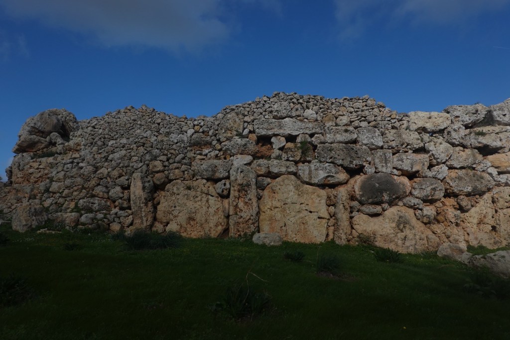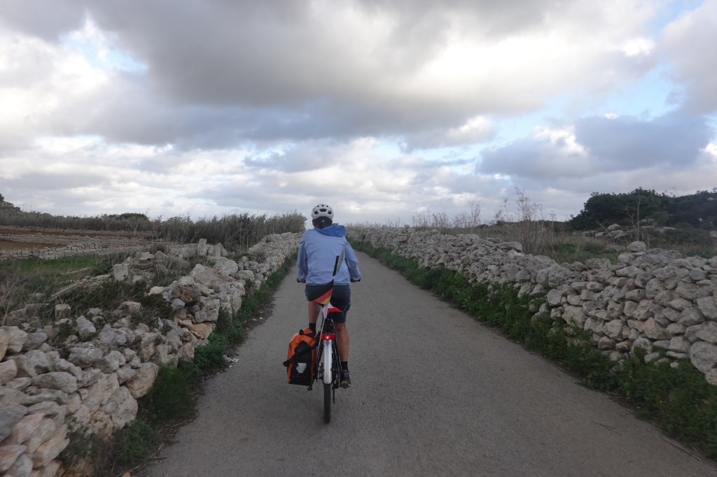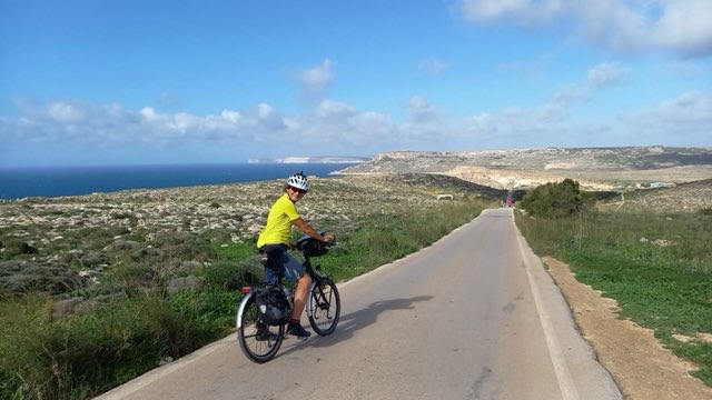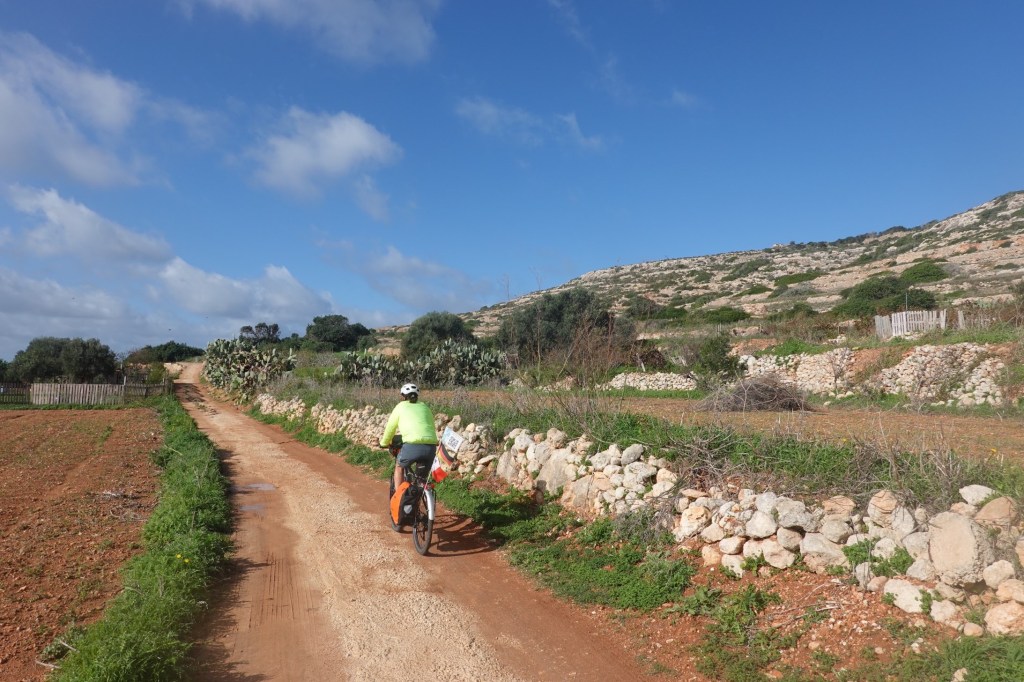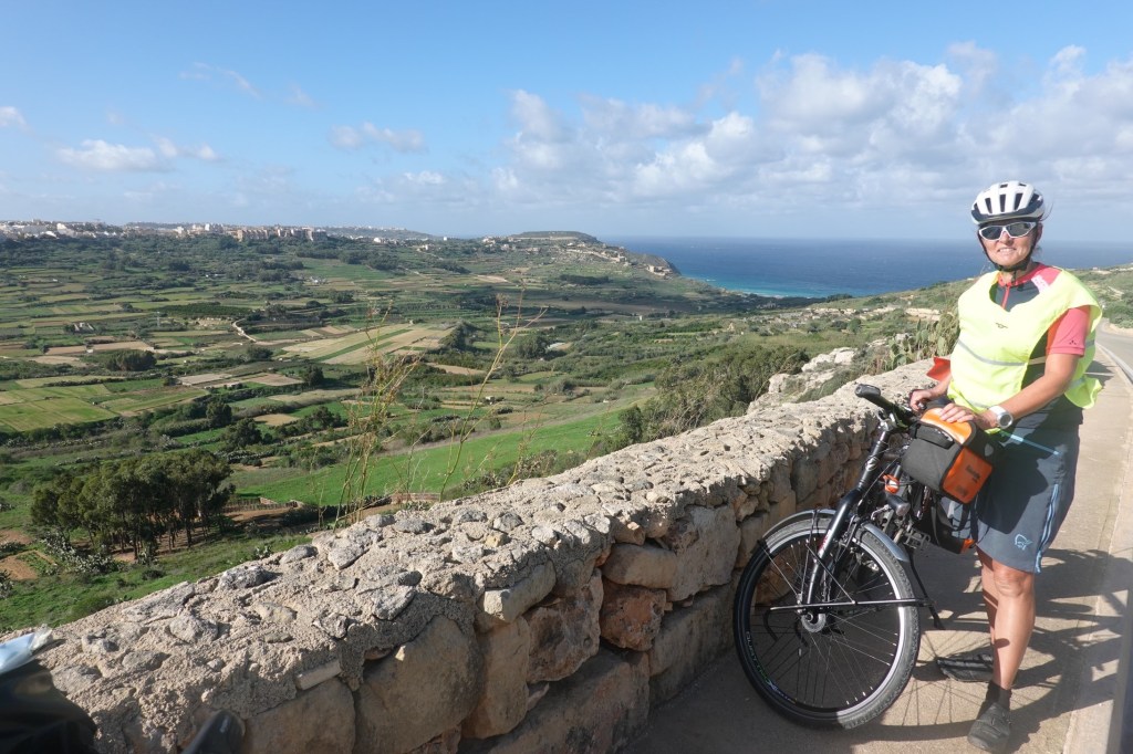 Bis zur Fähre brauchen wir ewig, denn wir meiden Hauptstraßen. Aus den schlechten Erfahrungen von gestern. So geht die Strecke mehrmals über 20 % bergauf und bergab. Aber meist mit toller Aussicht. Wir fahren an einer Bucht mit türkisfarbenem Wasser vorbei. Schade, dass sie etwas verschandelt wird durch die Kulissen eines Filmsets für Popeye. Sie sind heute ein Vergnügungspark. Die Fähre bringt uns in 25 min nach Gozo, vorbei an Comino, wo wir von Weitem die Blaue Lagune erkennen können. Leider schaffen wir nicht die komplette Umrundung. Wir verlieren viel Zeit bei der Anreise und fahren mittlerweile hier so defensiv, dass wir nicht vorankommen. Immer ganz am Straßenrand, egal ob holprig oder dreckig, und so langsam, dass wir immer irgendwie reagieren können. Sabine muss schon wieder zwei heikle Situationen meistern. Ein parkender LKW fährt einfach los und ignoriert sie. Es ist knapp. Und ein paar Minuten später muss sie einer Autotür ausweichen, die ohne Rücksicht aufgeschlagen wird. Die Warnweste nützt auch nichts. Auf Gozo ist es also auch nicht besser. Wir fahren eine kleinere Runde und besichtigen die prähistorische Tempelanlage Ggantja. Mehr geht nicht. Die Fähre bringt uns auf die Hauptinsel zurück und wir kommen rechtzeitig vor Einbruch der Dunkelheit in Bugibba an.