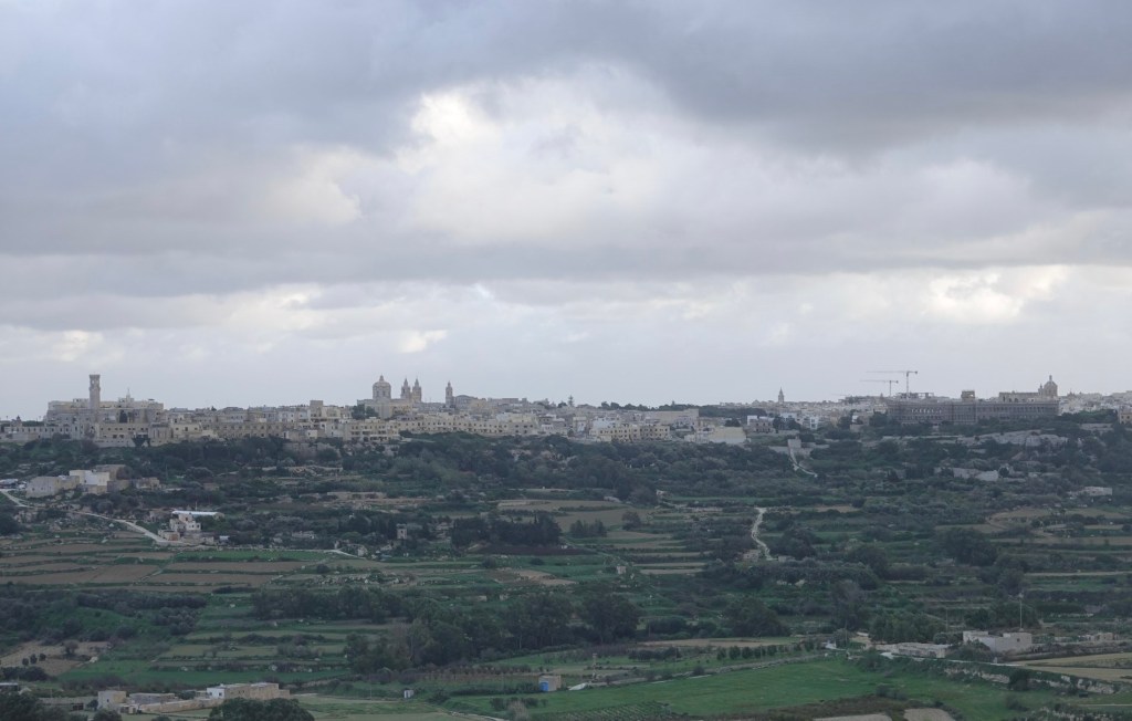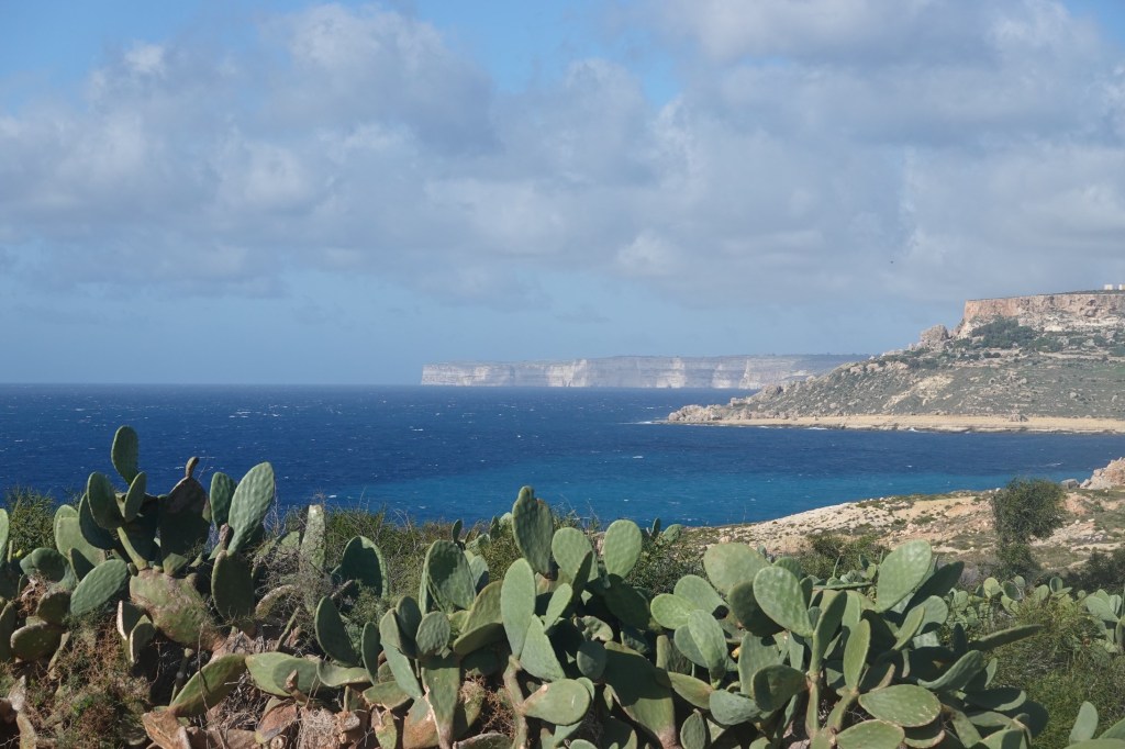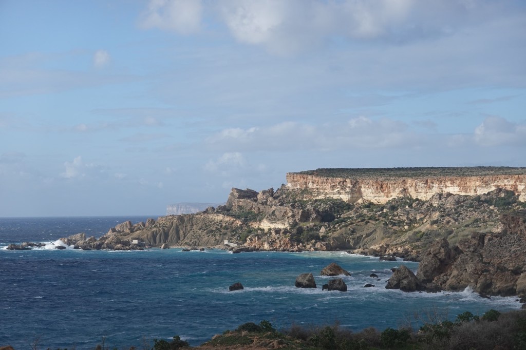 Wir fahren gegen den Wind an die Westküste nach Ghajn Tuffieha südlich der Golden Bay. Von oben können wir die tosenden Wellen in den beiden Buchten bestaunen. Am Wachturm aus dem 17. Jahrhundert weht der Wind so stark, dass wir uns quasi reinlegen können. Wir wollen zu den Dingi Cliffs, doch das schaffen wir nicht mehr. Wir müssen bevor es dunkel wird zurück sein. Über eine kleine Straße über eine Anhöhe geht es zurück zu einer Hauptstraße. Die Aussicht reicht fast über ganz Malta. So groß ist dieser Inselstaat nicht. Vergleichbar mit Bremen, haben wir gelesen. Wir hätten eine größere Insel erwartet. Und auch, dass alles ausgetrocknet und kahl ist. Wir sind erstaunt. Malta ist grün. Außer in den Städten. Malta hat drei Gesichter. Auf der einen Seite gibt es riesige Flächen mit Bebauung, eine Stadt geht in die andere über. Auf der anderen Seite gibt es viele landwirtschaftlichen Flächen, streng gegliedert mit Steinmauern. Hier wird vor allem Gemüse angebaut, aber auch Wein. Und eine dritte Seite ist die Natur mit ihren Klippen und Stränden. All die können wir von unserer Anhöhe aus bestaunen.
