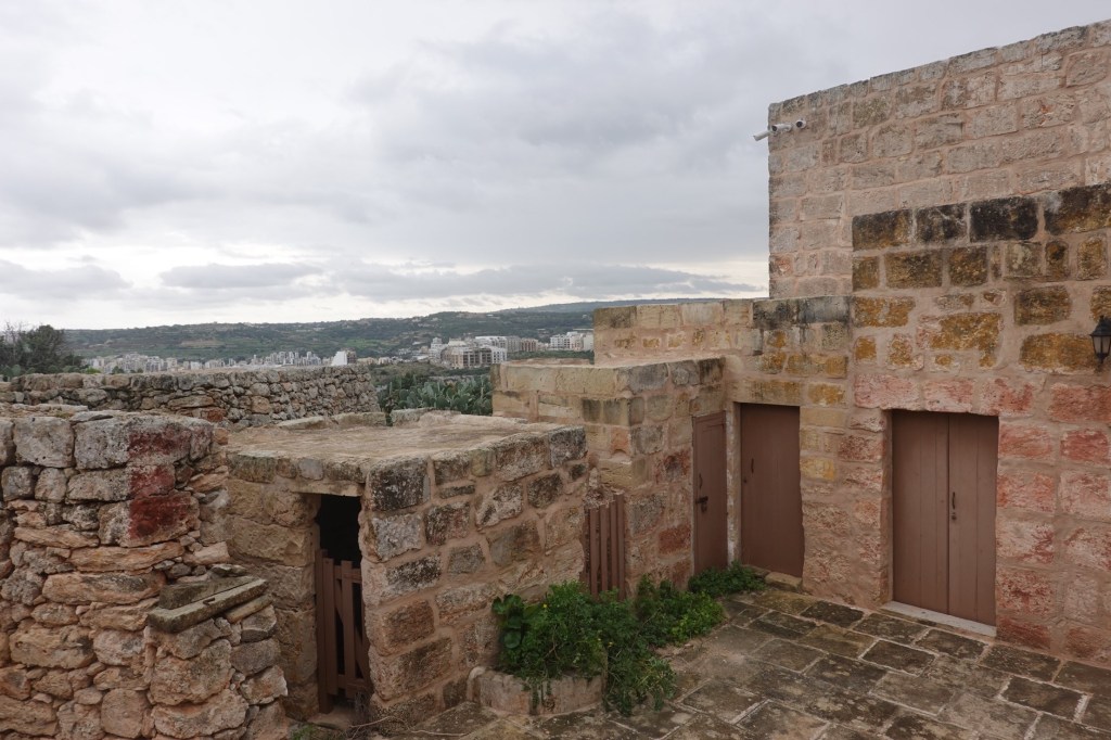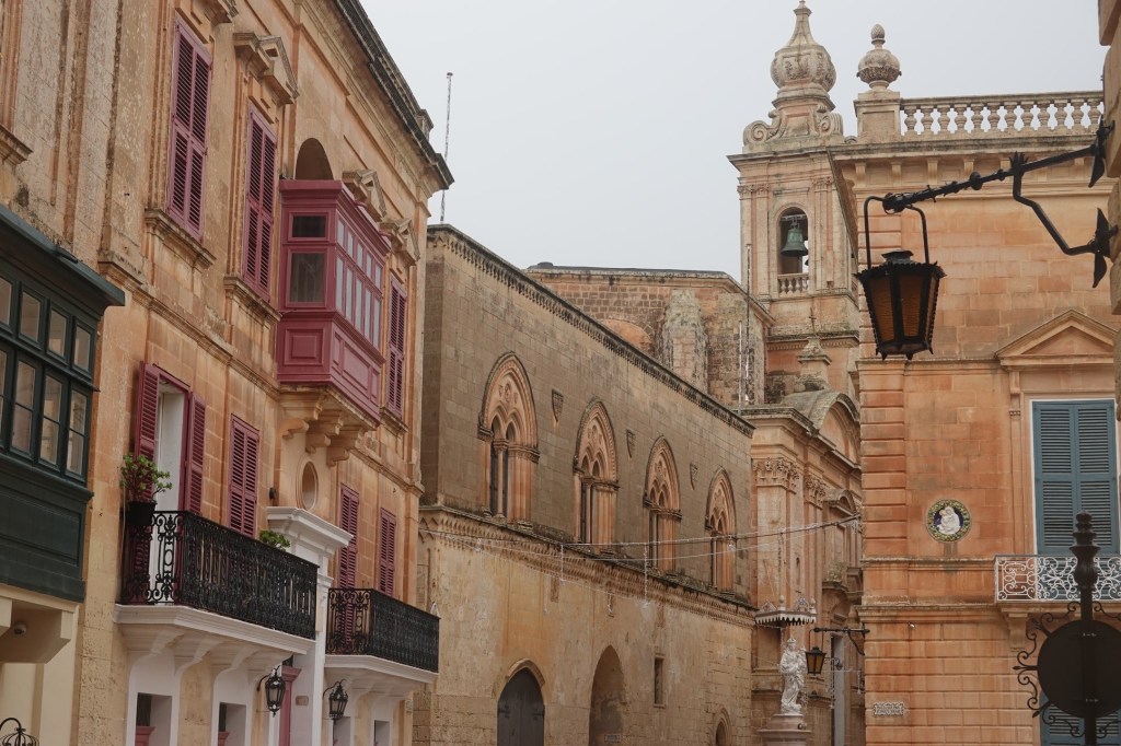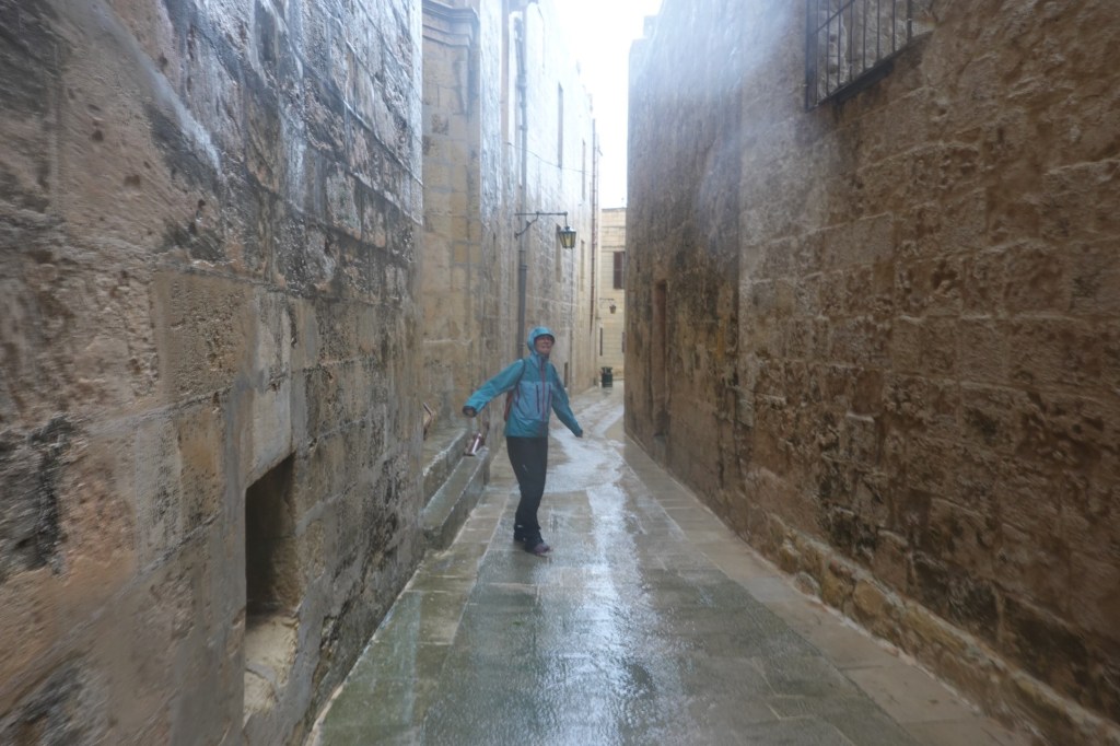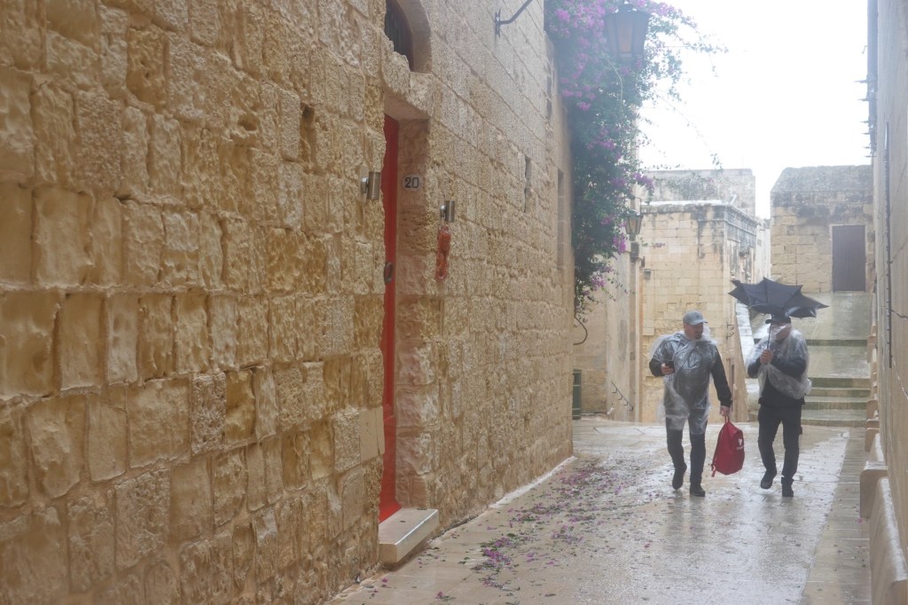 Es regnet und stürmt, mehr als gestern. Wir nehmen den Bus nach Mdina, einer mittelalterlichen Stadt mit engen Gassen, Palästen und Kirchen aus sandfarbenem Kalkstein und einem Stadttor, zu dem Game of Thrones-Fans aus aller Welt pilgern, da es als eine Kulisse in der Fantasy-Serie diente. Überhaupt ist Mdina fast nur noch Touristenattraktion. Es leben nur noch wenige Menschen hinter den Stadtmauern. Dabei war die Stadt auf dem Hügel schon in der Bronzezeit besiedelt und von den Phöniziern und später den Römern als Festung ausgebaut worden. Auch der Malteser-Ritterorden war in Mdina ab Mitte des 15. Jahrhunderts beheimatet. Diesen Orden gibt es noch heute, heute mit Sitz in Rom. Er ist nach dem Völkerrecht souverän, hat eine eigene Regierung, Verfassung und Rechtsprechung. Bekannt ist in Deutschland der Malteser Hilfsdienst e.V. , der wie sein Ursprungsorden humanitäre Hilfe zum Ziel hat. Beide haben als Symbol das weiße Malteserkreuz auf rotem Grund, das auch heute ein Symbol Maltas ist und auf die maltesischen Euromünzen geprägt wird. Die Malteserritter-Videoshow lassen wir links liegen. Ist uns zu touristisch. Doch es wäre wenigstens trocken gewesen. So stehen wir bei jedem heftigen Schauer unter einem Eingangsvorsprung und werden trotzdem nass.