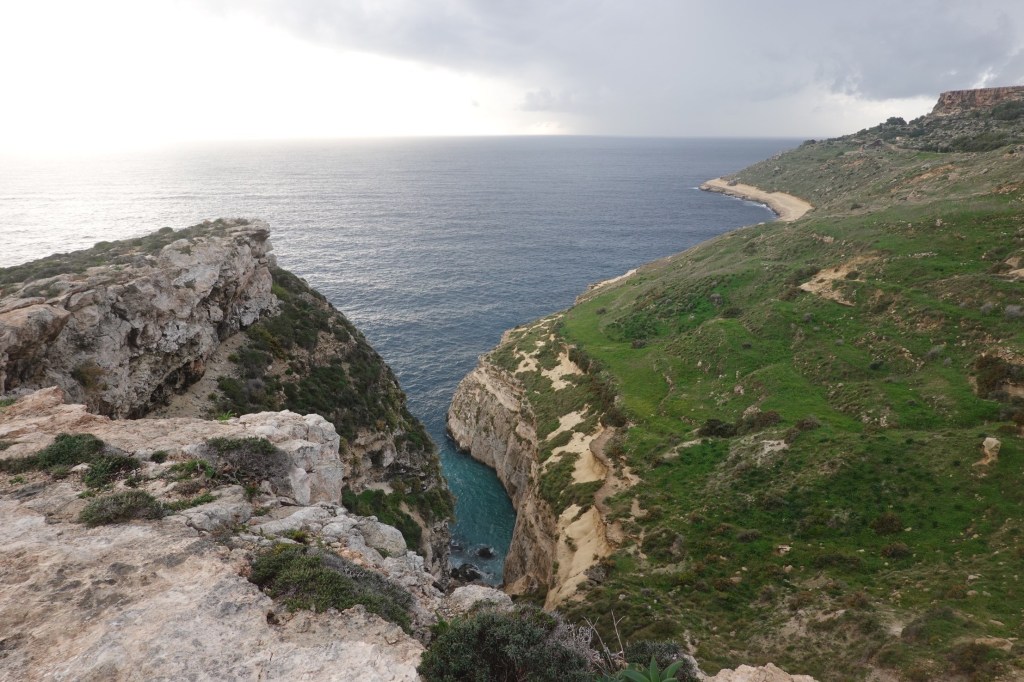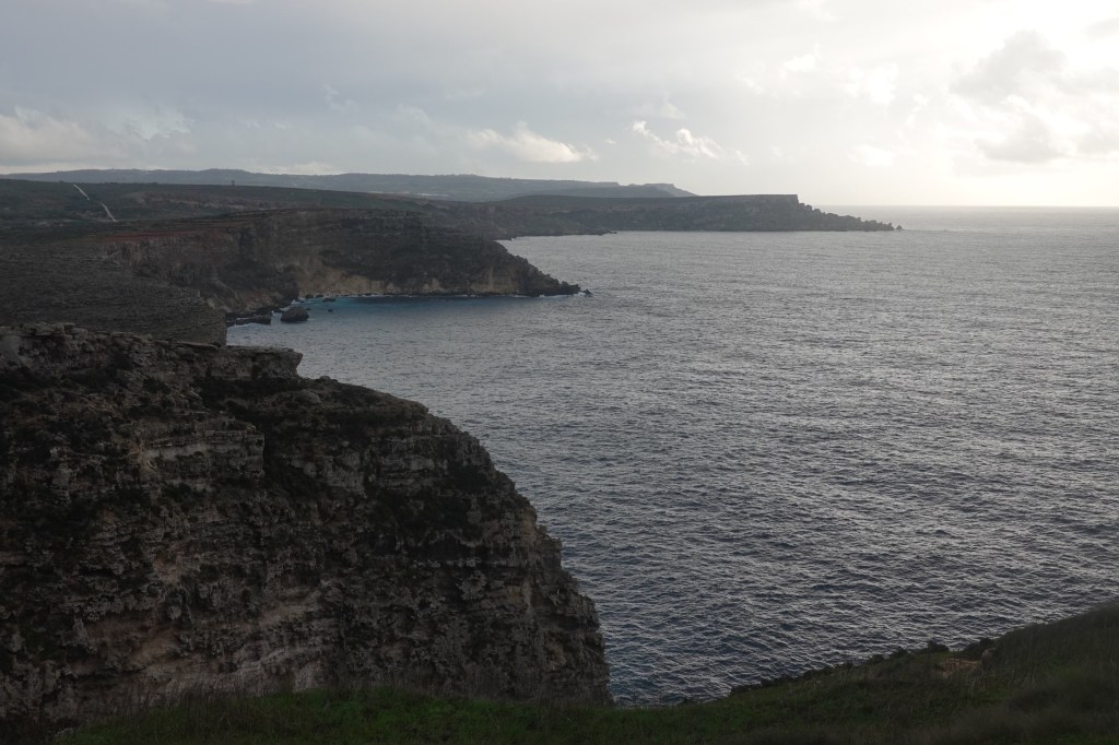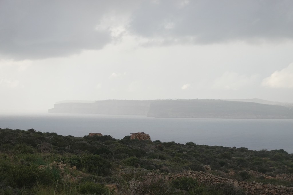 Nach endlos langer Stadtdurchquerung, Warten unter einem Dach, bis der Regen nachlässt, und Wandern entlang der Hauptstraße kommen wir endlich wieder in natürliches Terrain. Auf der nordwestlichen Seite Maltas. Die Insel ist hier nicht sehr breit. An der Nordspitze regnet es dann wieder. Über dem Meer sehen wir Gewitter mit starkem Regen. Wir beeilen uns und fahren mit dem Bus zurück. Trotz schlechtem Wetter sind wir stundenlang gewandert. Geht auch. Man darf nur nicht zu viel in den Matsch treten.