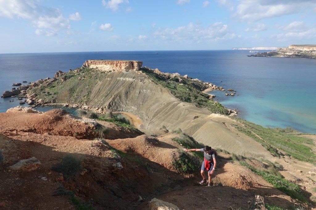 Es scheint wieder die Sonne. Wir wollen an den Klippen wandern. Viele Möglichkeiten zum Wandern gibt es nicht auf Malta. Dazu ist es zu klein und zu dicht besiedelt. Die Bevölkerungsdichte auf Malta nimmt den fünften Platz weltweit ein. Naturbelassene Flächen sind rar. Wir fahren mit dem Bus zur Tuffieha Bay. Dort waren wir wohl schon mal mit dem Rad, doch nur am Strand und nicht auf den Klippen. Es gibt einige schmale Pfade entlang der Steilküste. Erschwert wird die Wanderung durch den lehmigen Schlamm auf den Wegen. Aber er ist ja nur an den Füßen. Gut, dass unsere Räder im Hotel stehen. Es gibt riesige steile Lehmhänge, ockerfarbene Felsen und unten ist immer das türkisfarbene Meer. Tolle Ausblicke auf die Steilküste und die roten Strände. Wir genießen unseren letzten schönen Tag auf Malta.