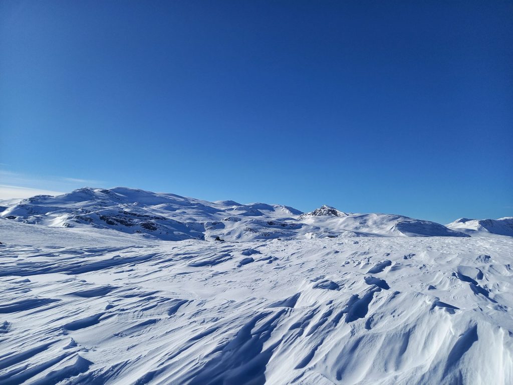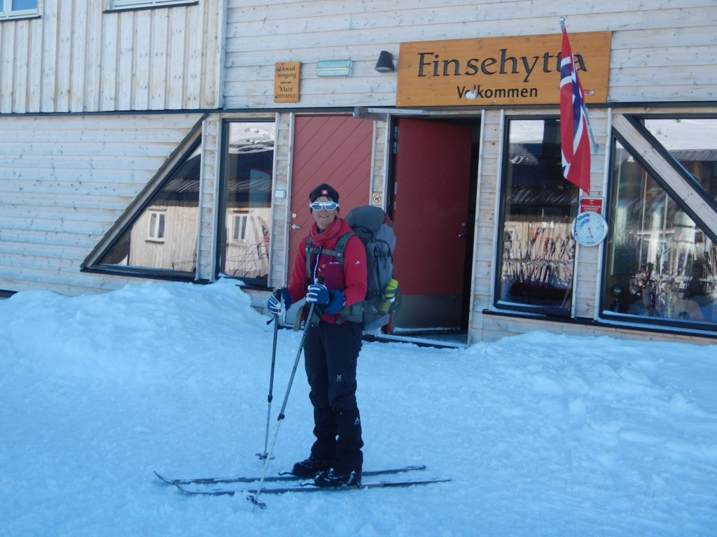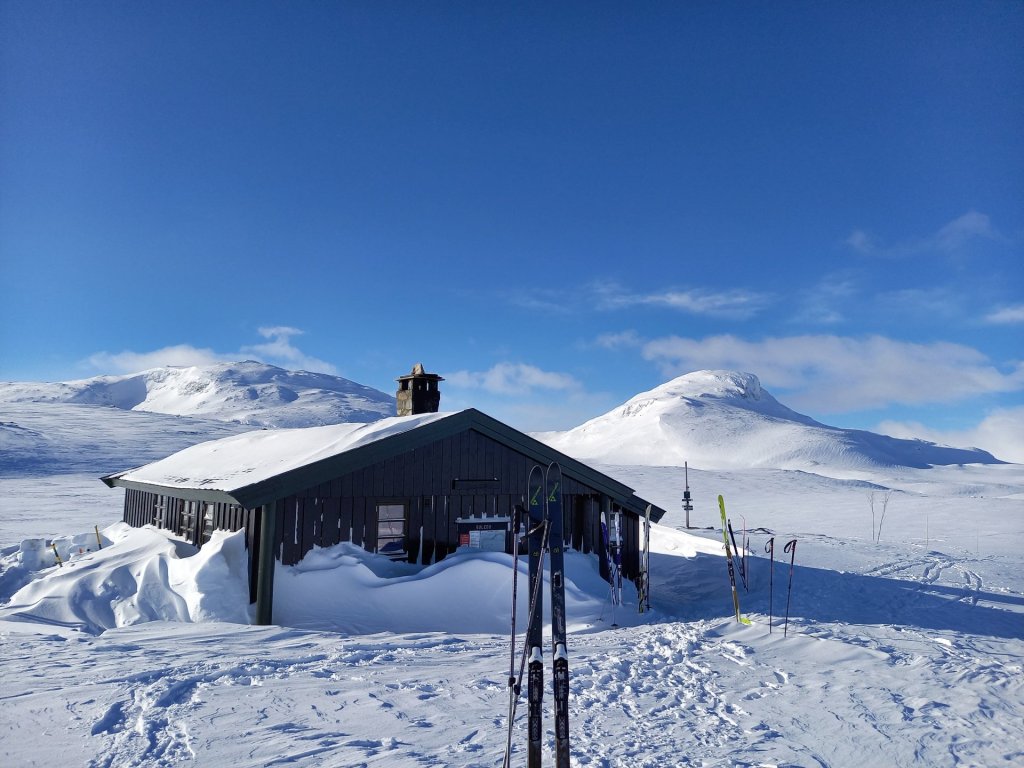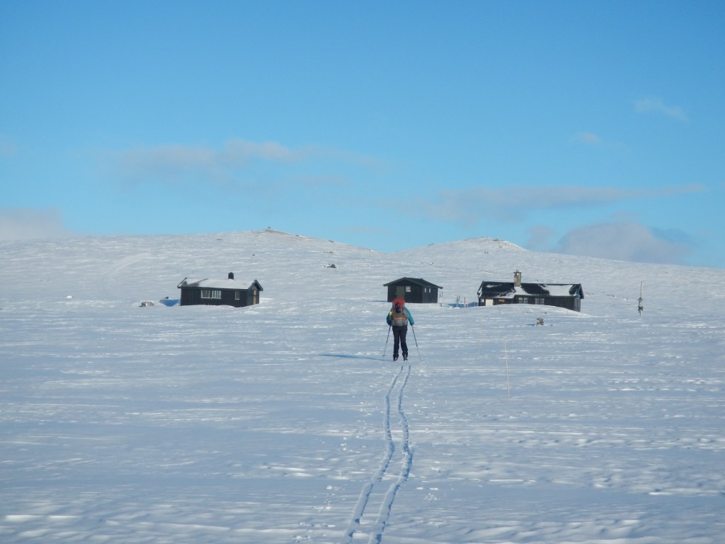 Trotz der Kälte sind wir begeistert von der unendlichen weißen Weite des Fjells. Es gibt keine Bäume, keine Sträucher, nur weiße Berge. Seit fast 20 Jahren fasziniert uns diese Landschaft. So sehr, dass wir immer wieder kommen. Von Weitem sehen wir Fondsbu, unser Tagesziel. Wie toll wäre es, jetzt locker bis dahin abzufahren. Aber nein, es gibt wieder diese blöden Sastrugi. Sie sind nur ganz langsam zu befahren. Die bewirtschaftete Hütte ist jetzt am Wochenende total voll. Im Schlafsaal bekommen wir noch eine Zweier-Koje. Zum üppigen Abendessen singt die Hüttenwirtin ein norwegisches Volkslied. Ein anstrengender Tag ist zu Ende.