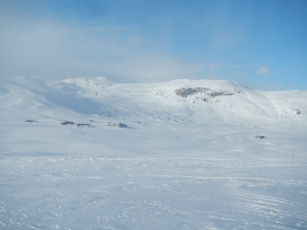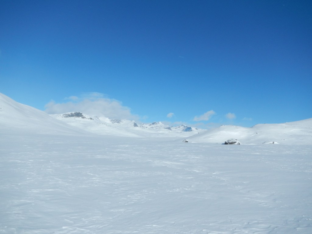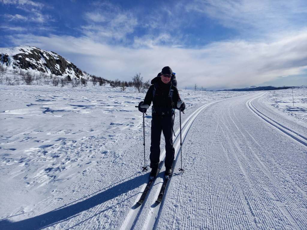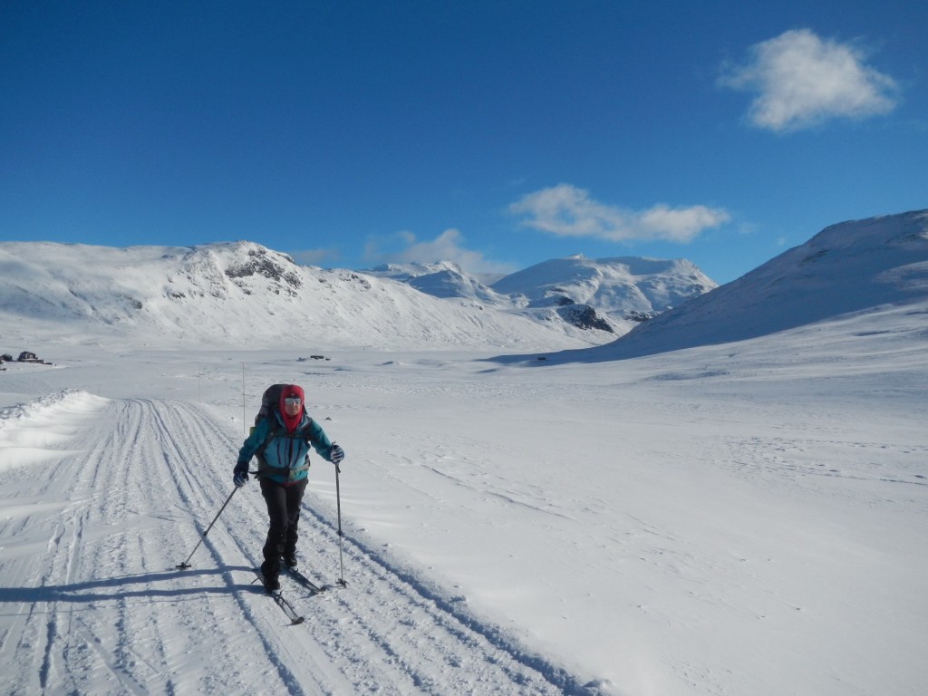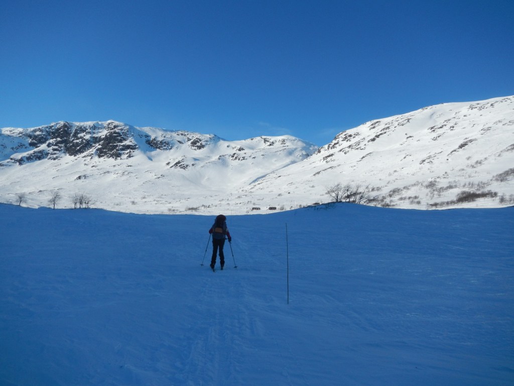 Trotz der Kälte sind wir begeistert von der unendlichen weißen Weite des Fjells. Es gibt keine Bäume, keine Sträucher, nur weiße Berge. Seit fast 20 Jahren fasziniert uns diese Landschaft. So sehr, dass wir immer wieder kommen. Von Weitem sehen wir Fondsbu, unser Tagesziel. Wie toll wäre es, jetzt locker bis dahin abzufahren. Aber nein, es gibt wieder diese blöden Sastrugi. Sie sind nur ganz langsam zu befahren. Die bewirtschaftete Hütte ist jetzt am Wochenende total voll. Im Schlafsaal bekommen wir noch eine Zweier-Koje. Zum üppigen Abendessen singt die Hüttenwirtin ein norwegisches Volkslied. Ein anstrengender Tag ist zu Ende.