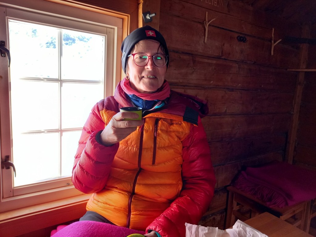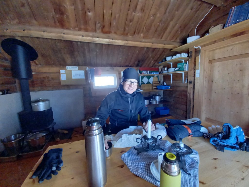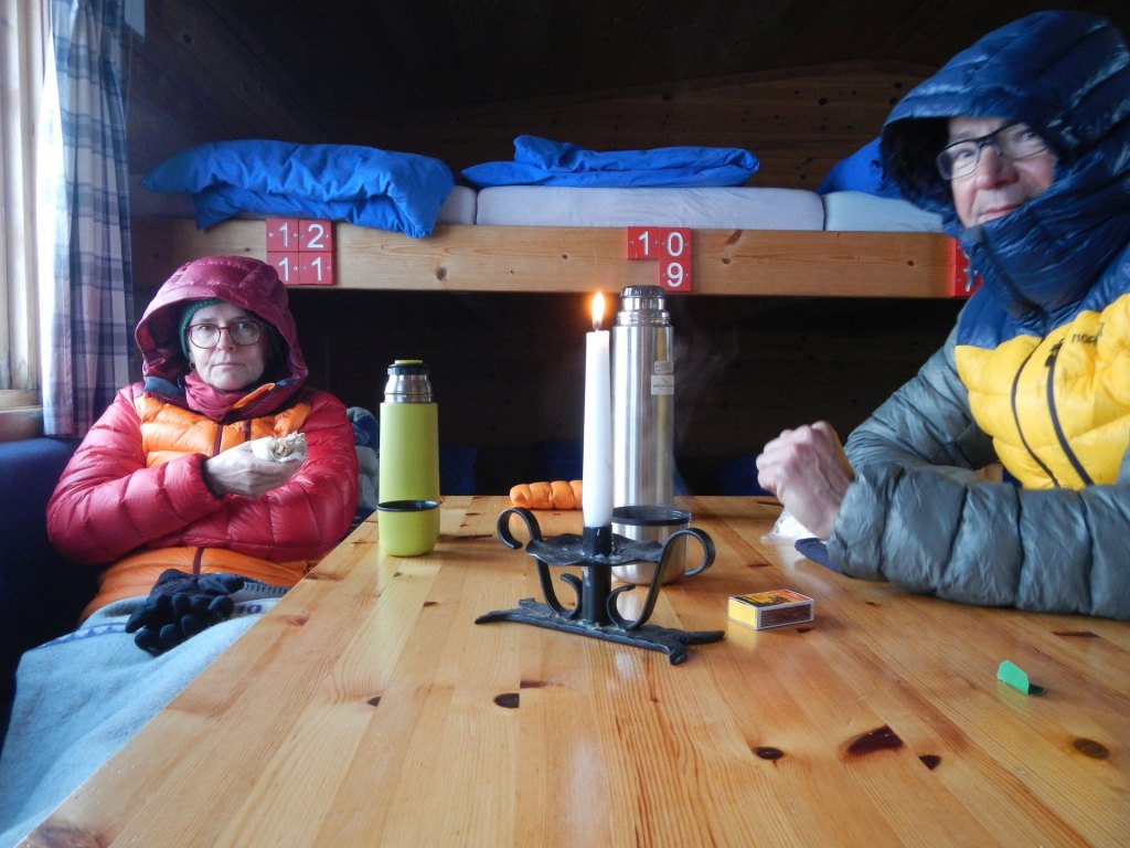 Klaus macht Feuer und wir schmelzen Schnee. Drei Norweger beziehen später die Nachbarhütte neben den Plumpsklos. Wir kochen uns Risotto aus dem Vorratsraum der Hütte und verfeinern es mit unserem mitgebrachten getrockneten Gemüse. Leider müssen wir mit unserem Topf mit Essen und all unseren ausgebreiteten Sachen in die Nachbarhütte umziehen. Eine Gruppe mit acht Personen hat angeblich die Hütte reserviert. Dass dies möglich ist, wussten wir nicht. Die Reservierungsmöglichkeit gibt es seit Corona und wurde scheinbar beibehalten. Aber nur für eine gewisse Zahl an Betten, nicht für eine komplette Hütte. Egal, wir ziehen um und verbringen einen netten Abend mit den drei Norweger*innen.