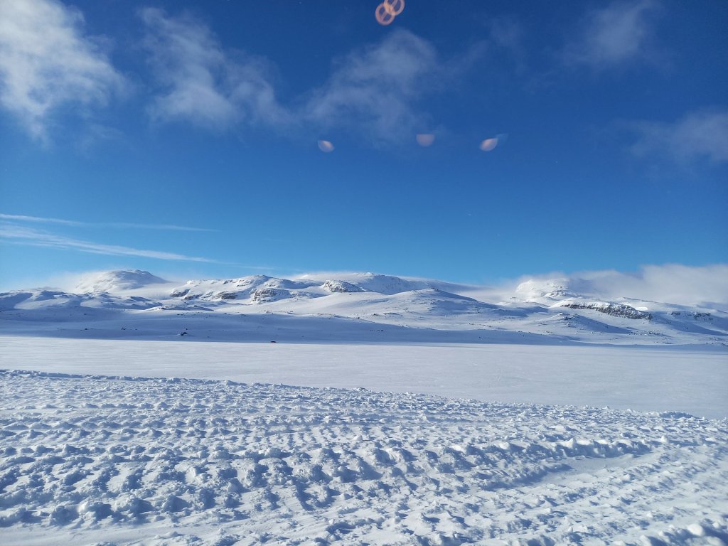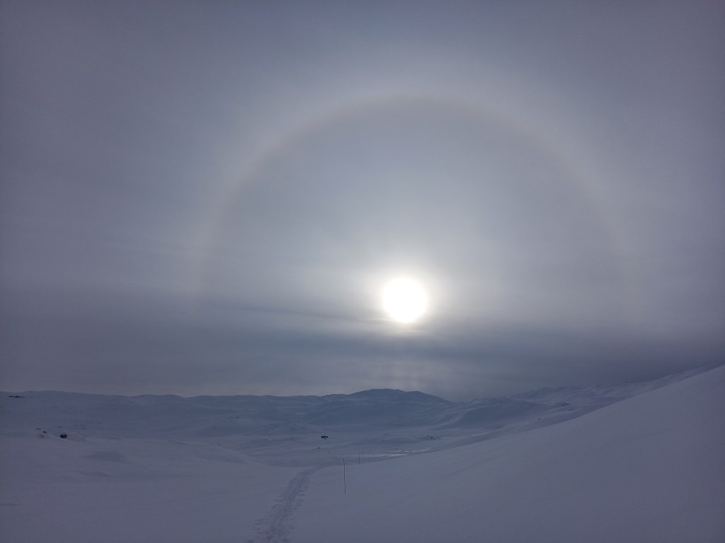 Wir queren den zugefrorenen Tyin und suchen nach dem Einstieg in die Spur auf die Berge nach Sletningsbu, unserem Ziel. Es geht steil bergauf. Wir ziehen die Felle auf. Oben empfängt uns eine grandiose Bergwelt. Wie in weiße Watte gehüllt sehen die Berge aus. Wir wandern in Richtung eines Halo-Bogens, der um die Sonne verläuft. Es ist Feuchtigkeit in der Luft und dadurch bildet sich ein kreisrunder Regenbogen um die Sonne, wie ein Heiligenschein. Plötzlich ist der Schnee verändert. Wir laufen durch tiefen Pulverschnee. Es gibt eine Spur von zwei Skiläufern, der wir folgen. Die Strecke nimmt kein Ende. Nach jedem Hügel hoffen wir, die Hütte zu sehen. Endlich: nach fast 8 Stunden und 600 Höhenmetern stehen wir vor der Hütte Sletningsbu. Ein dänisches Paar hat schon Feuer angezündet. So können wir uns direkt unser Hüttenmenü aus den Konserven im Vorratsraum kochen. Nach vier Skitagen sind wir ganz schön müde und unsere Füße schmerzen.