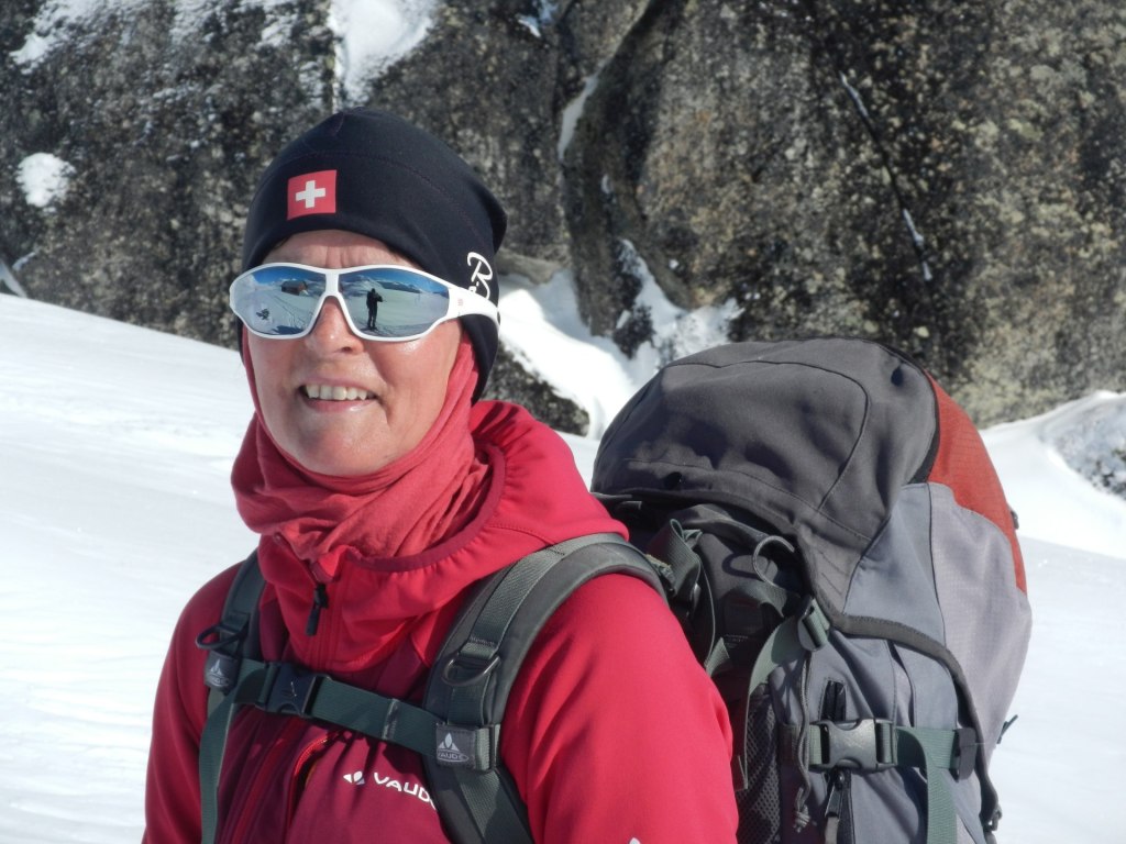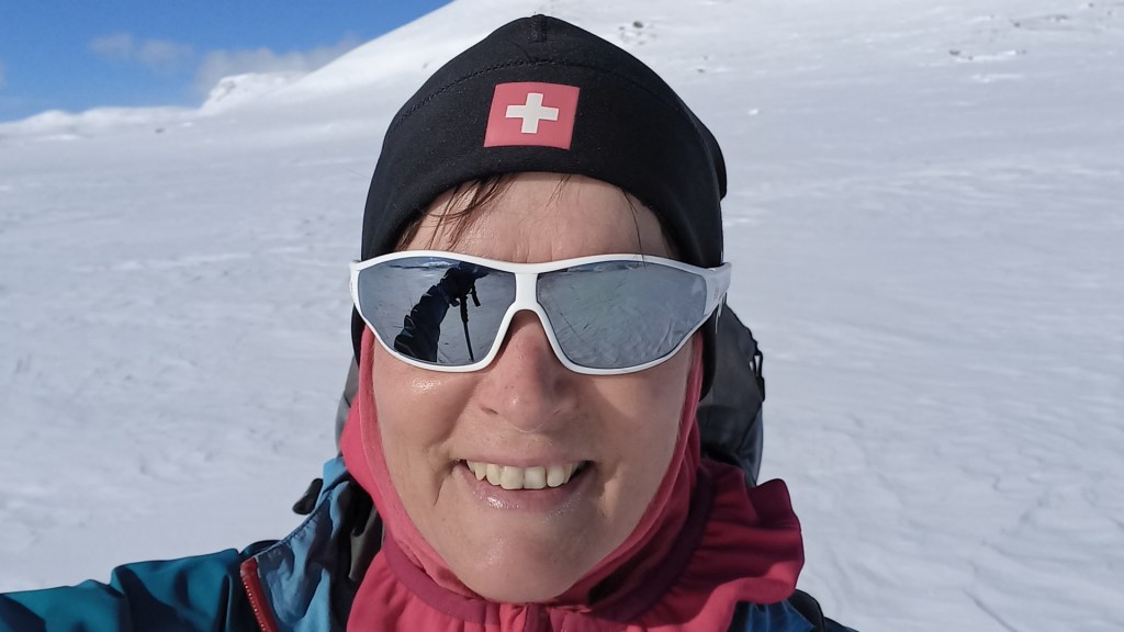 Keiner geht heute in unsere Richtung. Das können wir im Hüttenbuch nachlesen. Dort muss jede*r seinen Zielort eintragen. Es liegen stellenweise bis zu 30 cm Neuschnee. Es gibt keine Spuren im Schnee. Selbst Spuren ist angesagt. Klaus geht voran, Sabine folgt. Zuerst ist es relativ flach. Unsere Ski funktionieren hier ohne Felle. Doch dann ist vor uns ein riesiger steiler Hang. Sollen wir da etwas hinauf? Auf der Karte haben wir diesen Anstieg nicht bemerkt. Na denn! Jetzt heißt es Felle aufziehen. Die Sonne scheint und es ist fast windstill. Der Hang hat es in sich. Auch die kurzen Felle helfen da nicht viel. Wir müssen queren, umsteigen, im Grätenschritt gehen und schließlich seitwärts. Schritt für Schritt kommen wir nach oben. Sabine rutscht kurz aus und muss sich mit den Stöcken abfangen. Ein Schmerz durchzieht ihren Trizeps im Oberarm. Den hat sie sich schon gestern irgendwie gezerrt. Jetzt ist es noch schlimmer (Tage später entdeckt Sabine einen schwarzblauen Bluterguss in ihrem Ellenbogen. Da ist wohl im Trizeps etwas gerissen und der Bluterguss weiter nach unten geflossen).