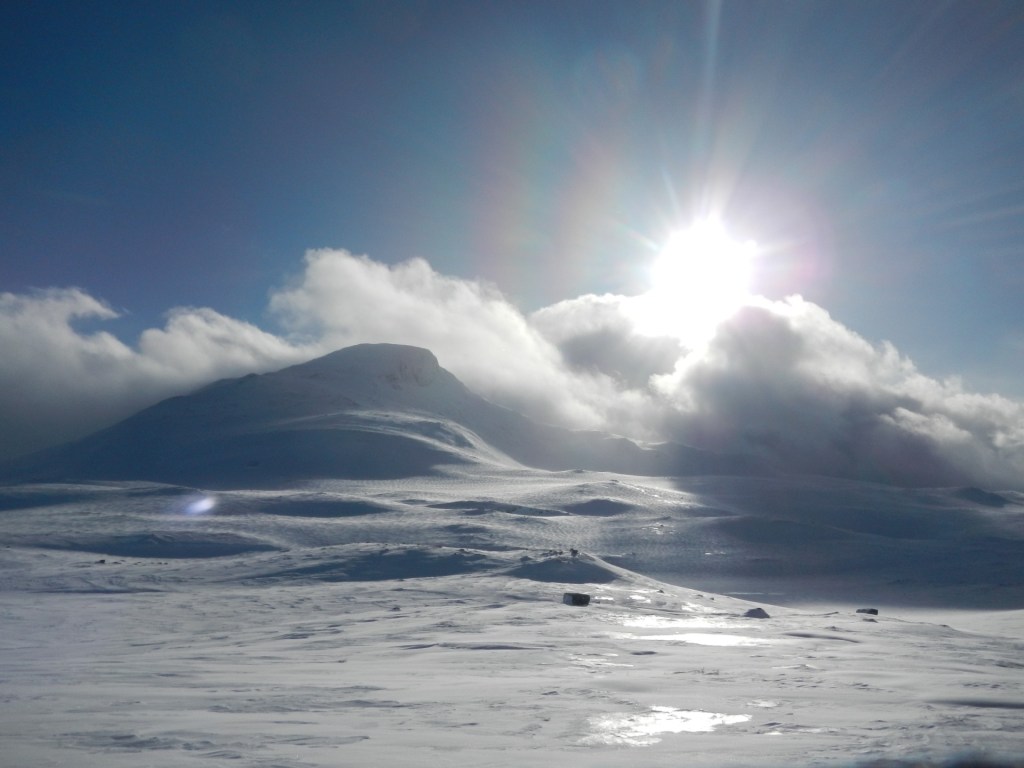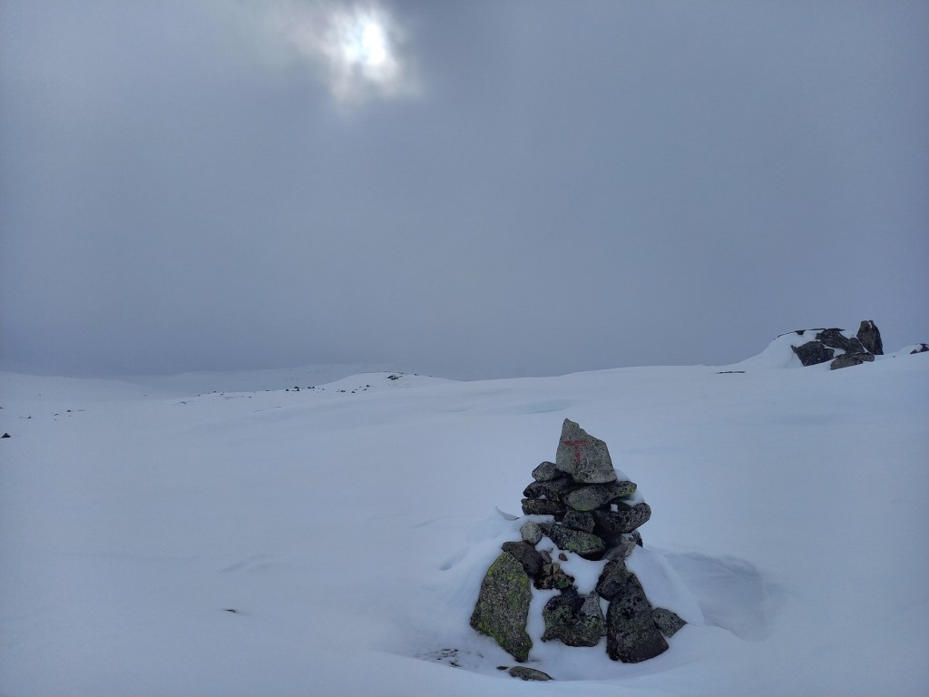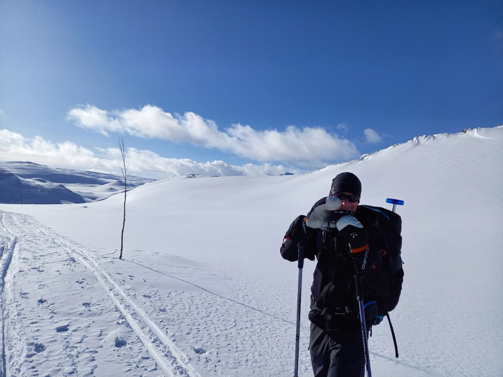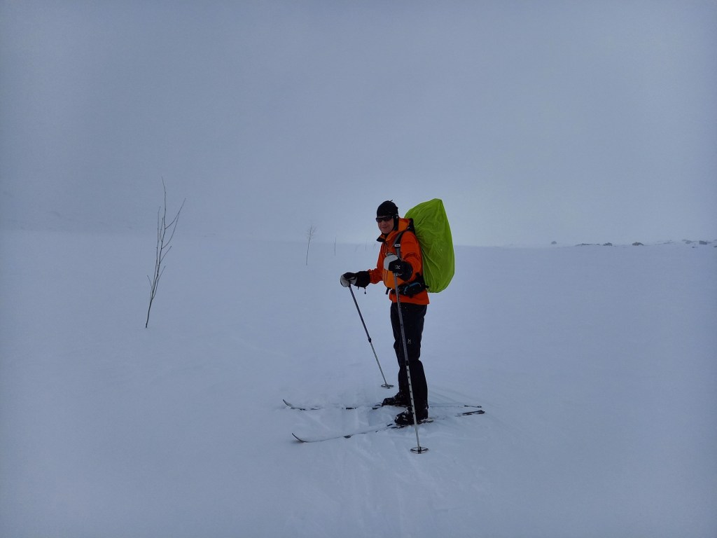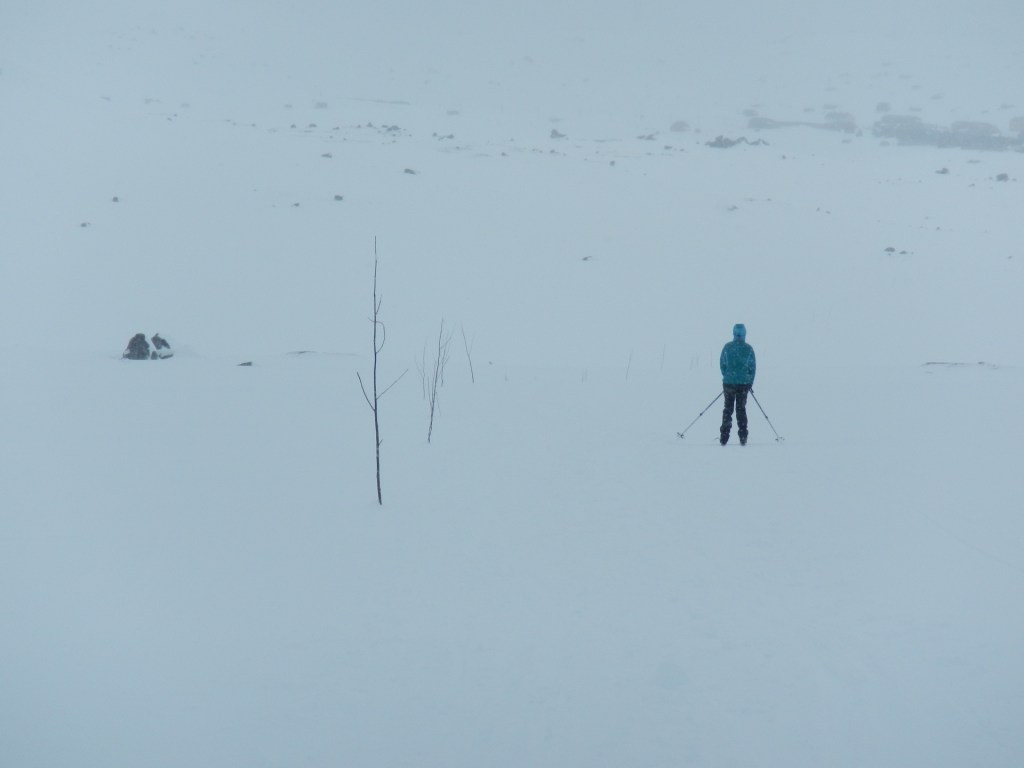 Auf der anderen Seite der Straße geht es genauso wieder hinauf. Oder schlimmer. Wir finden keine Winterspur, nur einen Hinweis auf einen Sommerweg zur Sulebu-Hütte. Er führt steil hinauf durch ein Birkenwäldchen. Klaus geht voran und spurt. Bei jedem Schritt versinken wir im Tiefschnee. Es ist total anstrengend. Wir schrecken einige Schneehühner auf. Sie fliegen schnatternd davon. Endlich sind wir oberhalb der Baumgrenze. Es geht steil weiter. Immer noch keine Kvister. Wir orientieren uns an den Steinmännchen und mittels GPS. Oben erwartet uns eine fast surreale Landschaft. Der Wind bläst den Schnee über das Fjell. Die Schneekristalle werden vom Wind aufgewirbelt und reflektieren das Sonnenlicht. Die Sonne scheint immer schwächer durch dicke Schneeflocken. Wir laufen durch einen Schneesturm. Es wird kälter. Wir versuchen den rechten Weg zu finden. Durch den umherwirbelnden Schnee ist die Landschaft in ein weiches Licht getaucht. Über sieben Stunden sind wir schon unterwegs. Endlich sehen wir die Hütte. Ein Refugium inmitten der Naturgewalten. Wir richten uns in der kleinen Nachbarhütte ein. Die Haupthütte ist schon voll belegt. Es dauert lange bis die Innentemperatur von minus zwei Grad auf eine angenehme Wärme aufgeheizt ist. Die beiden Dänen, die wie wir von Sletningsbu kommen, freuen sich. Als sie eineinhalb Stunden später ankommen, ist es schön warm.