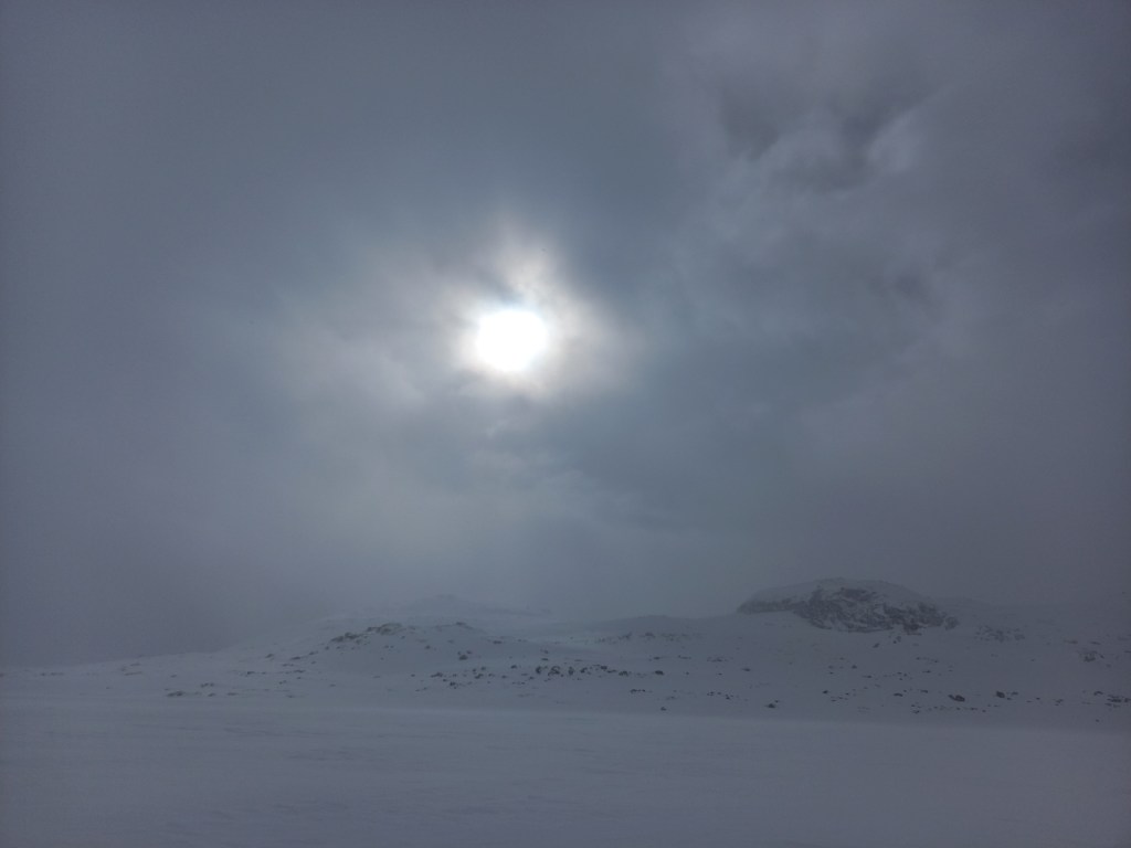 Es schneit. Und es ist extrem windig. Die Umgebung ist kaum zu erkennen. Gehen wir weiter? Oder bleiben wir einen Tag in Sletningsbu? Die Hütte ist gemütlich und wir sind mit den beiden Dänen nur zu viert. Zwei Reservetage haben wir. Das Wetter soll ab morgen wieder besser werden. Also bleiben wir. Was tut man den ganzen Tag in der Hütte? Es gibt keinen Strom, kein Wasser…und natürlich auch keinen Mobilfunkempfang. Wir lesen, essen, lesen…