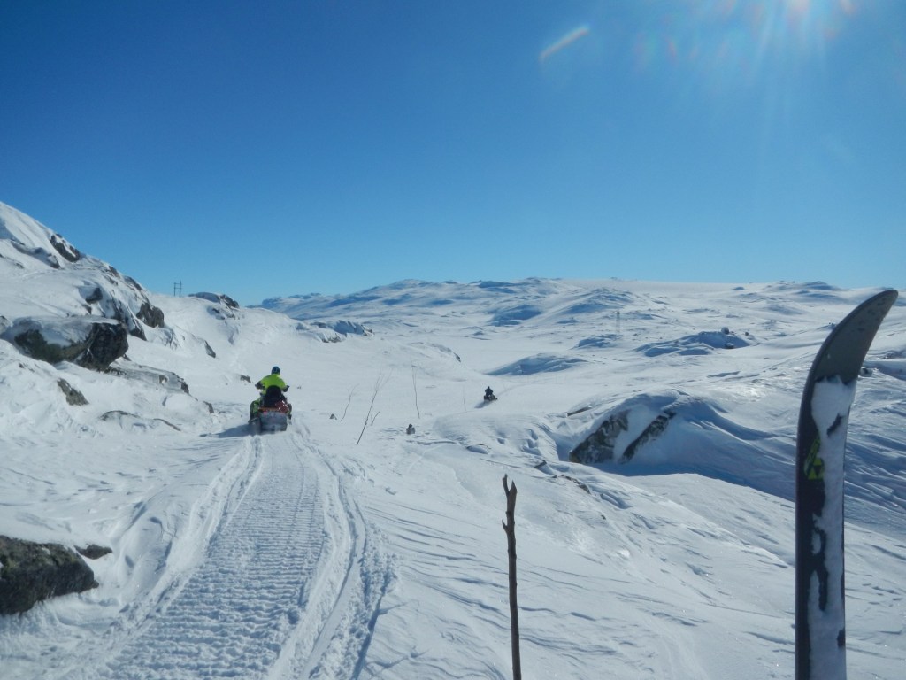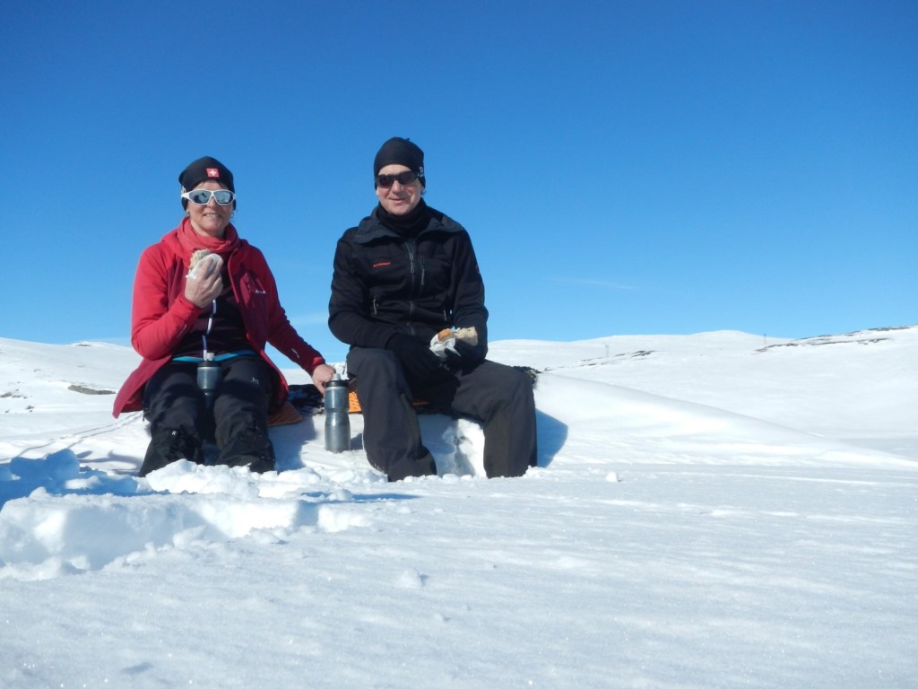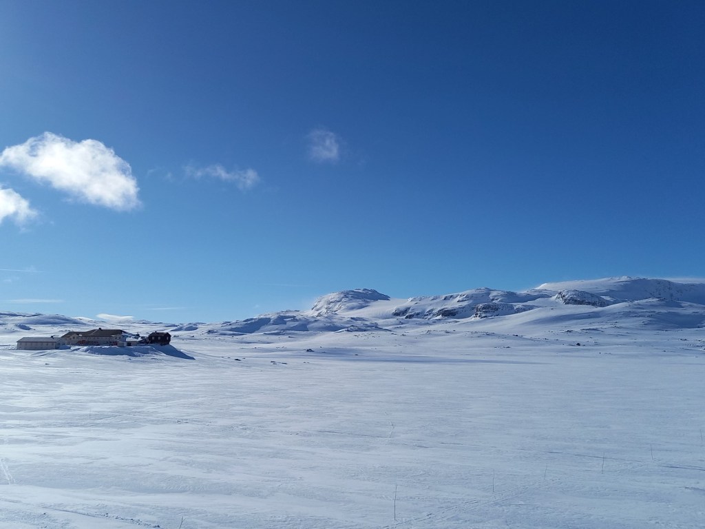 Hier waren wir gestern schon? Bei schönem Wetter sieht alles ganz anders aus. Keine einzige Wolke zeigt sich am Himmel. Der Schnee ist wieder pulvrig. Und es ist windstill und warm. Scooter haben uns eine gute Spur gemacht. Auf halber Strecke kommen sie wieder zurück und halten bei uns an. Sie waren an der Stelle, an der die Lawine die Bahnstrecke behindert. Mit Dynamit haben sie versucht, den Schnee weg zu sprengen. Ob die Bahn bald wieder fährt, können sie nicht sagen. Uns wünschen sie einen wunderschönen Tag. Wir sollen das tolle Wetter genießen. Das tun wir. Sogar eine Pause ist heute drin. Die erste auf der gesamten Tour. Wir sitzen in der Sonne und essen unsere Brote. Sabine läuft zeitweise sogar ohne Handschuhe. Klaus braucht endlich keine Handwärmer mehr. Ein Zimmer in der Finsehytta haben wir schon reserviert. Wir hatten Glück, sie ist ausgebucht, aber nicht alle konnten anreisen. Für uns gut, dass die Bergensbahn nicht fährt. Zum Wochenende gibt es zum Dinner ein üppiges Büffet. Ein Tag voller Luxus.