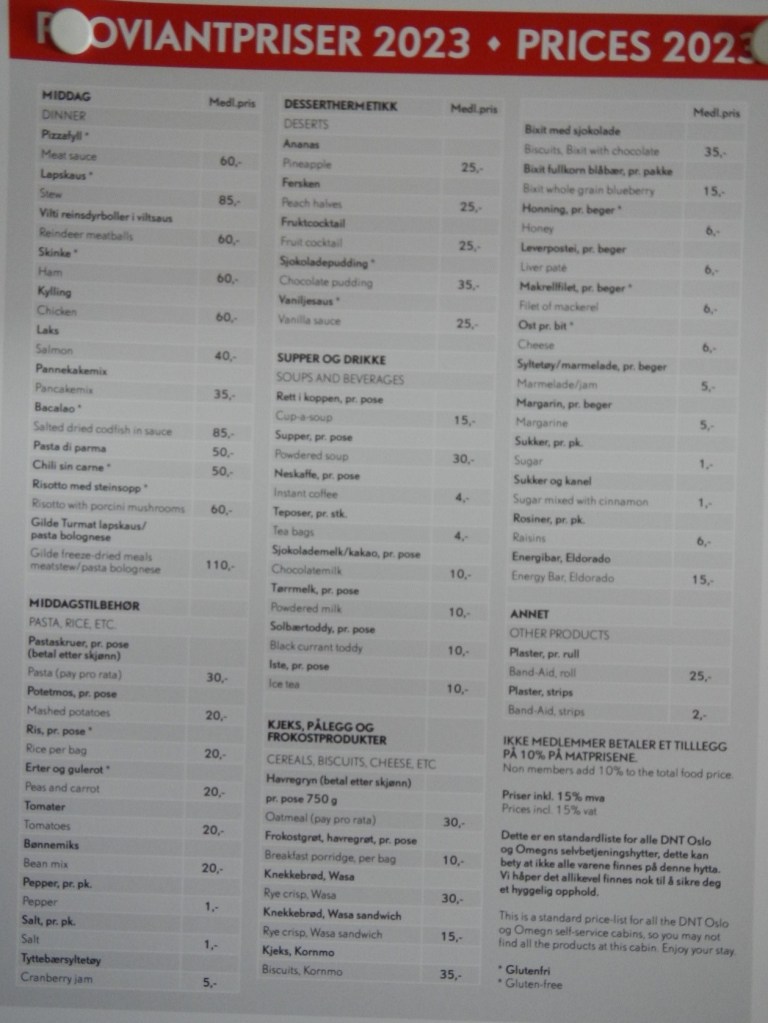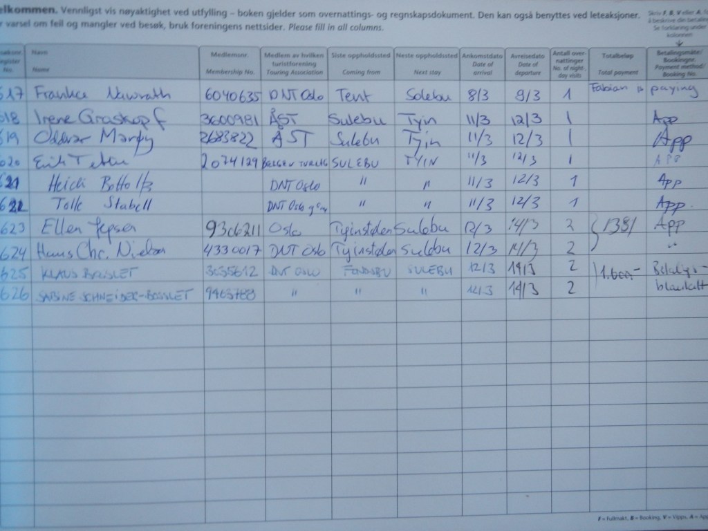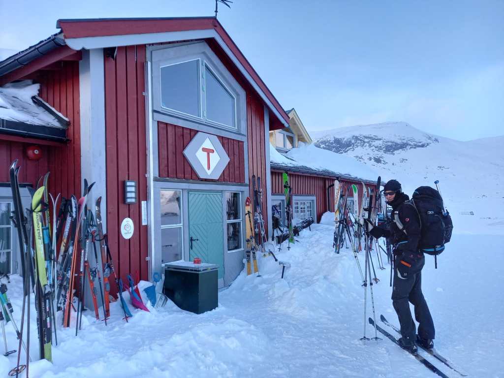 Sabine findet Zeit, das Hüttenleben in Norwegen mal genauer zu beschreiben. Also von Anfang an. Wir melden uns beim DNT als Mitglieder an. So bezahlen wir weniger und erhalten den DNT-Nøkkel, den Generalschlüssel. Der DNT unterhält 550 Hütten im ganzen Land. Die meisten im Fjell, einige am Meer. Davon sind 44 bewirtschaftet (norw. betjent), 174 selbstbewirtschaftet (selvbetjent), 268 unbewirtschaftet (ubetjent) und 58 Tagestourhütten oder Nothütten. Die unbewirtschafteten kommen für uns nicht infrage, da wir kein Essen für zwei Wochen schleppen können. In den selbstbewirtschafteten gibt es immer das gleiche Sortiment an Proviant: Konserven, Suppen, Kekse, Hafergrütze, Knäckebrot, Marmeladen, Tee… Im Winter werden die Vorräte mit dem Snowscooter vorbeigebracht. Alle Hütten sind untereinander durch Sommer- oder Winterwege verbunden. Die Wege werden auf Karten im Internet jedes Jahr aktualisiert. Die Sommerwege sind mit Hilfe von großen Steinmännchen mit einem roten T markiert. Im Spätwinter bis nach Ostern sind die Winterwege mit Kvistern (Markern) aus Bambus oder Birkenzweigen abgesteckt. Sie sind in dieser Zeit auch bei dichtem Nebel zu finden.