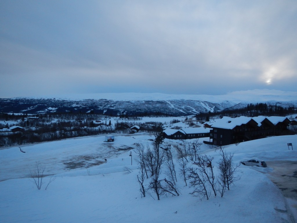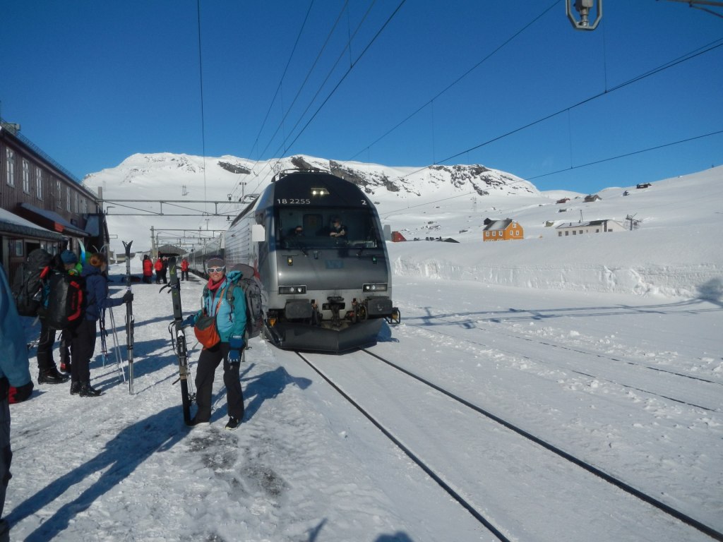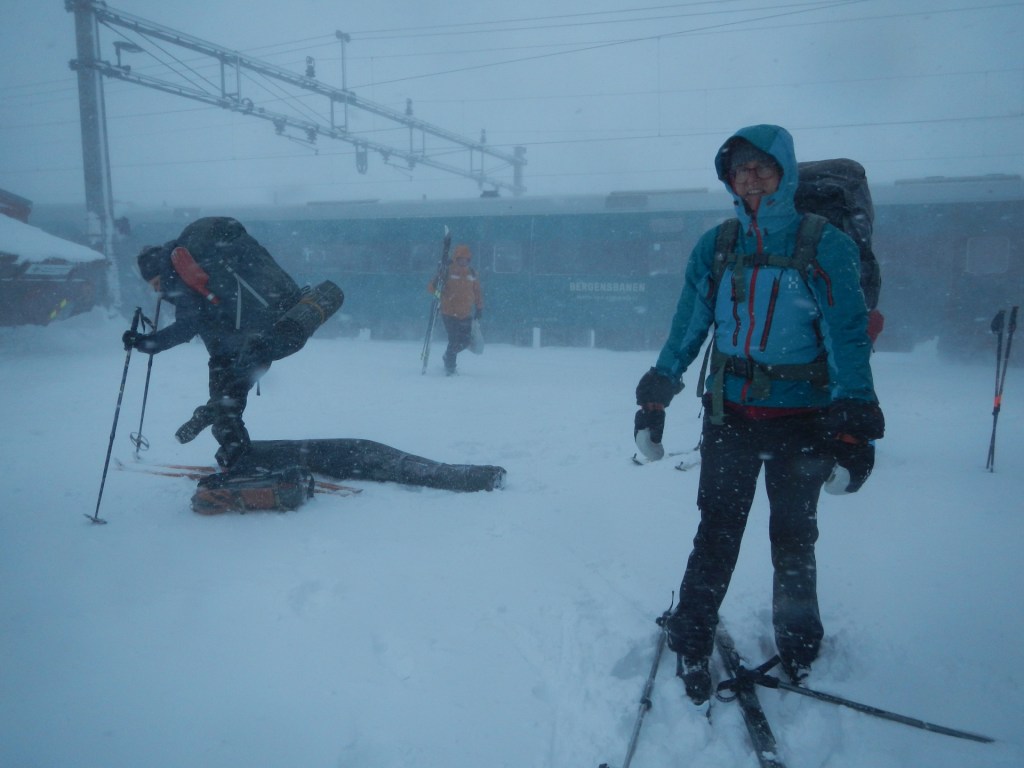 Wir müssen umplanen. Der Wetterbericht verheißt nichts Gutes. Ab Mittag soll es Sturm geben mit mehr als 100 km/h. Wenn wir die 600hm zur Bjordalsbu-Hütte hochlaufen, haben wir den Wind frontal gegen uns. Oben sind wir in exponierter Lage dem Wind total ausgeliefert. Dazu kommen noch eine Schnee- und Lawinenwarnung. So gerne wir unsere Tour fortsetzten würden, die Vernunft siegt. Wir warten in der Hütte auf den Bus nach Gol. Von dort kommen wir mit dem Zug nach Finse. Inzwischen kommen auch die drei Briten zurück. Sie wollten nach Sulebu, mit dem Wind. Doch Johns Bindungen seiner Tourenski sind beide gebrochen. Sie können nicht weiter. Sie informieren sich im Internet (gut, dass es das hier gibt), wie sie irgendwie nach Tyinkrysset kommen. Dort können sie die Ski reparieren lassen. Zuerst versuchen sie es mit Trampen. Keiner hält an. Wir bedauern sie, wie sie da an der Straße stehen. Es stürmt und es ist eiskalt. Sie kommen zurück und wollen später einen Bus in den nächsten Ort nehmen.