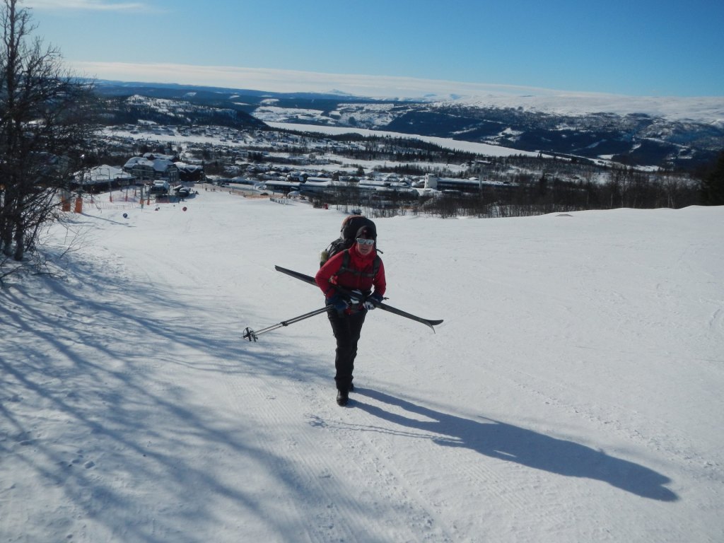 Endlich oben. Belohnt werden wir mit dem schönsten Blick bisher. Hinter uns die Berge von Jotunheimen, vor uns Skarvheimen und dazwischen riesige Flächen in Weiß. Es ist- das mag wohl etwas kitschig klingen- ein erhabener Anblick. Wir sind richtig gerührt von der Schönheit der Landschaft. Und so geht es den ganzen Tag weiter. Die Abfahrten im Tiefschnee sind sanft und gut zu fahren. Die Felle werden abgeschnallt. Kurz vor Ende unserer 25 km langen Strecke kommt dann doch noch ein Berg. Also Felle wieder drauf. Der letzte Berg ist geschafft. Wir fahren ab bis zur neuen Hütte Skarvheimen. Sie liegt an einer Straße und hat Strom, fließendes Wasser, Innentoilette und eine Dusche!!! Luxus nach einigen Tagen ohne Waschen. Es ist ein norwegisches Sommerhaus, das der DNT gekauft hat, um hier eine Übernachtungsmöglichkeit anzubieten. Bis zur nächsten Hütte sind es noch 15 km und 600hm.