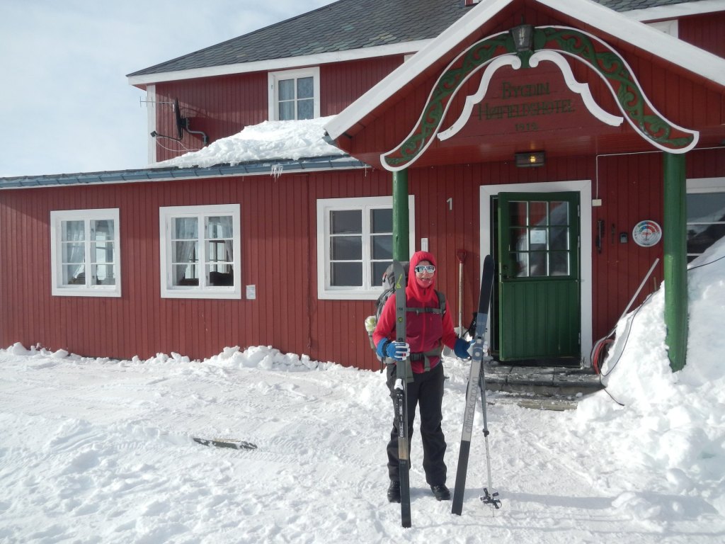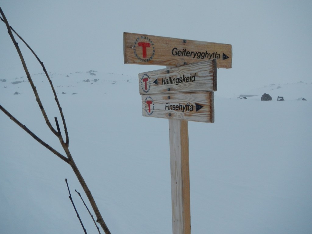 Wir brechen trotz schlechtem Wetter auf. Bis Hallingskeid haben wir den Wind im Rücken. Es geht. Zwischendurch blinzelt sogar die Sonne durch die Wolken. Am Ende wird es ungemütlich. Es schneit in dicken nassen Flocken. Es ist über Null Grad. Fast 25 Grad wärmer als gestern. Die Sicht wird immer schlechter. Es ist schwierig abzufahren. Völlig durchnässt kommen wir in Hallingskeid an. Unsere weitere neu geplante Tour können wir vergessen. Morgen ist schönes Wetter angesagt. Doch danach kommt wieder Schnee mit Gegenwind. Die Bahn nach Finse fährt nicht mehr. Eine Lawine hat die Spur verschüttet. So müssen wir morgen den gleichen Weg wieder zurück. Hoffentlich bei Sonnenschein. Den zweitägigen Umweg über die Geiterygghytta gehen wir nicht. Übermorgen ist wieder ganz schlechtes Wetter vorhergesagt.