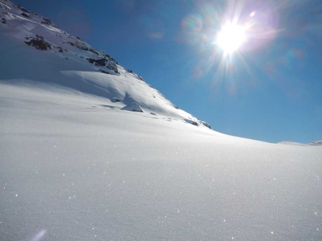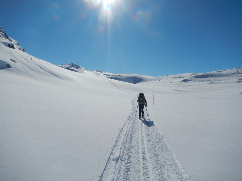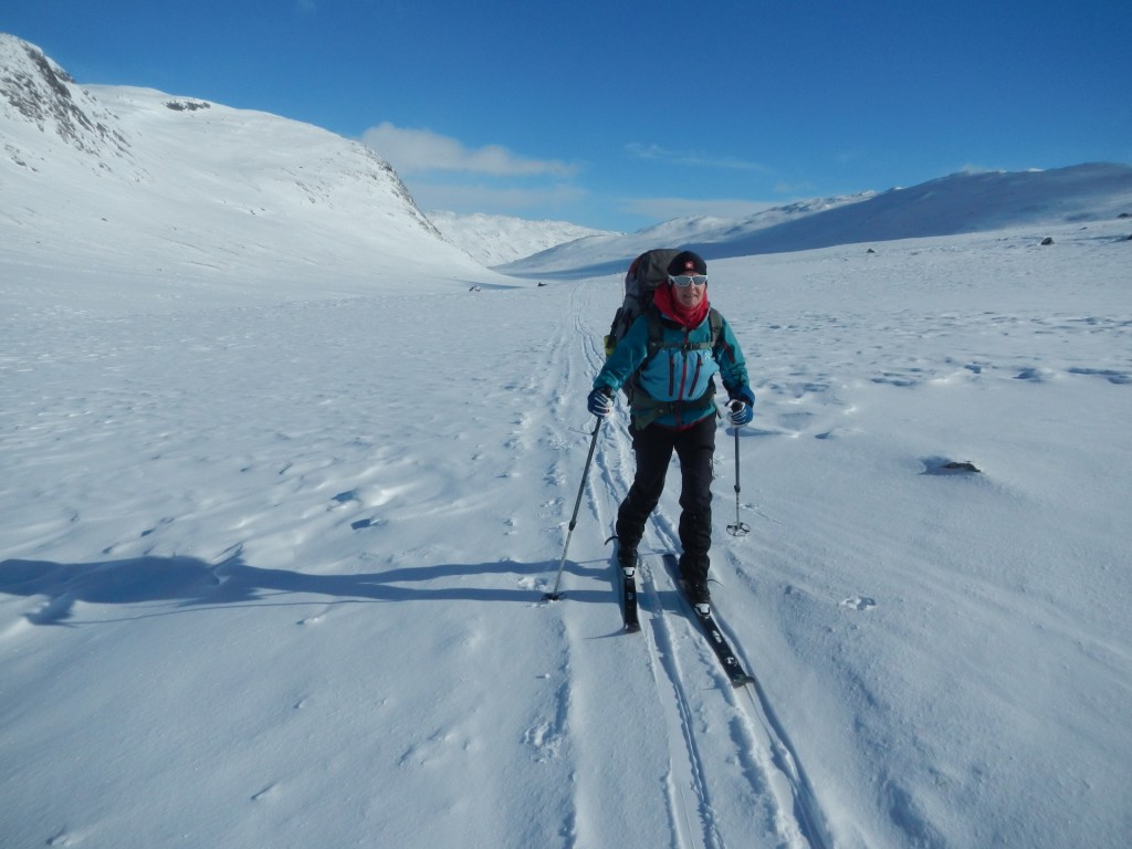 Wir starten bei Sonnenschein und wenig Wind. Wir sind begeistert: Traumwetter, Traumschnee und Traumlandschaft. Feiner Pulverschnee bedeckt die Berge. Wir kommen gut voran. Die Schönheit der Landschaft lässt sich nur schwer in Worte fassen. Unendliche weiße Weite: die Berge sehen durch den Neuschnee aus, als wären sie in Watte gepackt. Wir machen einige Fotostopps. Es ist gar nicht mehr so eiskalt. Alles passt. Wir staunen und genießen. Eine lange Abfahrt bis zu einer Straße liegt vor uns. Im Neuschnee ist sie anfangs kein Problem. Wir können unsere Langlaufski einfach laufen lassen. Dann wird es steiler und der Schnee tiefer. Wer schon mal auf Langlaufskiern gestanden hat, kann sicher nachvollziehen, dass eine steile Abfahrt in bis zu 50 cm Tiefschnee sehr schwierig ist. Unsere Fjellski sind nicht wie Tourenski hinten feststellbar. Wir versuchen zu queren. Queren und Umtreten. Stück für Stück. Die Ski sind im Tiefschnee nicht mehr zu sehen. Es dauert lange bis wir endlich unten sind.