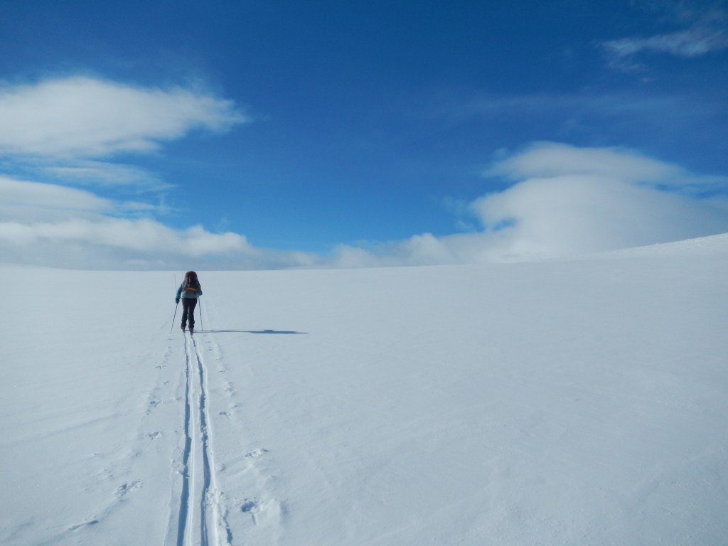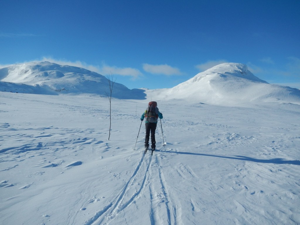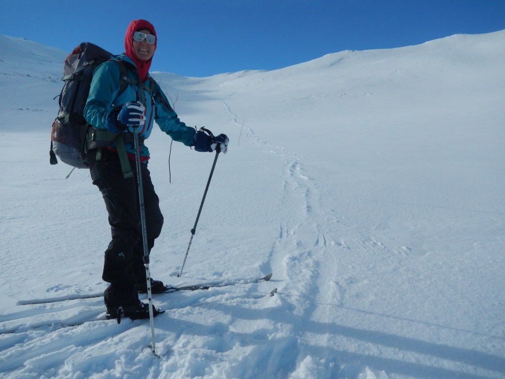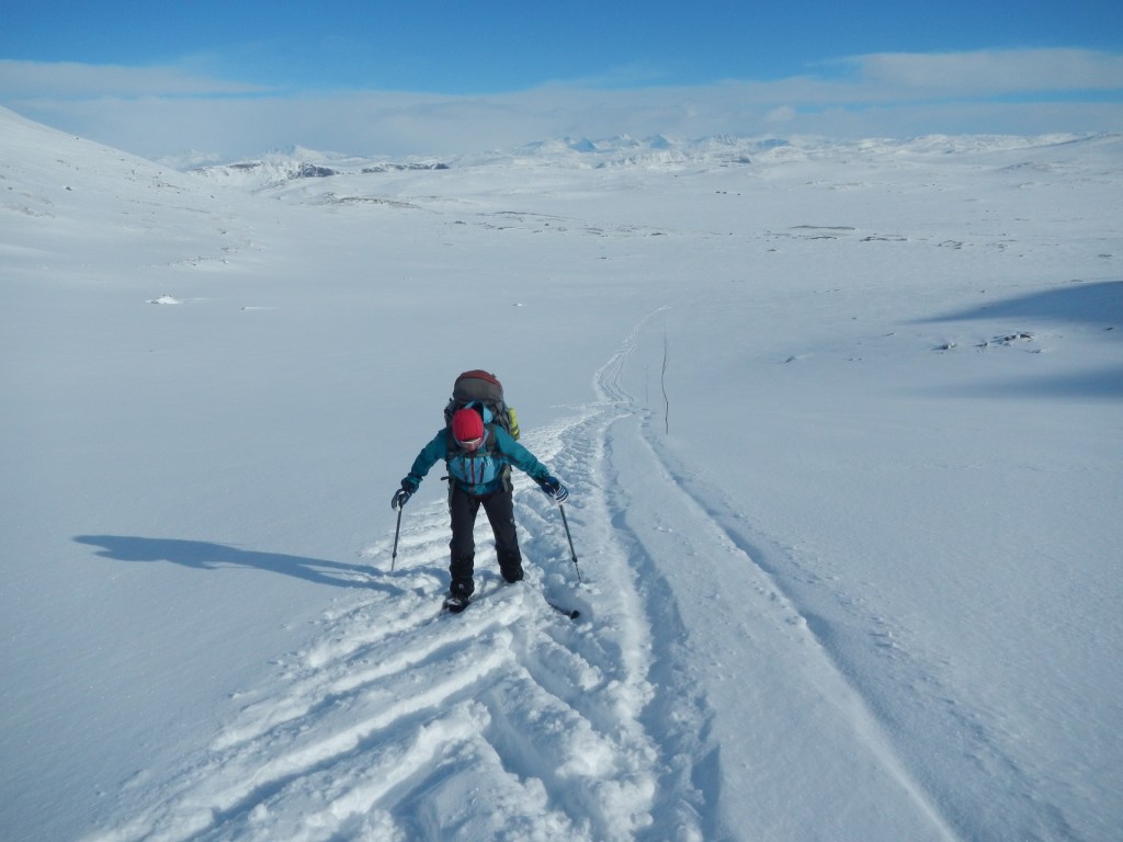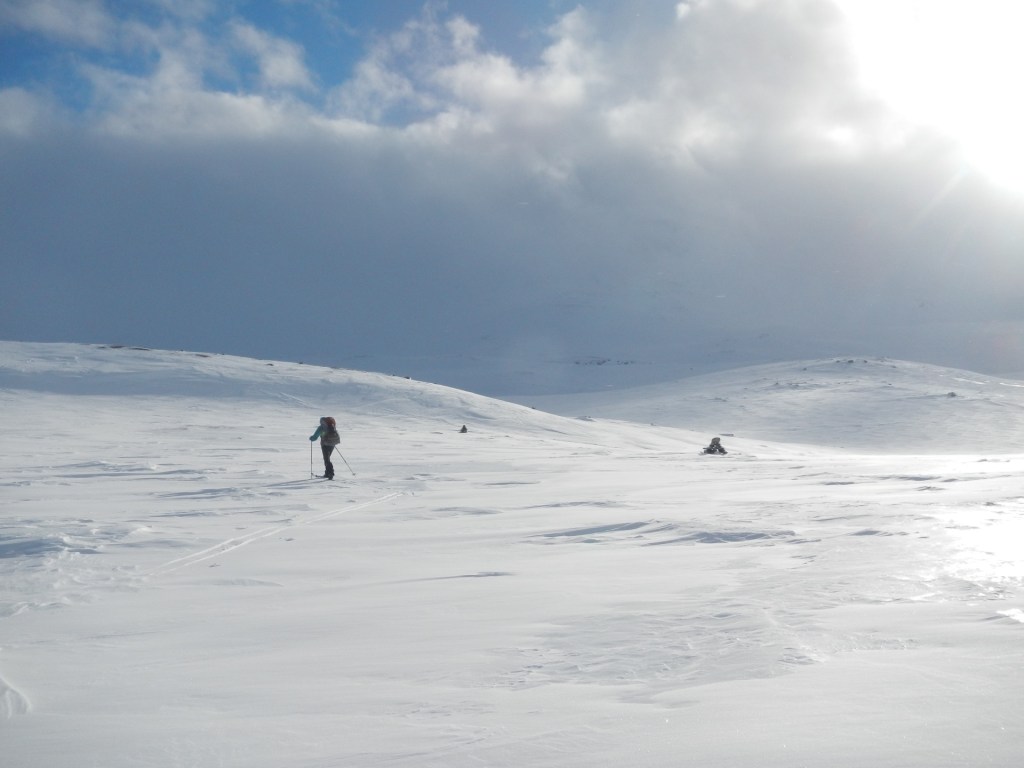 Der Schnee ist hart gefroren. Der Wind hat lange stromlinienförmige Erhöhungen gebildet, sogenannte Sastrugi. Sie müssen jedes Mal über- oder umfahren werden. Auch ein Snowscooter kann sie nicht plattfahren, so fest gefroren sind sie. Wir rutschen auf jedem der kleinen Hügel zur Seite weg. Mit Langlauf hat das nichts mehr zu tun. Gleiten ist nicht. Die Füße leiden und die Arme müssen jeden Rutscher abfangen. Aber die Sonne scheint und der Wind ist zu Anfang der Tour kaum zu spüren. Abfahren ist mit den norwegischen Langlaufskiern, Fjellski genannt, auf diesen eisigen Buckeln kaum möglich. Sabine schnallt bei sehr steilen Passagen lieber ab und geht zu Fuß. Schade um die Abfahrt. Bei gutem Schnee wäre sie toll, doch Sicherheit geht vor. Sabine leidet seit Wochen unter einer Sehnenreizung im Vorderfuß. Sie will den Fuß nicht zu sehr belasten.