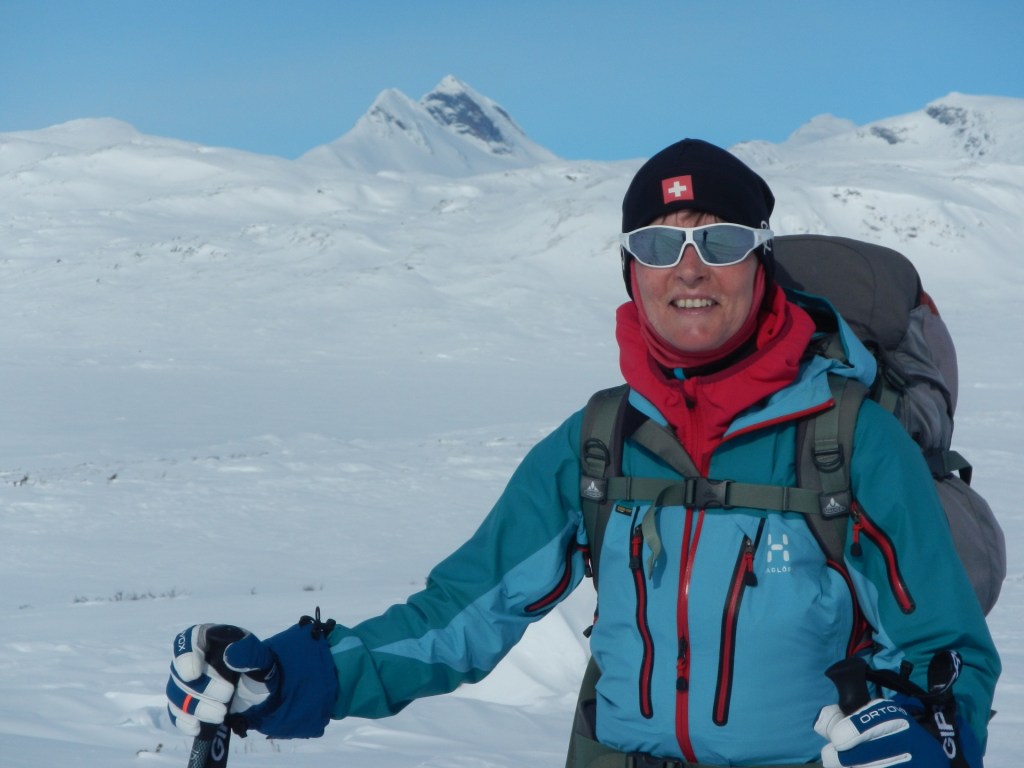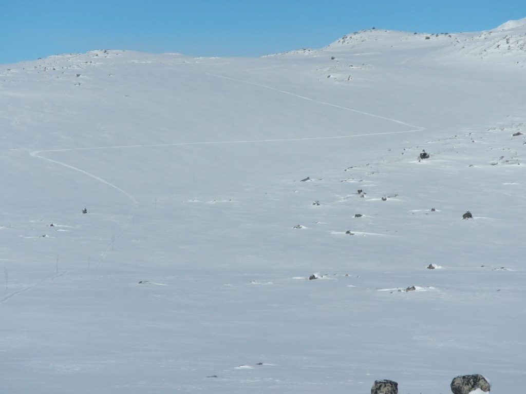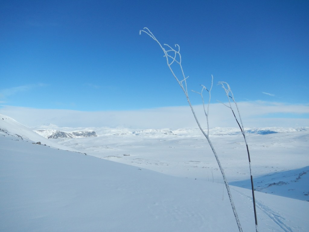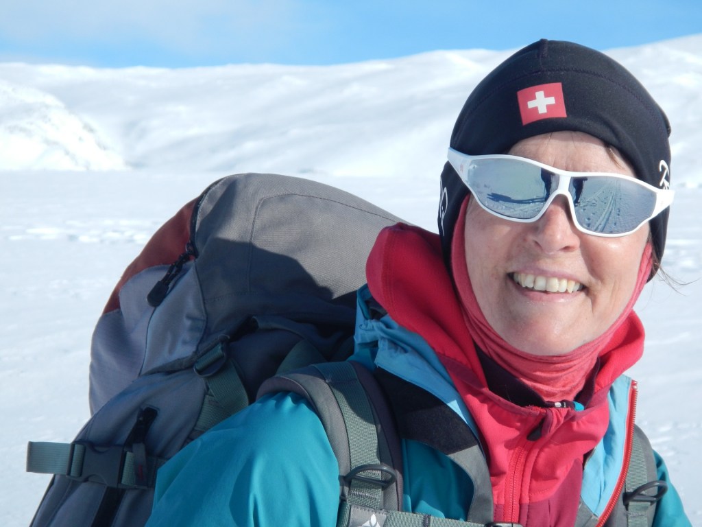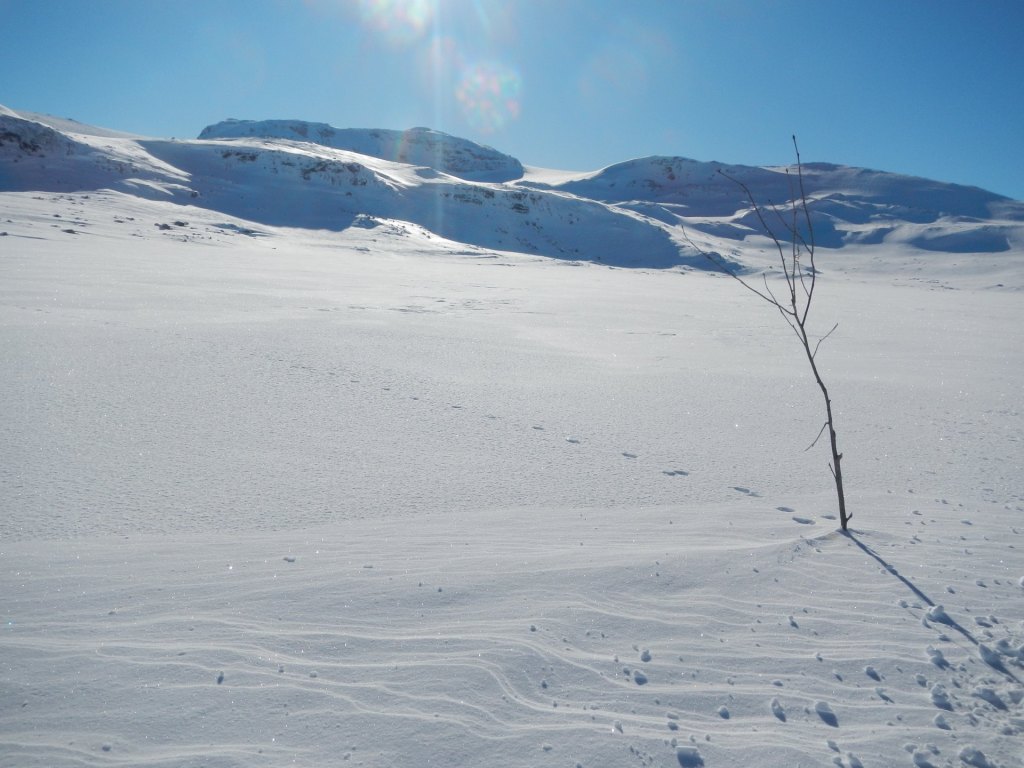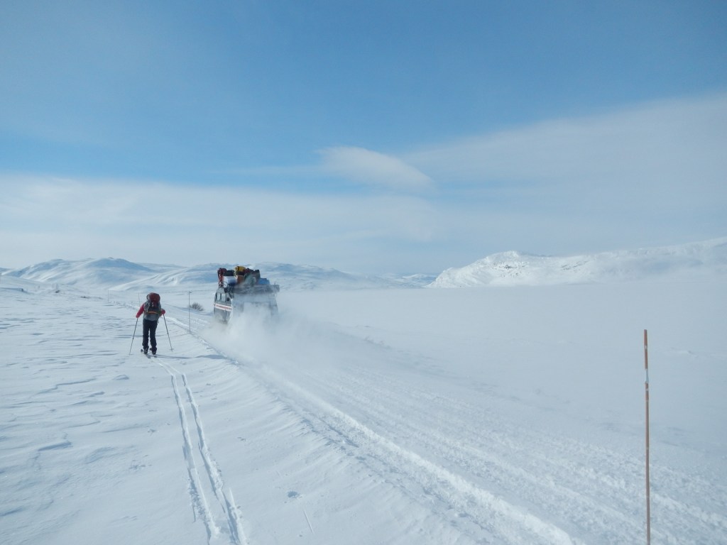 Der Schnee ist hart gefroren. Der Wind hat lange stromlinienförmige Erhöhungen gebildet, sogenannte Sastrugi. Sie müssen jedes Mal über- oder umfahren werden. Auch ein Snowscooter kann sie nicht plattfahren, so fest gefroren sind sie. Wir rutschen auf jedem der kleinen Hügel zur Seite weg. Mit Langlauf hat das nichts mehr zu tun. Gleiten ist nicht. Die Füße leiden und die Arme müssen jeden Rutscher abfangen. Aber die Sonne scheint und der Wind ist zu Anfang der Tour kaum zu spüren. Abfahren ist mit den norwegischen Langlaufskiern, Fjellski genannt, auf diesen eisigen Buckeln kaum möglich. Sabine schnallt bei sehr steilen Passagen lieber ab und geht zu Fuß. Schade um die Abfahrt. Bei gutem Schnee wäre sie toll, doch Sicherheit geht vor. Sabine leidet seit Wochen unter einer Sehnenreizung im Vorderfuß. Sie will den Fuß nicht zu sehr belasten.