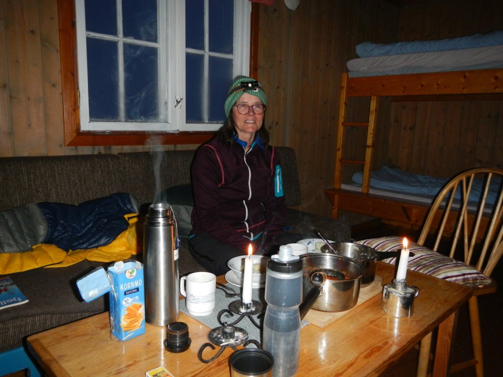 Drei nette Briten und zwei Deutsche begrüßen uns. Auch ein Dreibettzimmer ist noch frei. Es ist ein netter Abend. Bis gegen 21 Uhr fünf junge Norwegerinnen auftauchen. Sie sind mit dem Bus angereist. Und sie bestehen etwas unfreundlich darauf, in unserem Raum zu schlafen. Sie hätten schließlich vorgebucht. Nach DNT-Richtlinien gilt eine Reservierung nur bis 19 Uhr. Dies akzeptieren sie nicht. Wir haben keine Lust mehr auf Diskussionen, räumen das Zimmer und schlafen im Wohnzimmer. Geht auch! Und beim Fenster öffnen zum Lüften sehen wir dann noch Nordlichter!