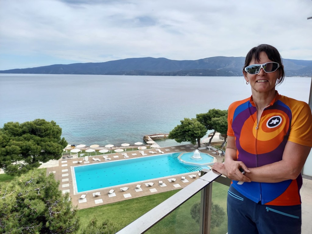 Wir fahren los. Der Rückenwind ist das erste Geschenk. Klaus freut sich auch. Die Strecke ist ähnlich wie gestern. Immer am Meer entlang. Vor Korinthos biegen wir ab. Über kleine Nebenstraßen fahren wir auf die andere Seite an das ägäische Meer. Morgen wollen wir uns den alten Verbindungskanal zwischen Golf von Korinth und Ägäis ansehen. Jetzt geht es in Richtung Hotel. Glücklicherweise knurren uns die Straßenhunde nur kurz hinterher und lassen uns fahren. Die kann Sabine an ihrem Geburtstag nun gar nicht gebrauchen. Aber ein Hotel ist gerade recht. Das Zimmer hat einen grandiosen Ausblick aufs Meer. Und das lädt zum Baden ein. Sabine traut sich rein, Klaus dann auch. Brrr ist das kalt, mehr als 15 Grad sind es sicher nicht. Doch Sabine musste 60 Jahre (!) warten, bis sie an ihrem Geburtstag mal im Meer baden kann. Da ist es ganz egal wie kalt es ist.