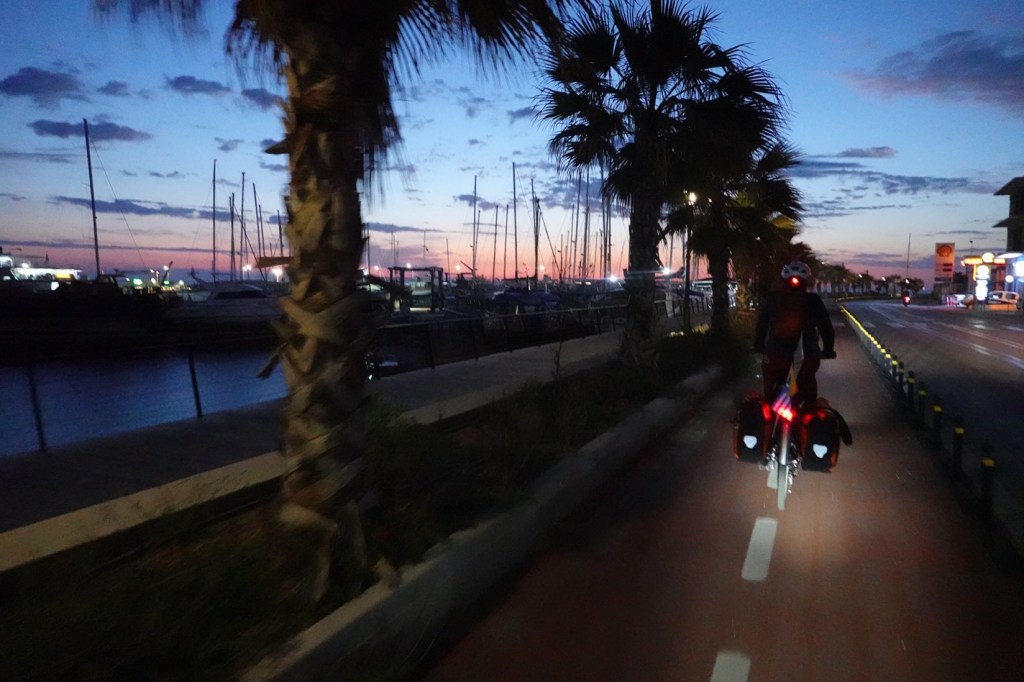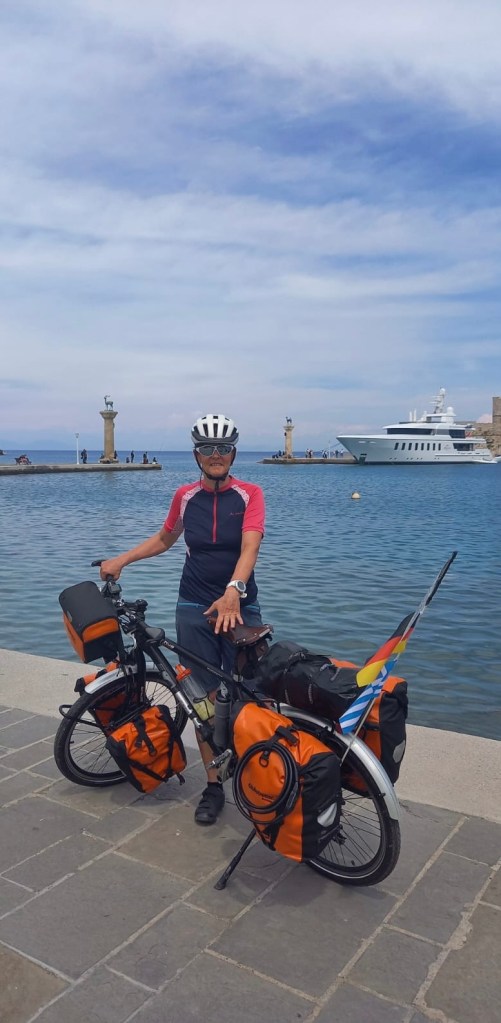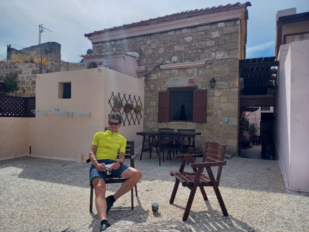 Heute fahren wir nach Rhodos Stadt. Der Streckenverlauf ist sehr unterschiedlich. Der erste Teil ist am schönsten. Wir fahren durch die Berge. Es geht dauernd auf und ab. Am Akramitis vorbei. Durch Wälder und immer mit Blick aufs Meer. Der zweite Teil führt am Meer entlang. Durch das nicht touristische Rhodos. Es gibt kleine Orte ohne Hotels. Dafür Gewächshäuser bis ans Meer und endlose Kiesstrände. Im dritten Teil fahren wir mit wenig Verkehr direkt an einsamen Stränden und Ausläufern der Berge vorbei. Ziegen springen von der Straße in die Büsche. Leider kommt 30 km vor Rhodos-Stadt der unschöne letzte Abschnitt. Der Verkehr wird immer heftiger. Die Hotelburgen größer und höher. „Wer macht hier Urlaub?“ fragt Sabine. Unschöne bis zu zehngeschossige Hotelburgen, durch die laute Hauptstraße vom Meer getrennt, lassen Pauschalurlaubsherzen höher schlagen? Wir übernachten mitten in der Altstadt. Sie gehört zum UNESCO-Welterbe.